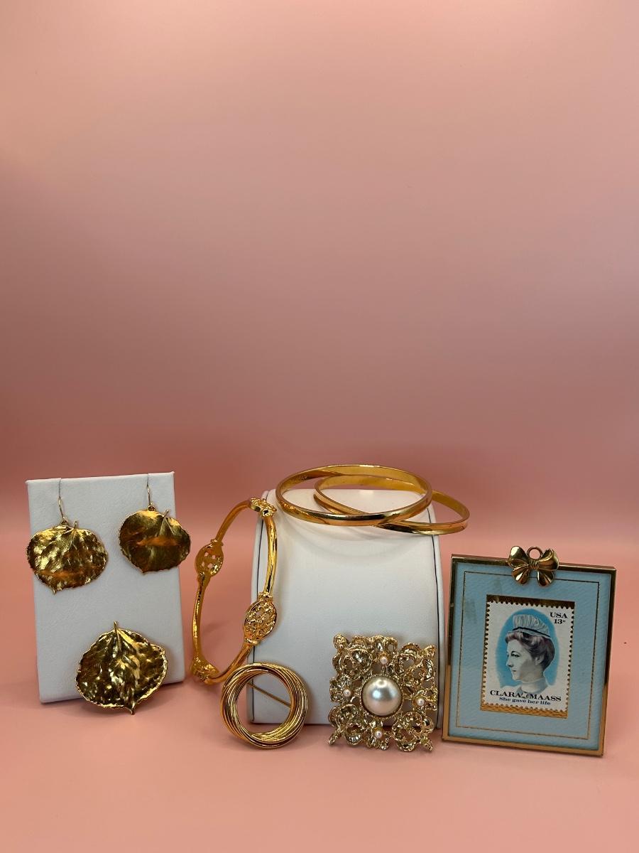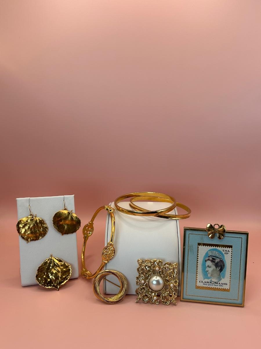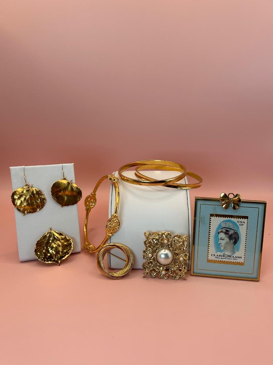 LOT 55: Gold Tone Fashion Jewelry - Earrings, Bracelets, Pins & Frame