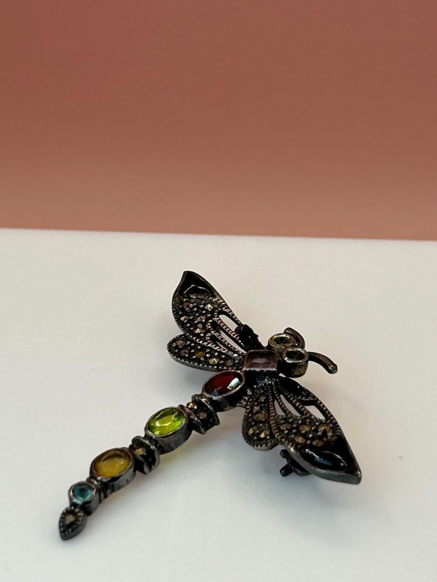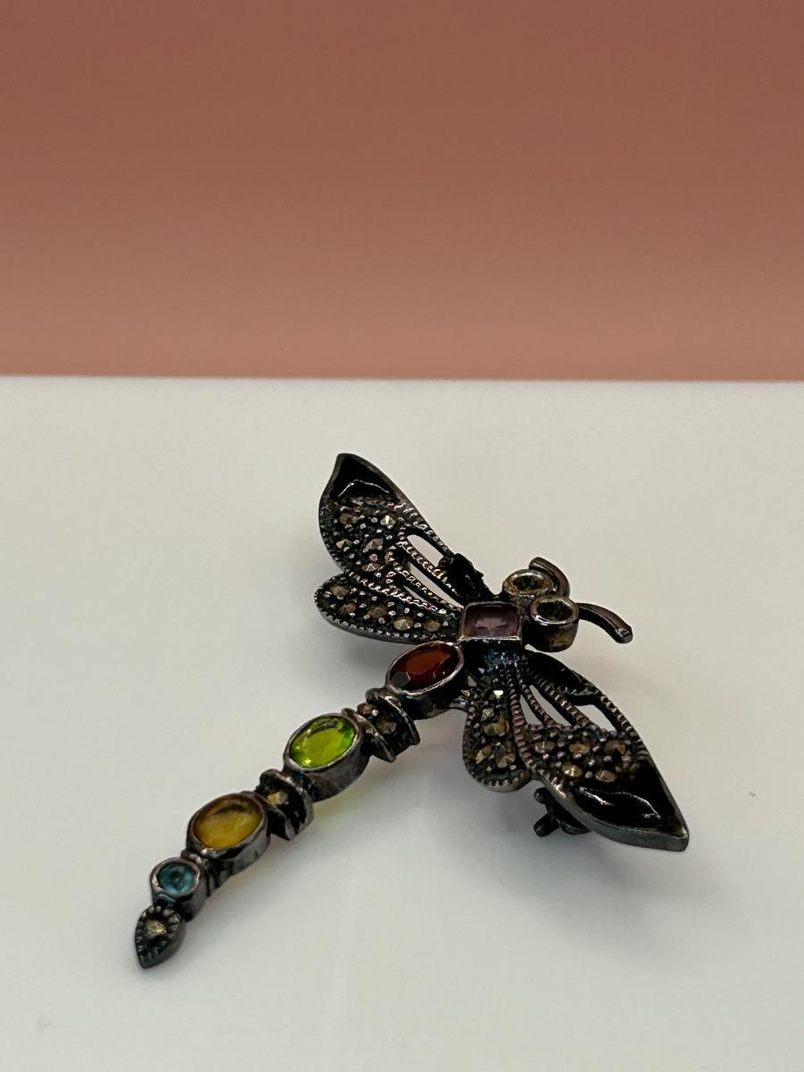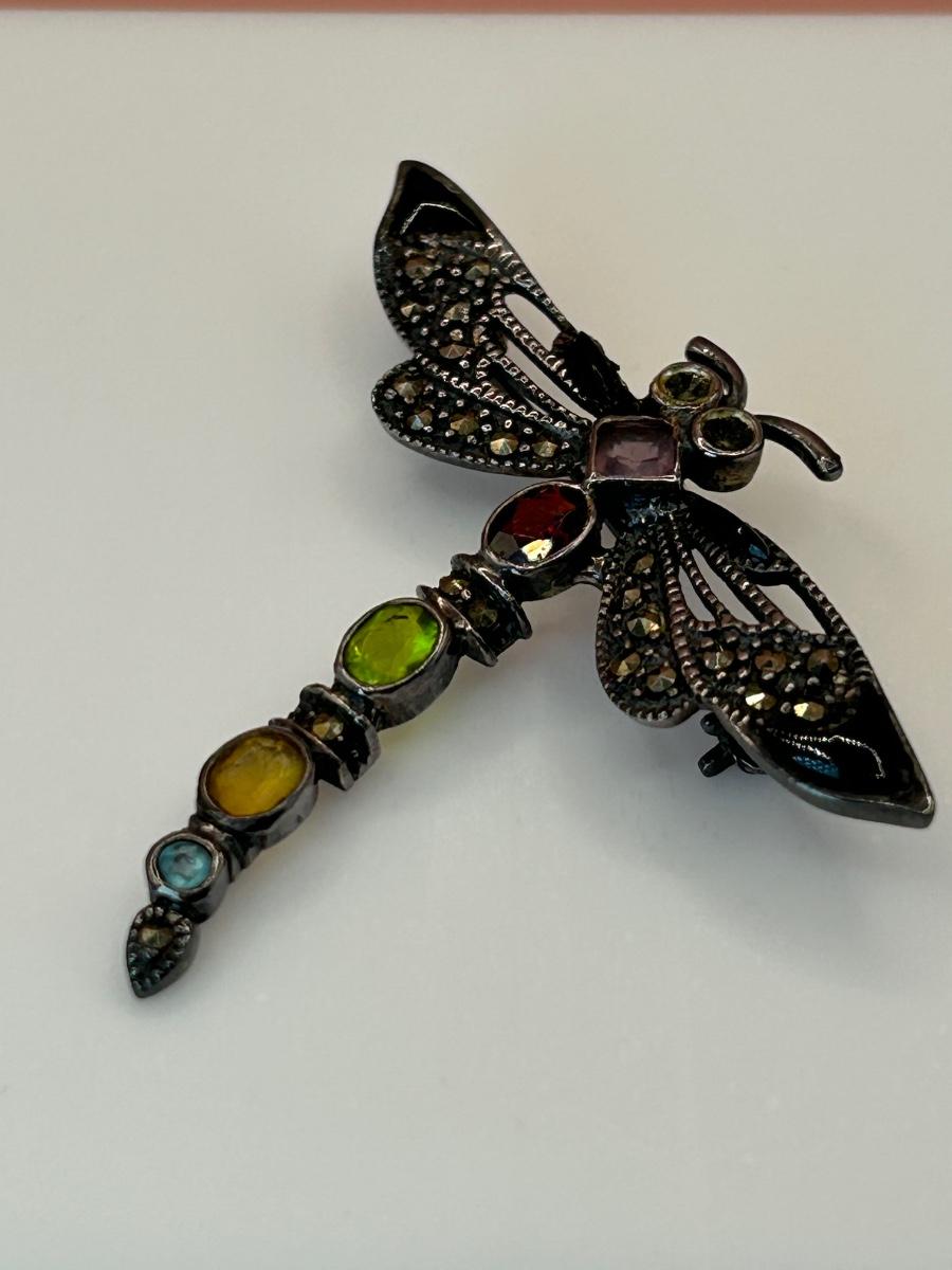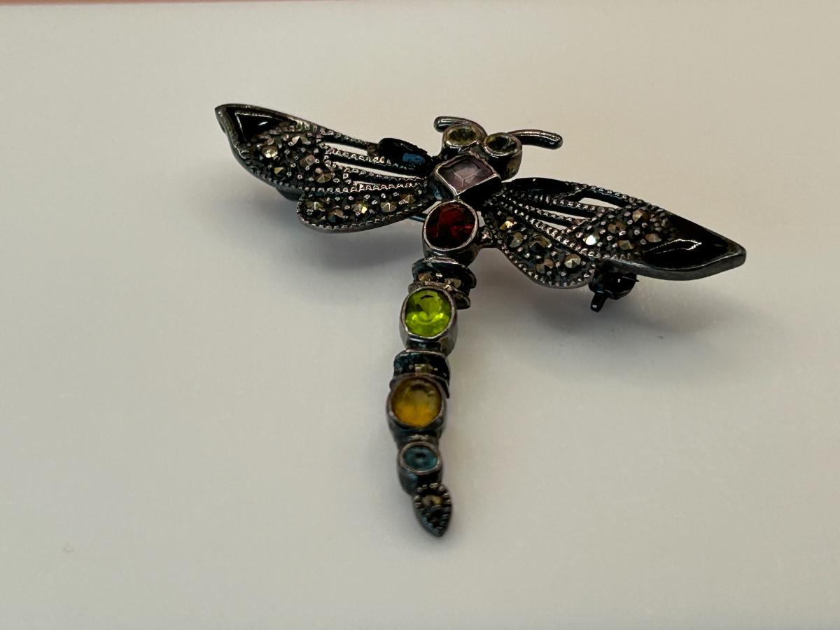 LOT 71: Vintage Sterling Silver Marcasite Dragonfly w Amethyst, Garnet, Peridot, Citrine & Blue Topaz Semi Precious Stone