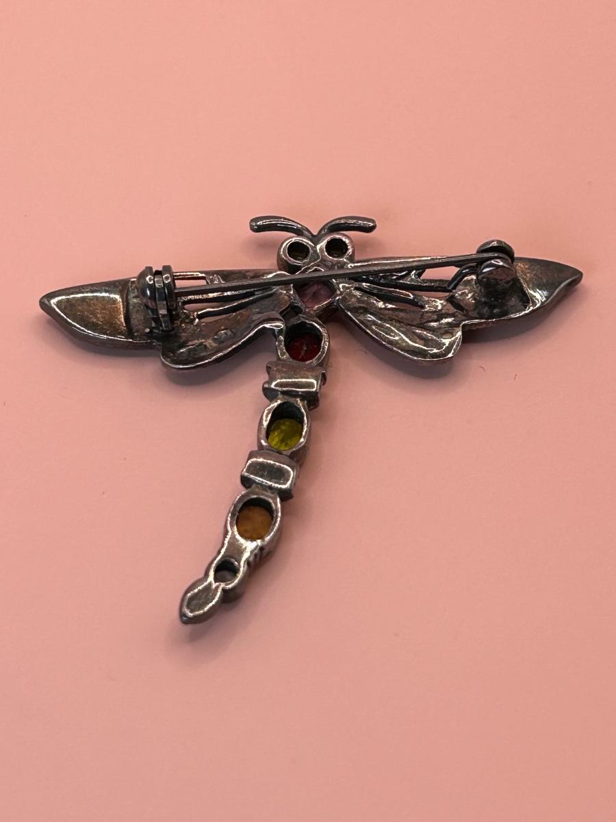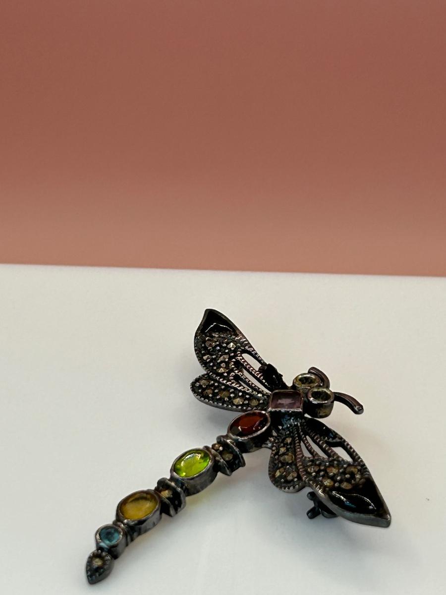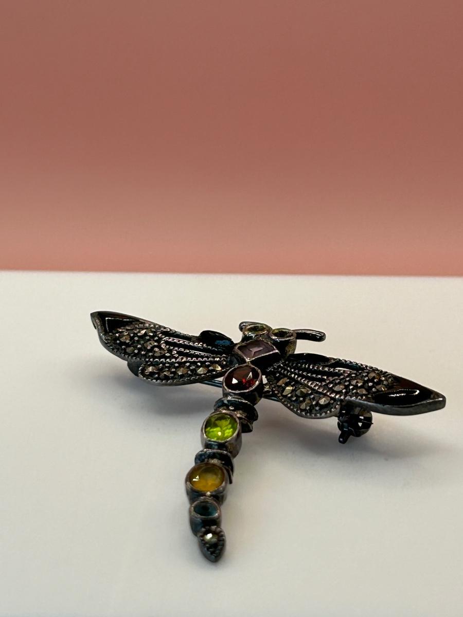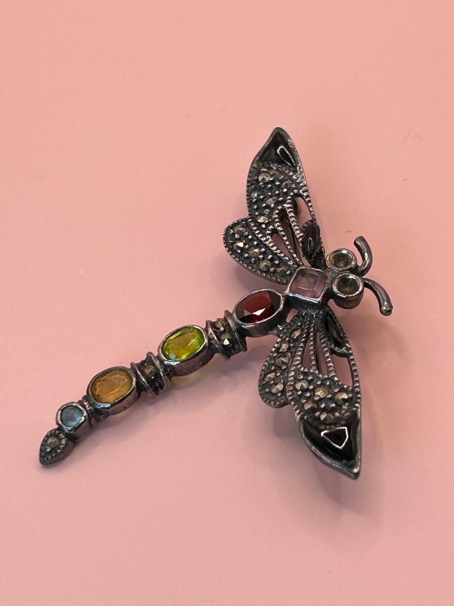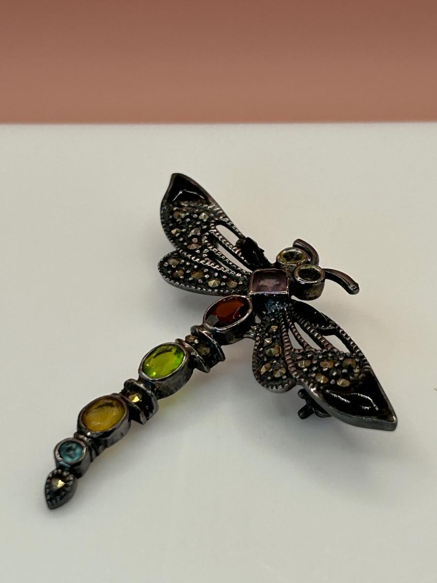 LOT 71: Vintage Sterling Silver Marcasite Dragonfly w Amethyst, Garnet, Peridot, Citrine & Blue Topaz Semi Precious Stone