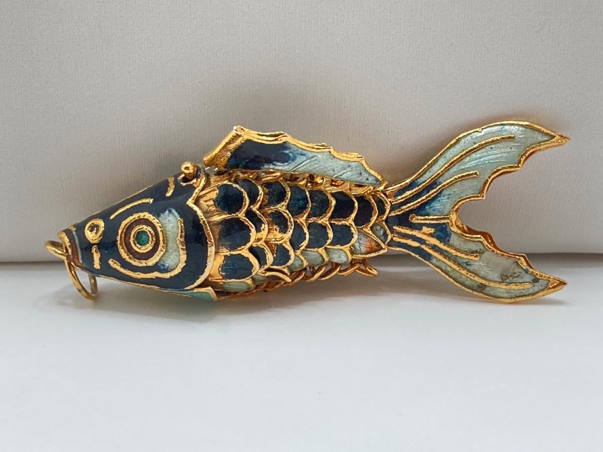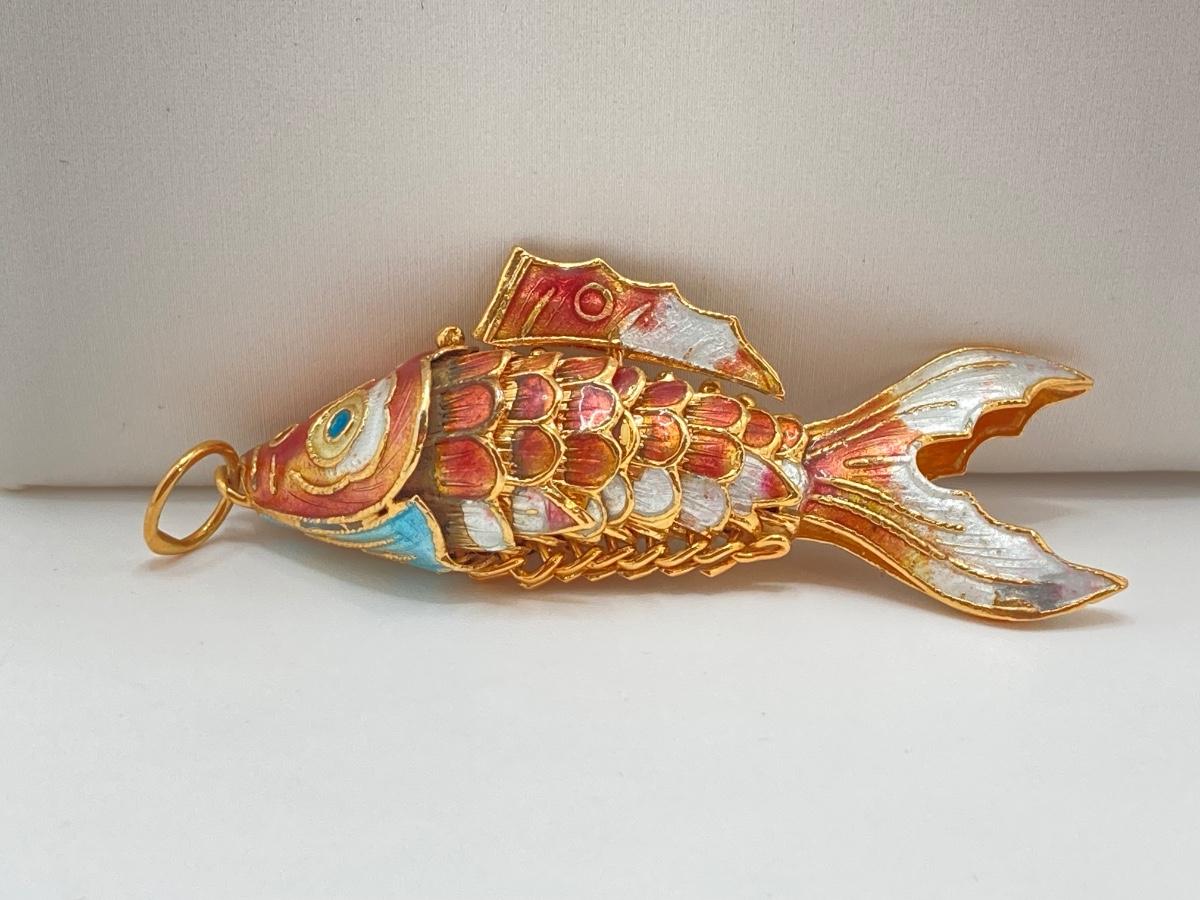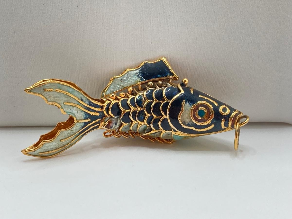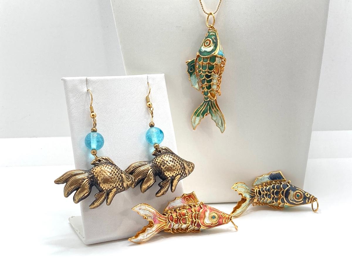 LOT 82: Gold Tone Necklace with Set of Articulated Fish Pendants and Pair of Dangling Bronze Tone Fish Earrings