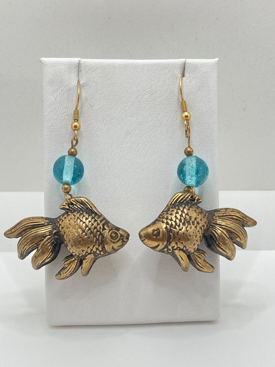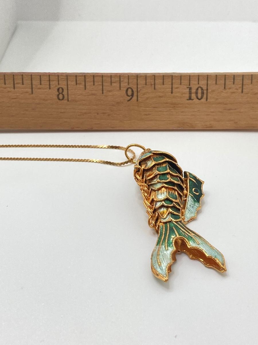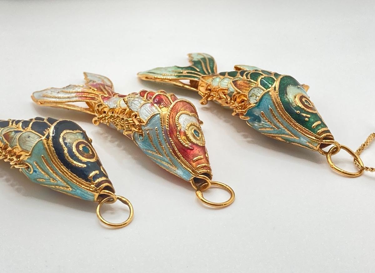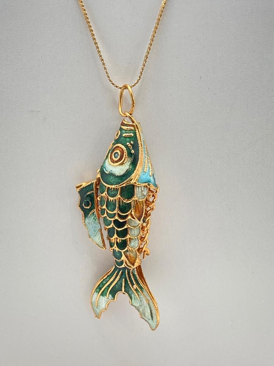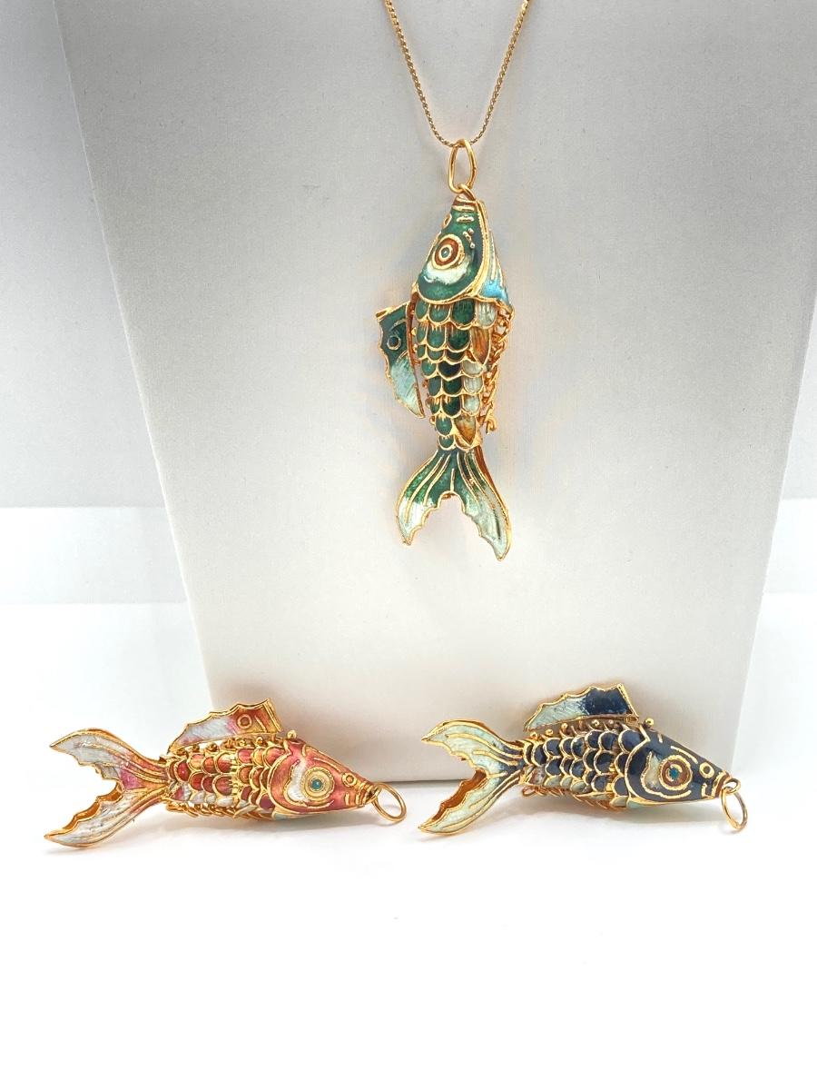 LOT 82: Gold Tone Necklace with Set of Articulated Fish Pendants and Pair of Dangling Bronze Tone Fish Earrings