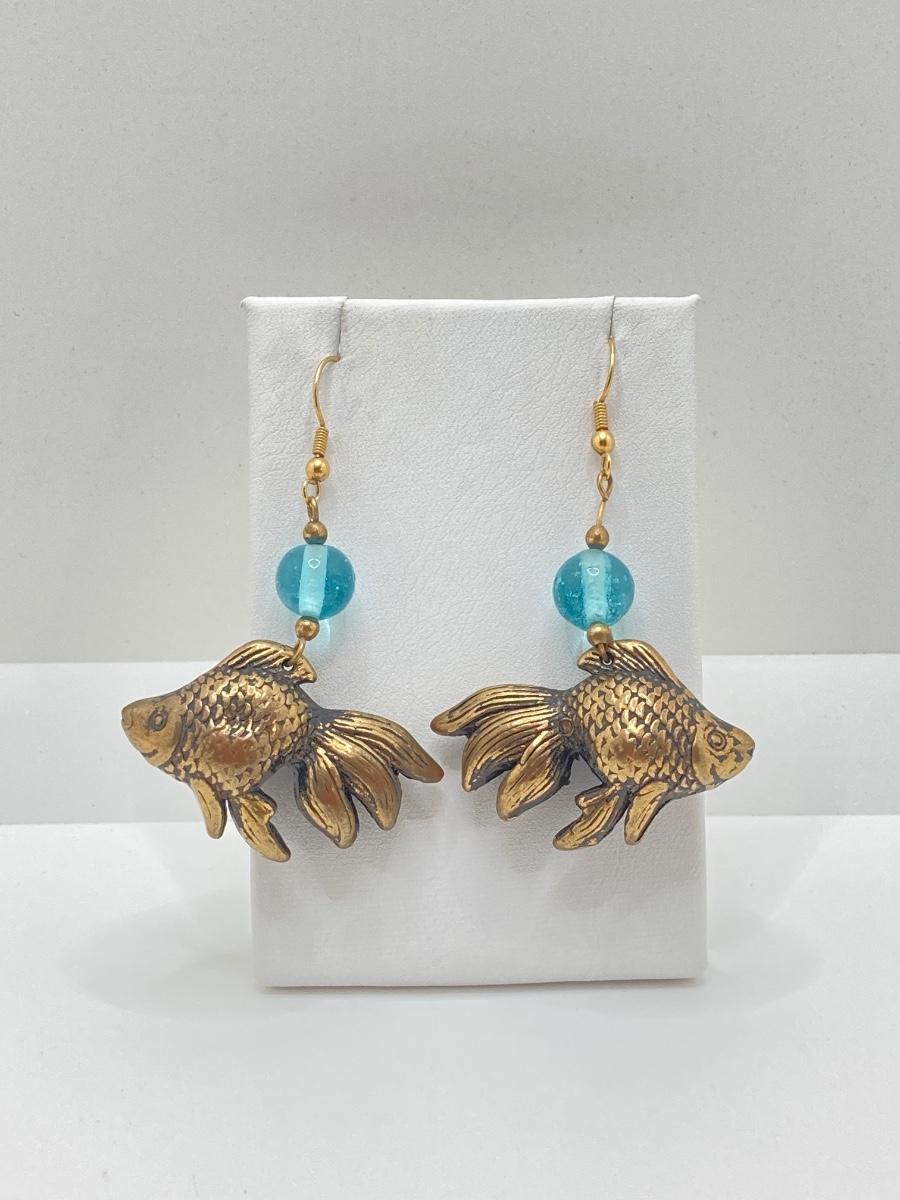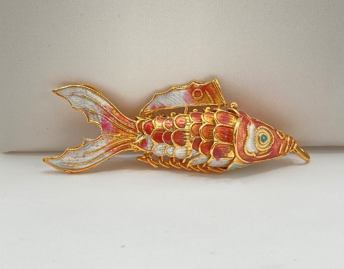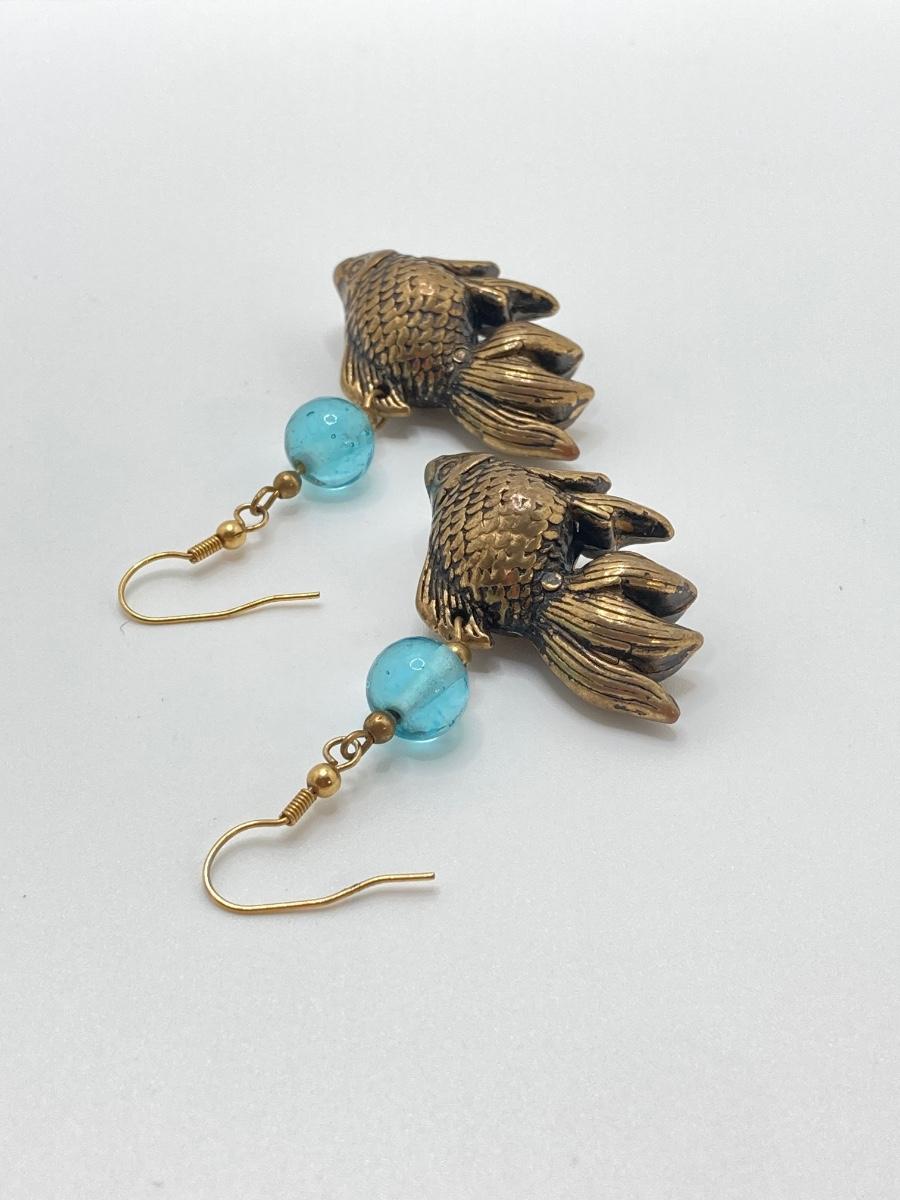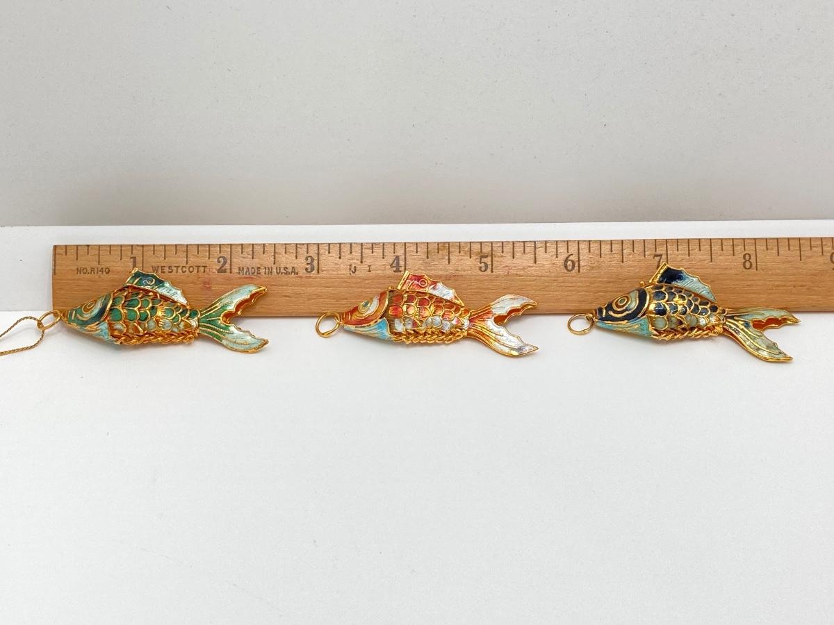 LOT 82: Gold Tone Necklace with Set of Articulated Fish Pendants and Pair of Dangling Bronze Tone Fish Earrings
