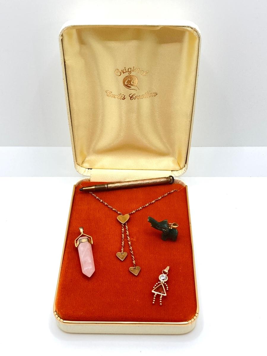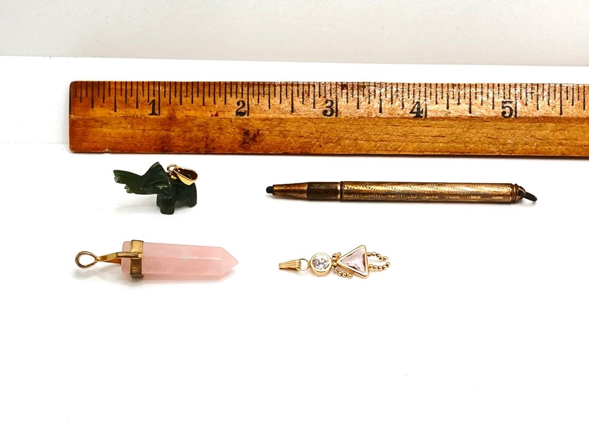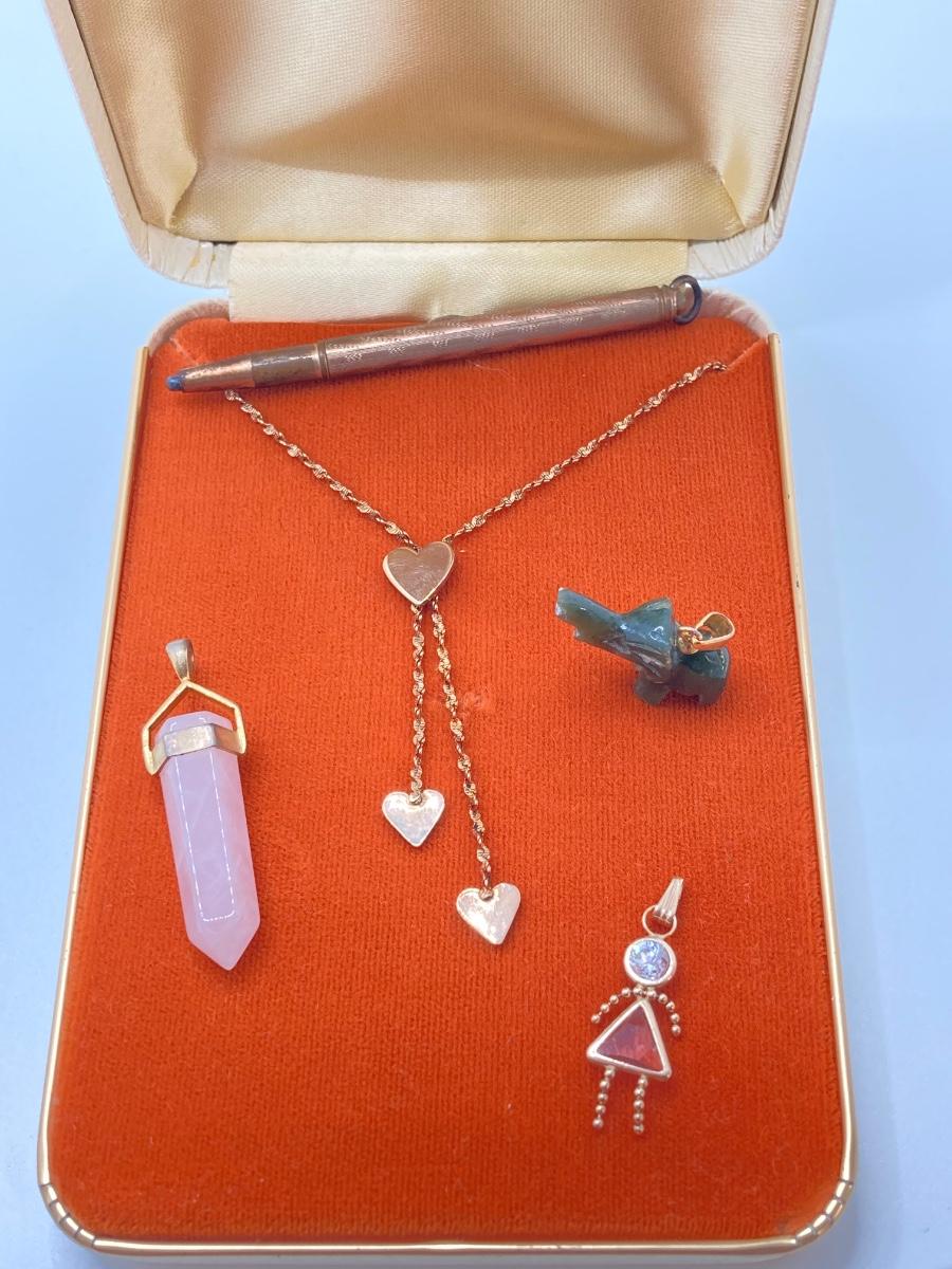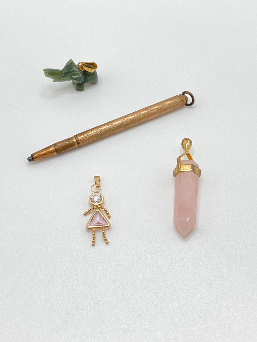 LOT 89: Gold Filled Heart Necklace, Rose Quartz Pendant, Vintage Retractable Pencil, small jade elephant pendant & gemstone girl charm