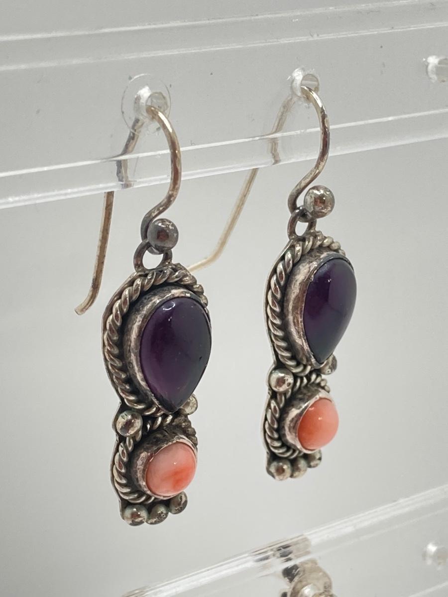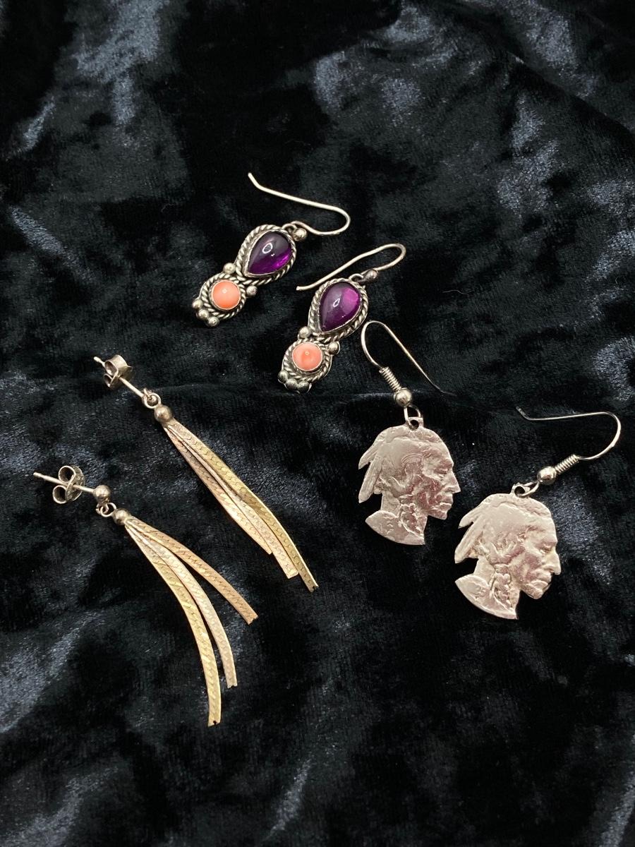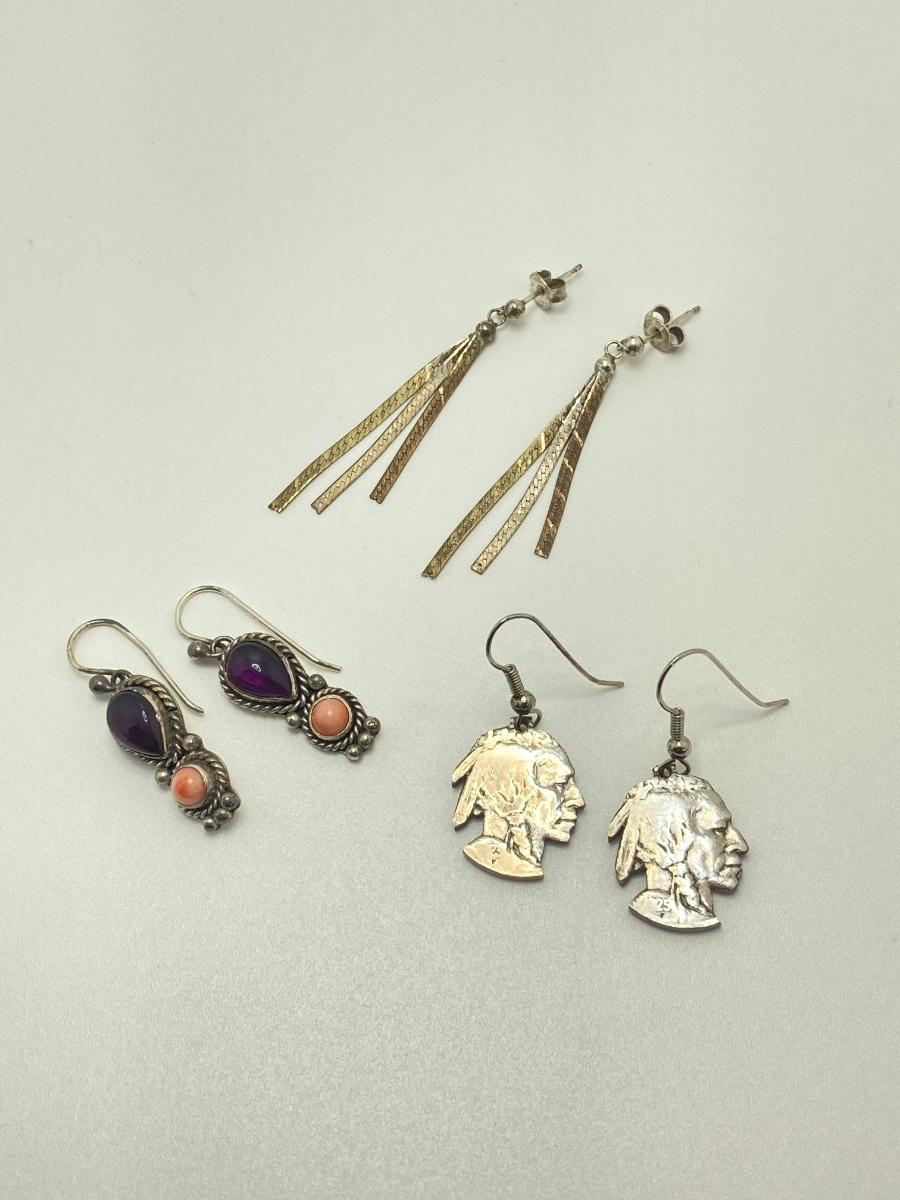 LOT 95: Silver Earrings Collection - Amethyst & Coral, Tri-Color Chain Dangle and Buffalo Nickels