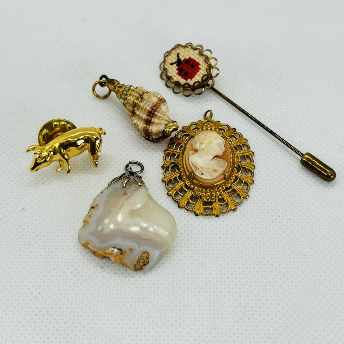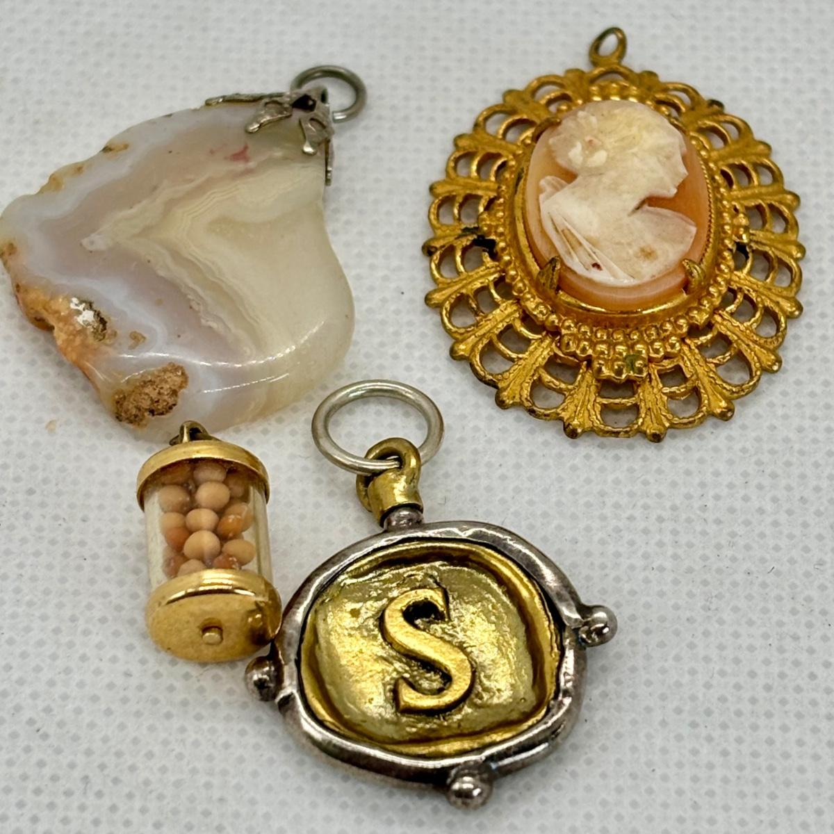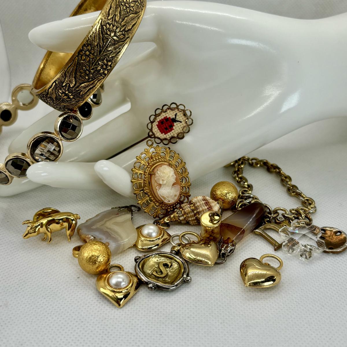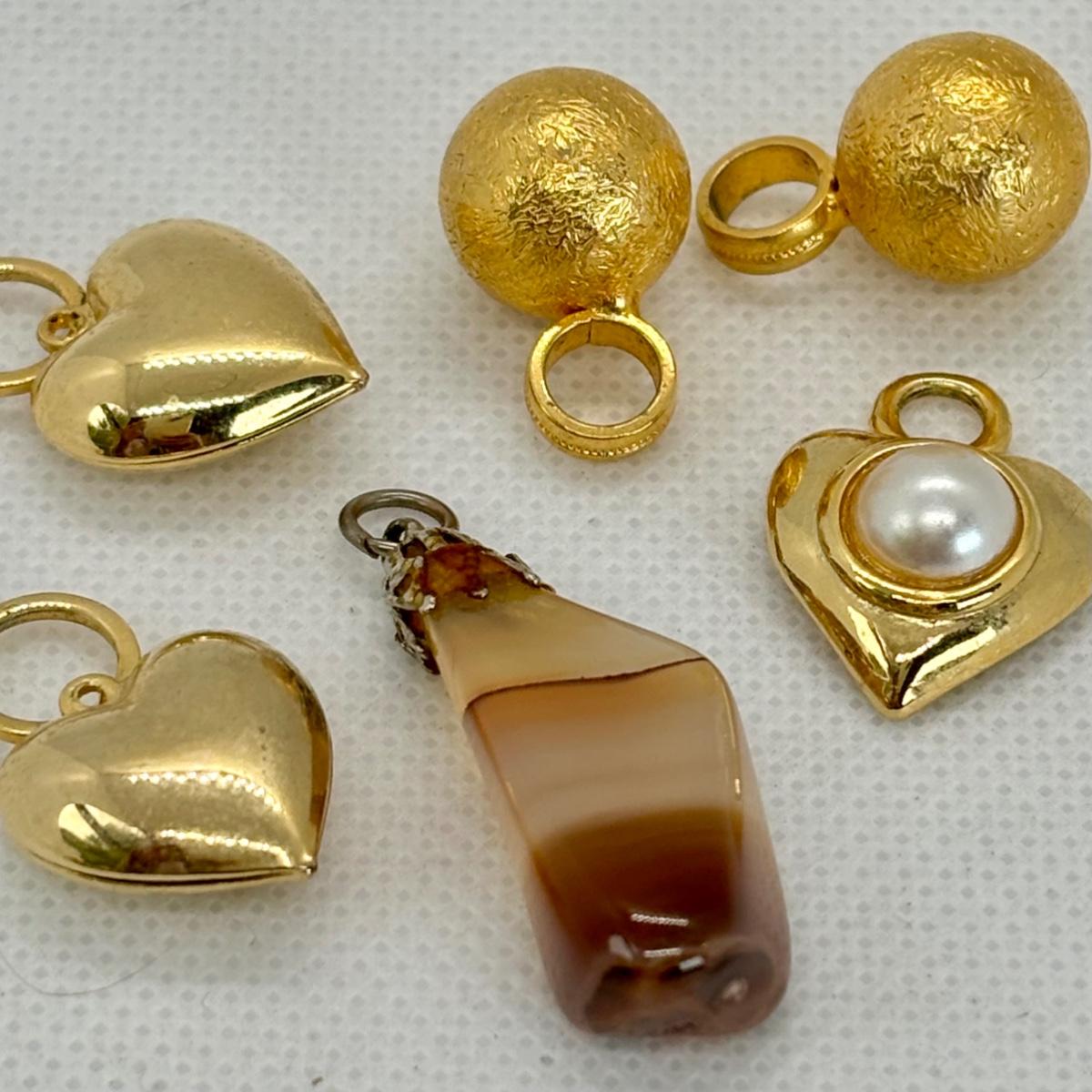 LOT 112: Gold Tone Collection: Charms, Hearts, Seashells & More along w/Gold tone Bracelets