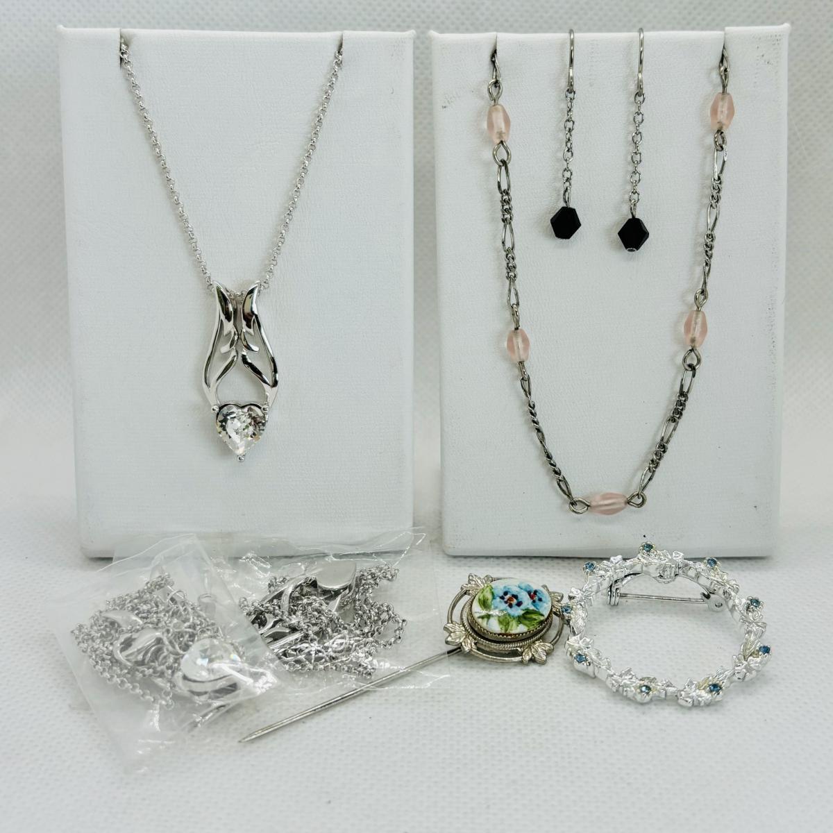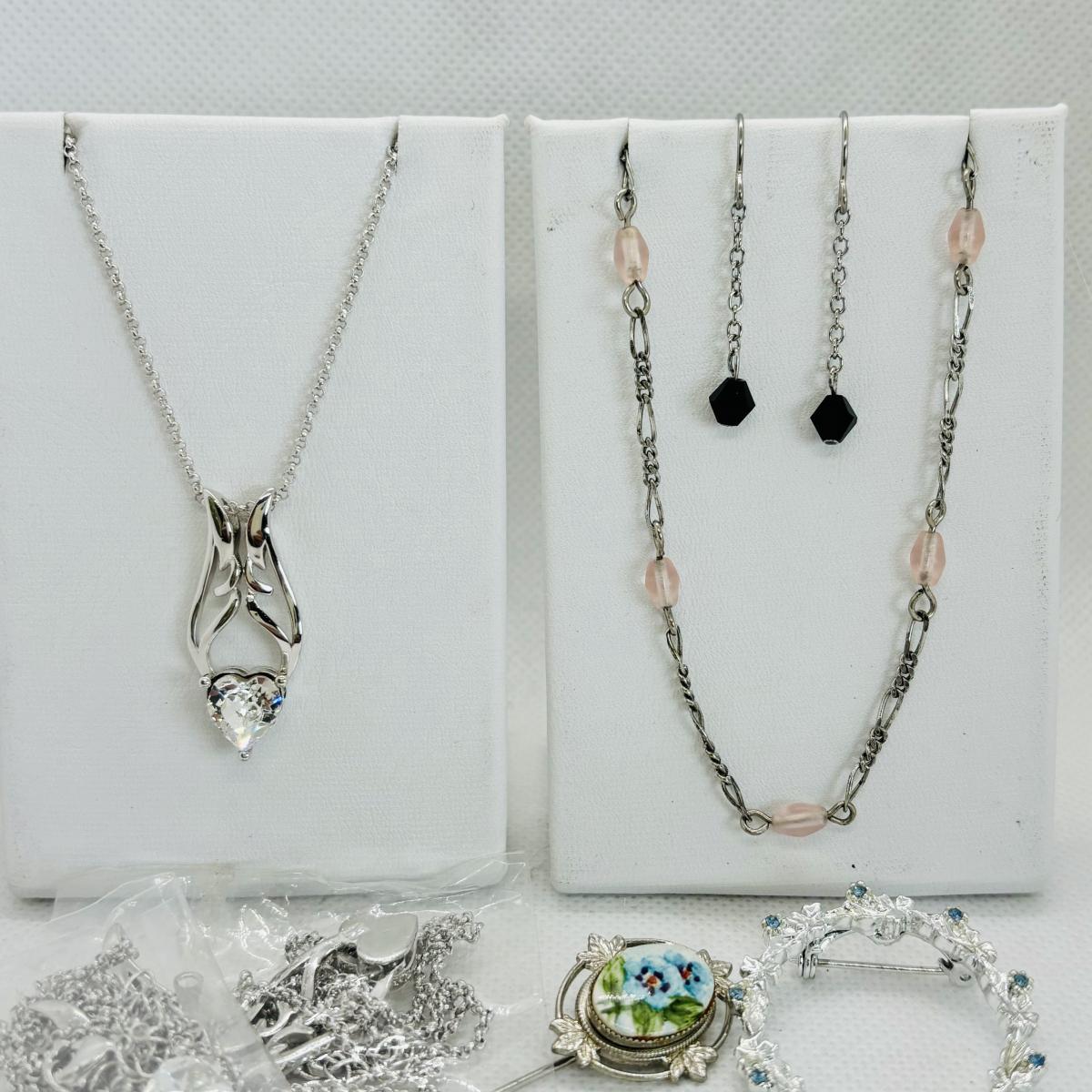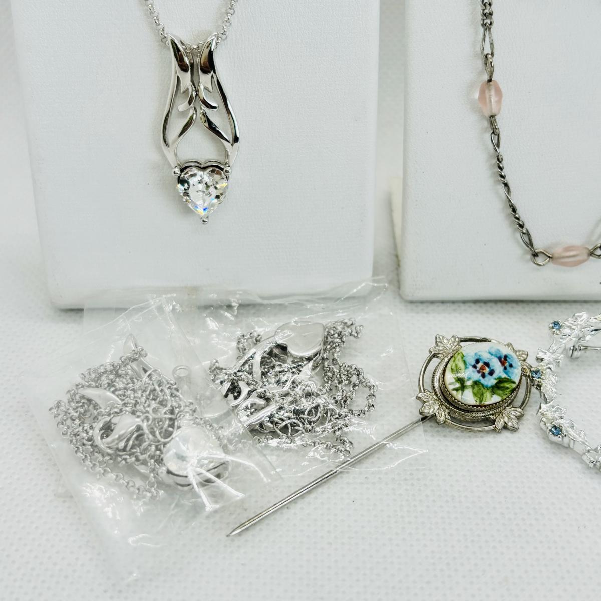 LOT 113: Silver Tone Collection Rhinestone Heart Necklace, Brooch, Stick Pin &n More