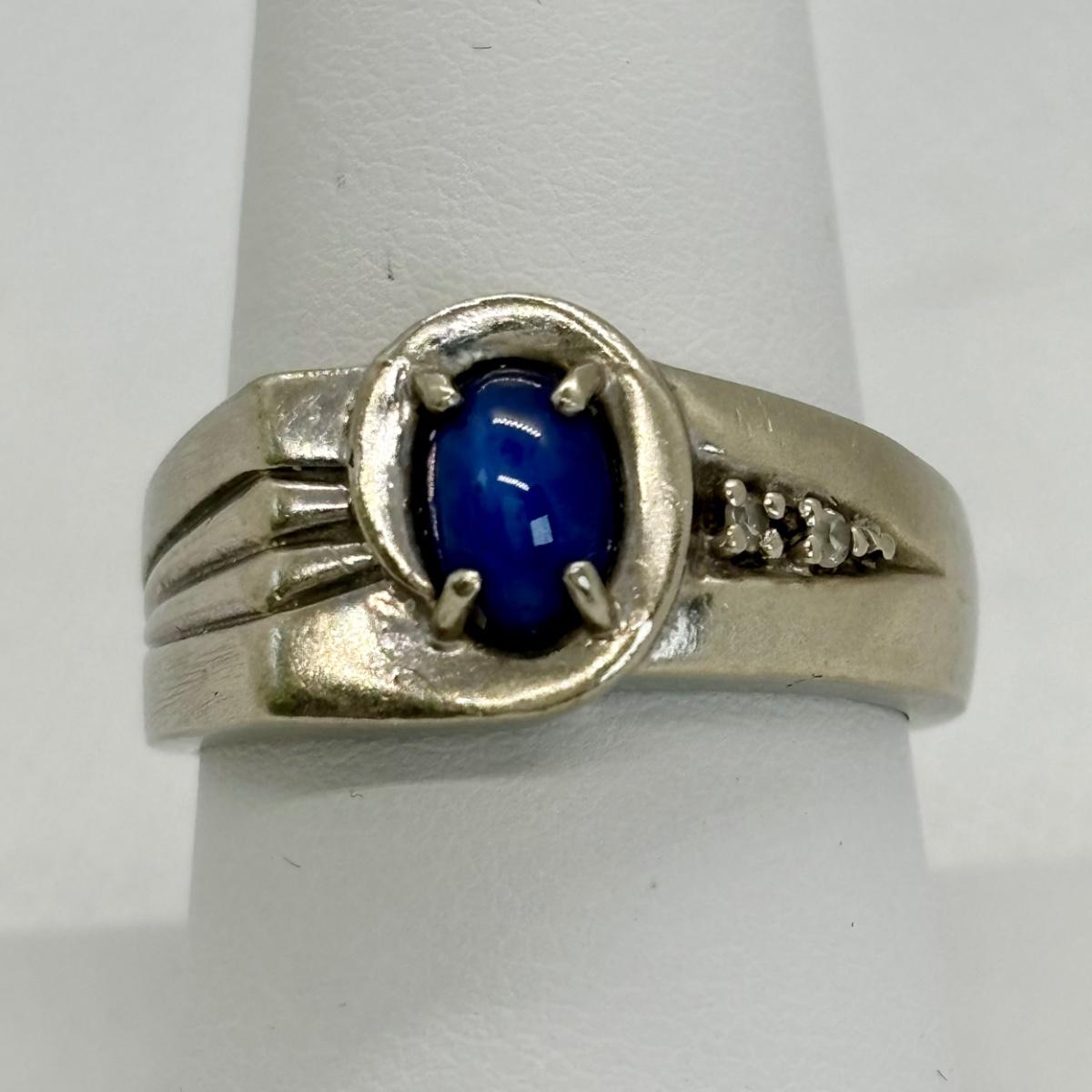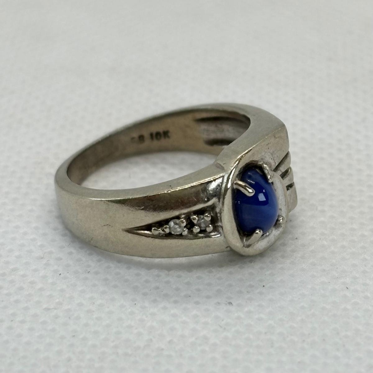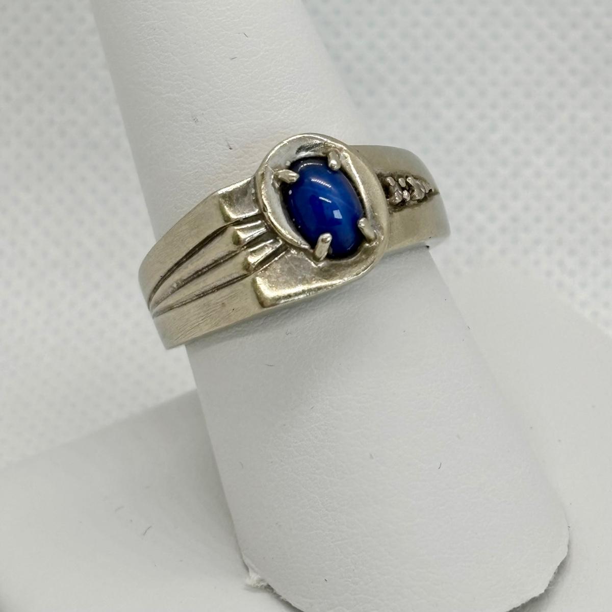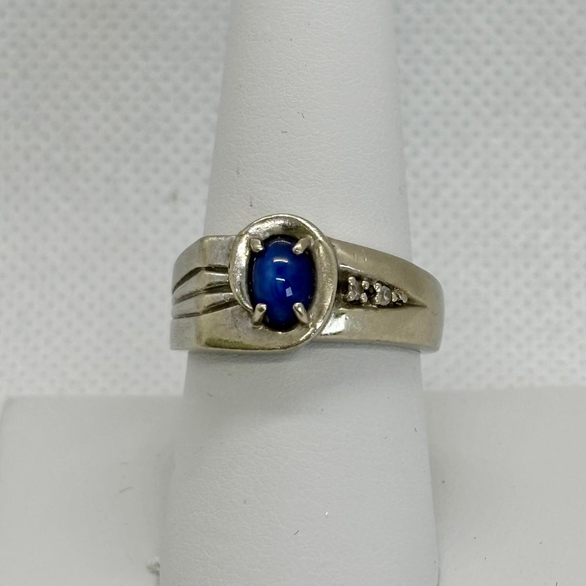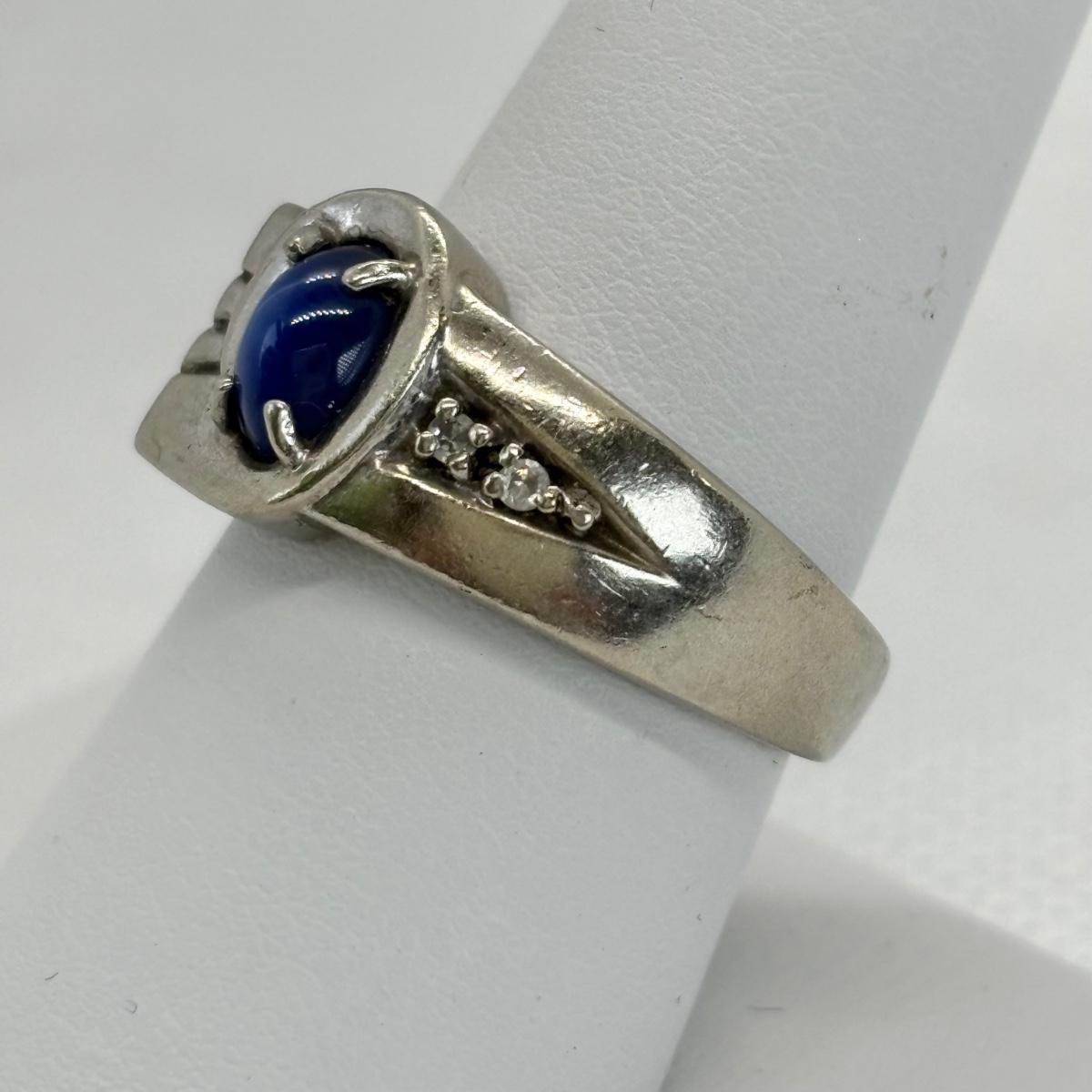 LOT 123: White Gold Blue Star Sapphire Ring w/Diamond Chip Accents, 10K, Tw 6.7g, sz.8.5