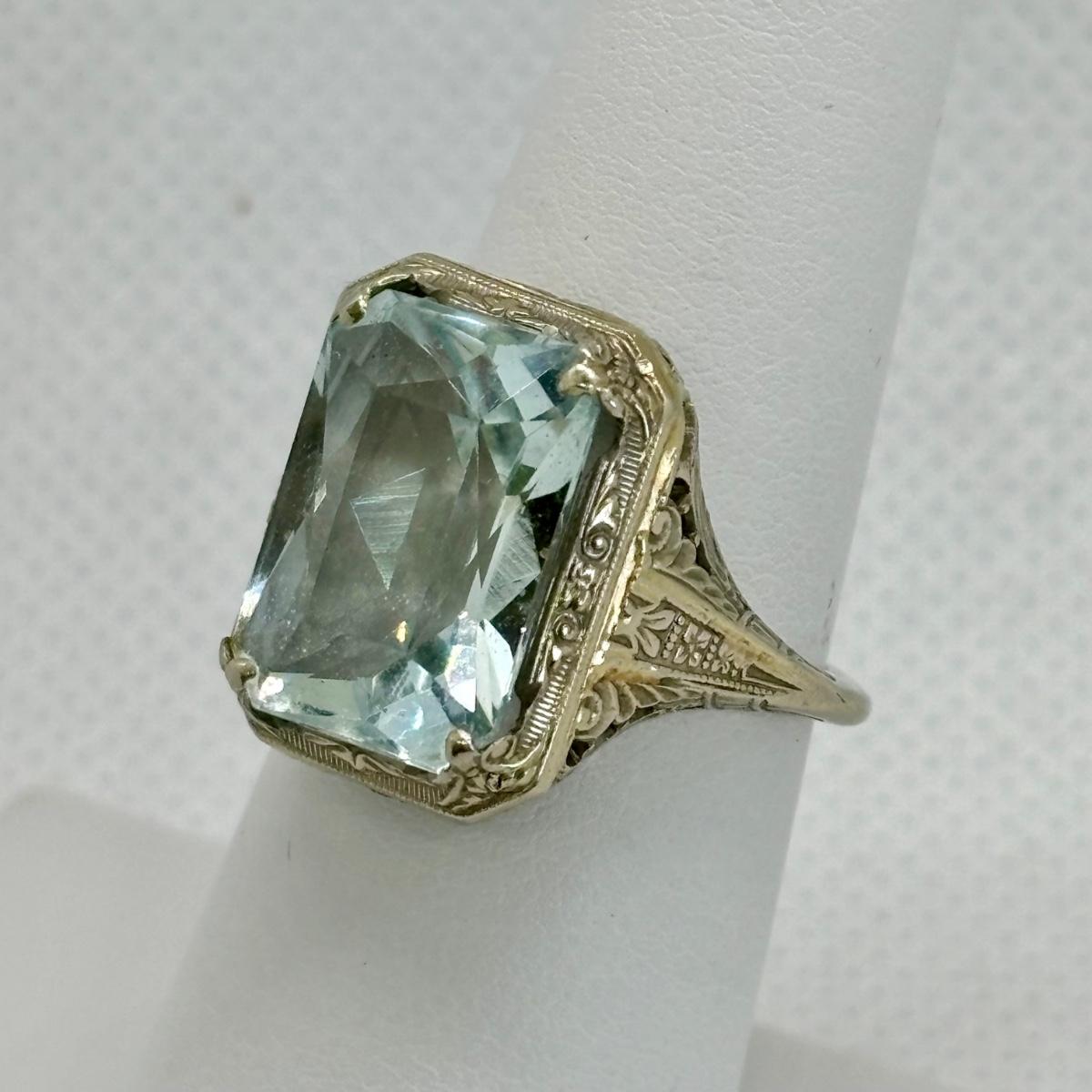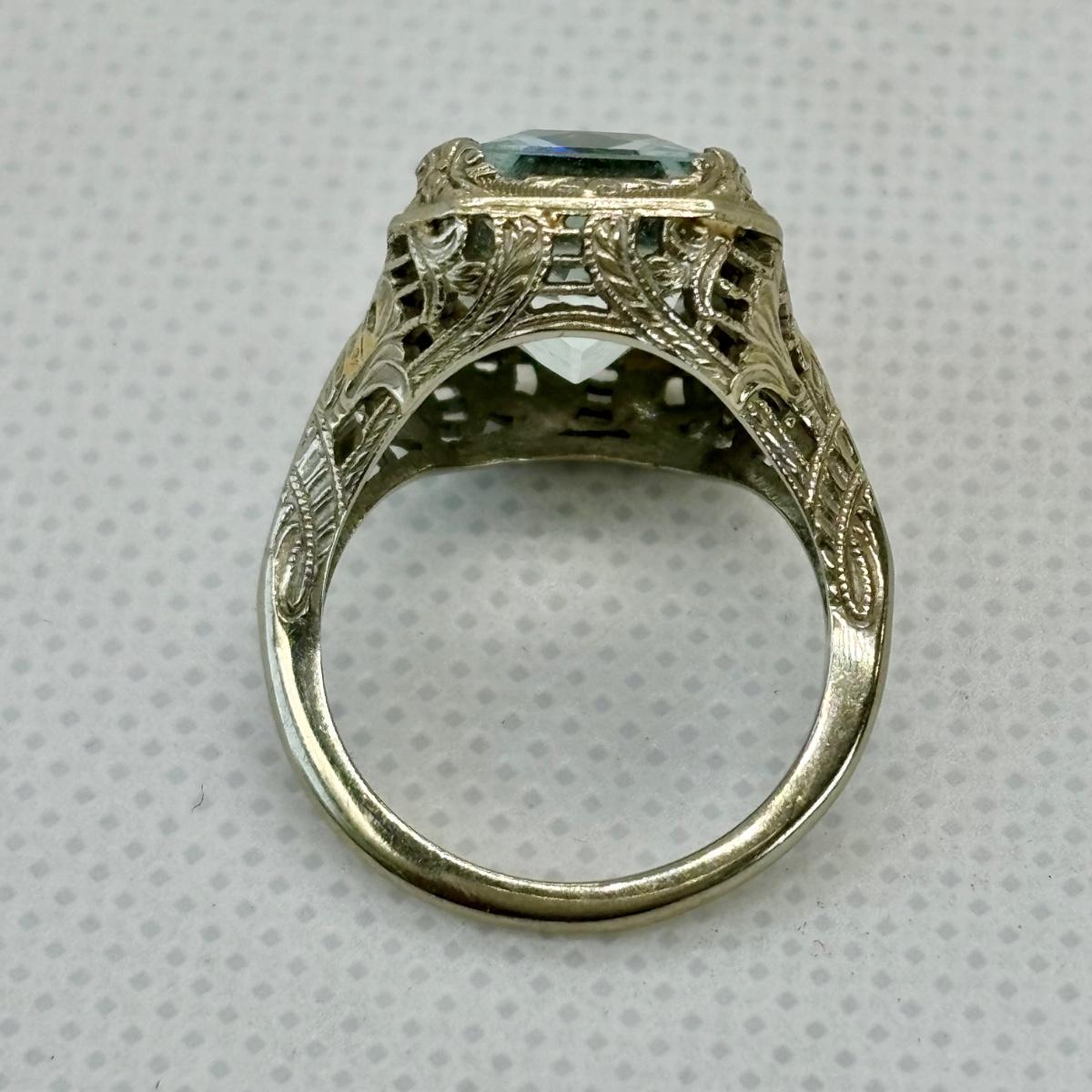 LOT 127: White Gold 18K Square Blue Aqua Glass Stone Cocktail Ring, Tw. 5.2g, sz.5.5