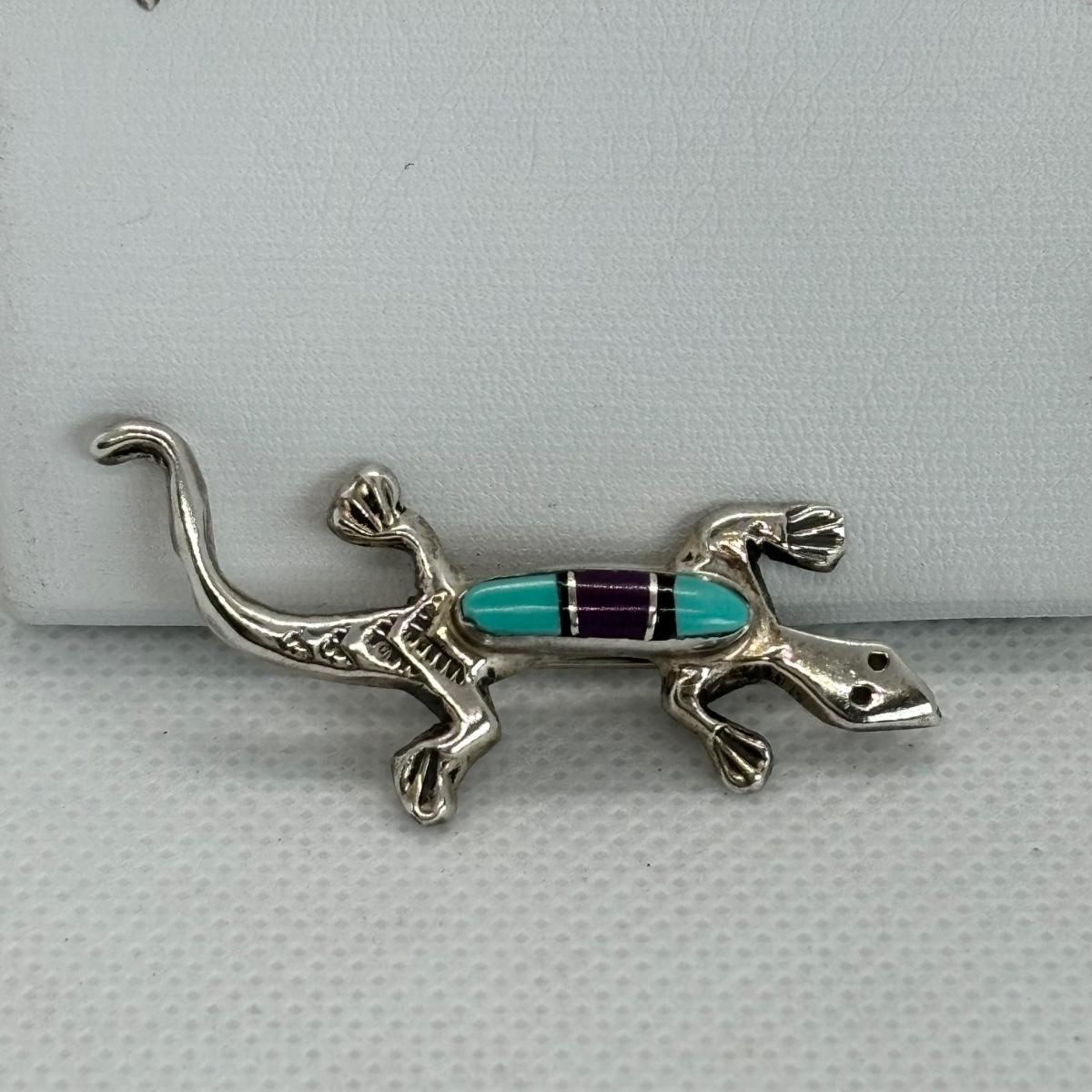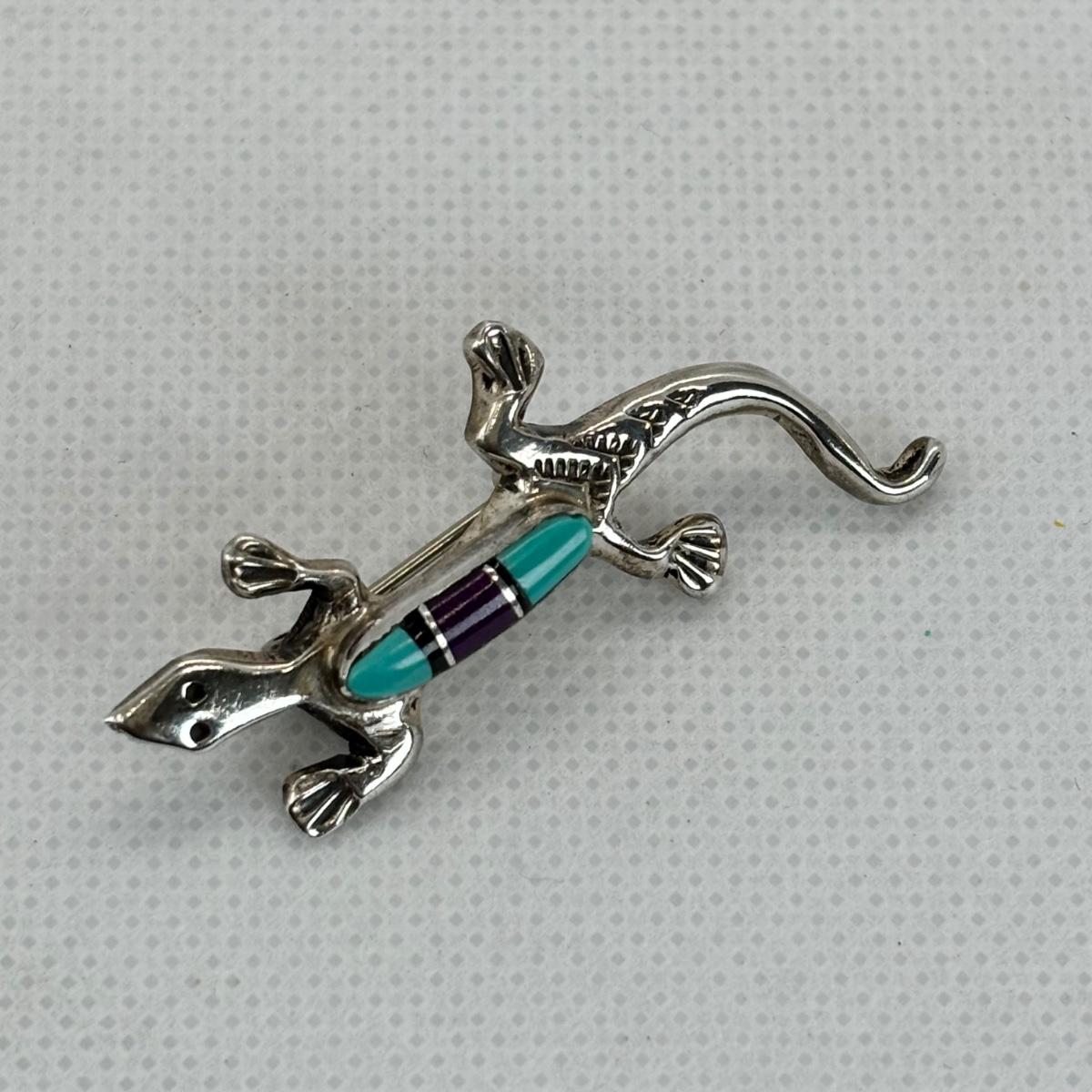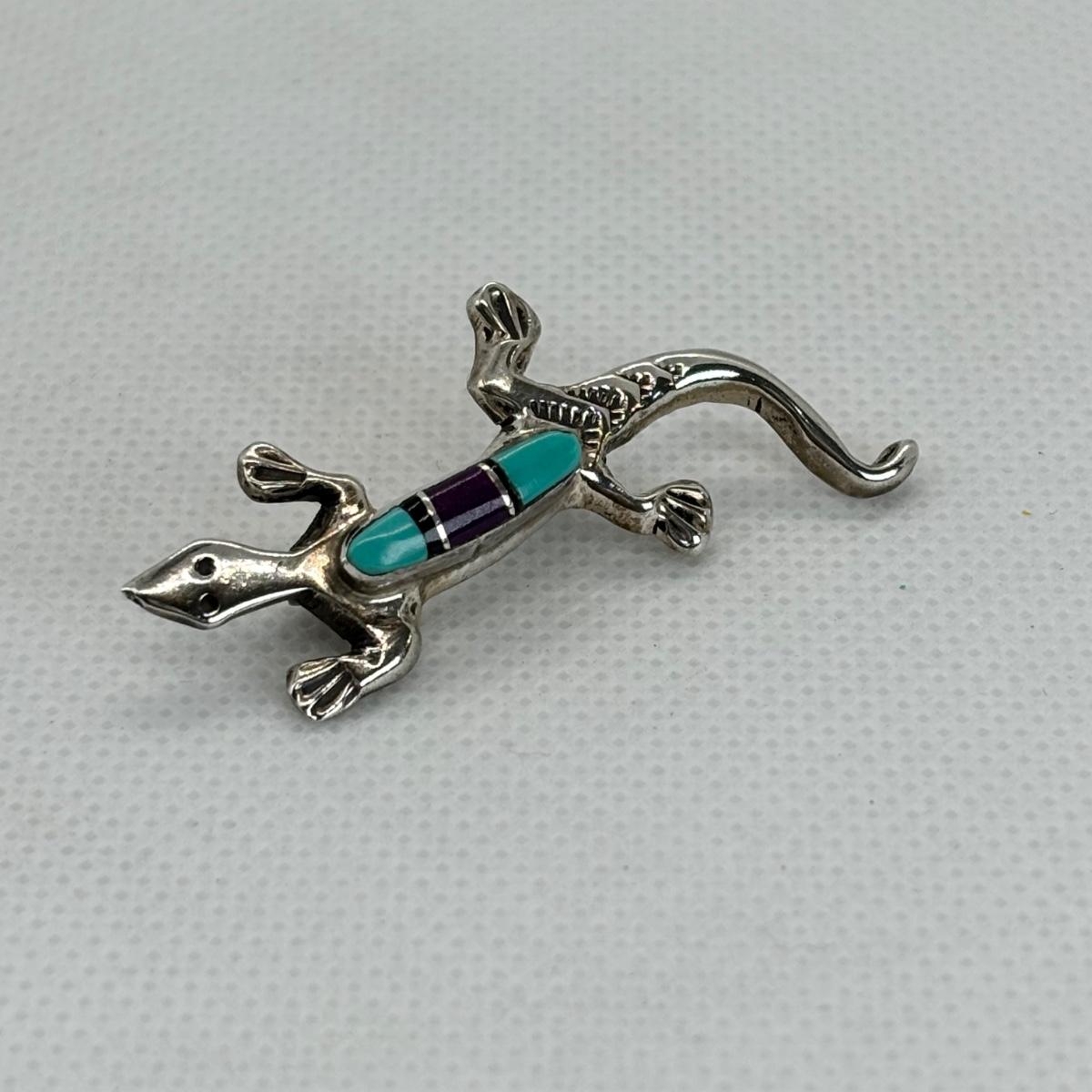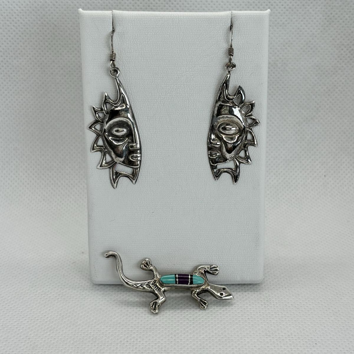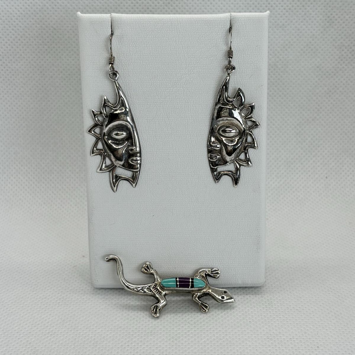 LOT 131: Vintage Sterling Silver & Multi Color Inlay Lizard/Iguana Brooch & 925 Sterling Silver Sun Pierced Earrings