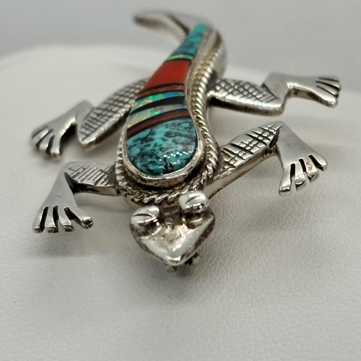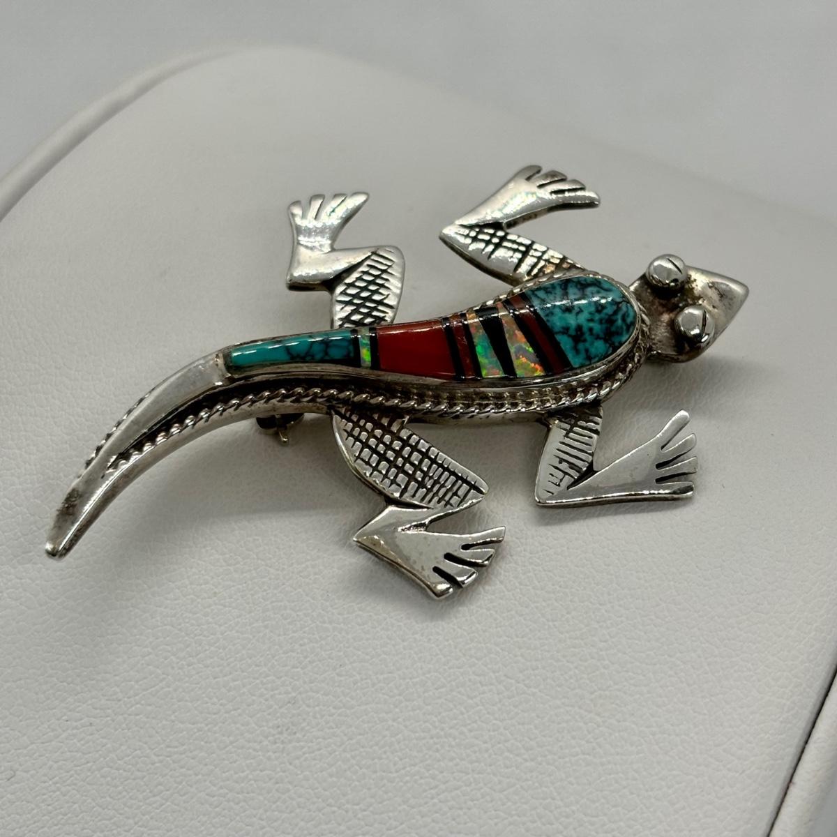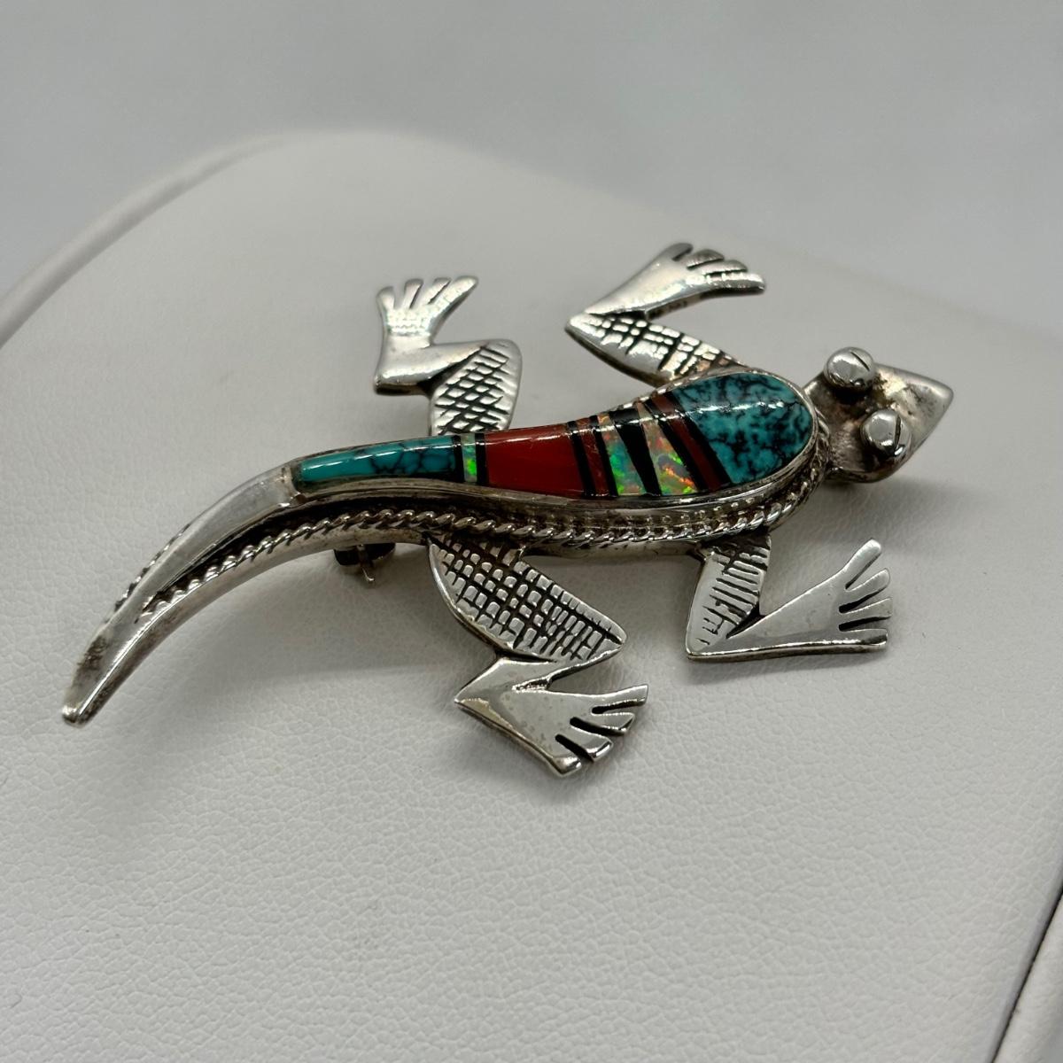 LOT 146: Vintage Zuni Native American Multi Color Inlay Lizard/Gecko Brooch - Turquoise, Cinnabar, Onyx & Opal - Tw 13g