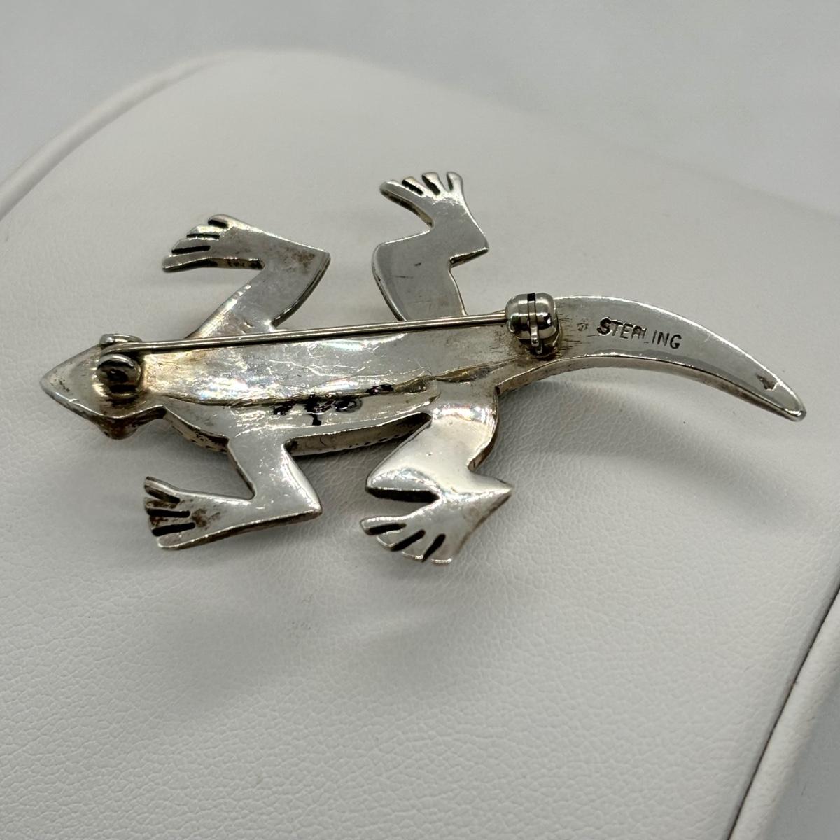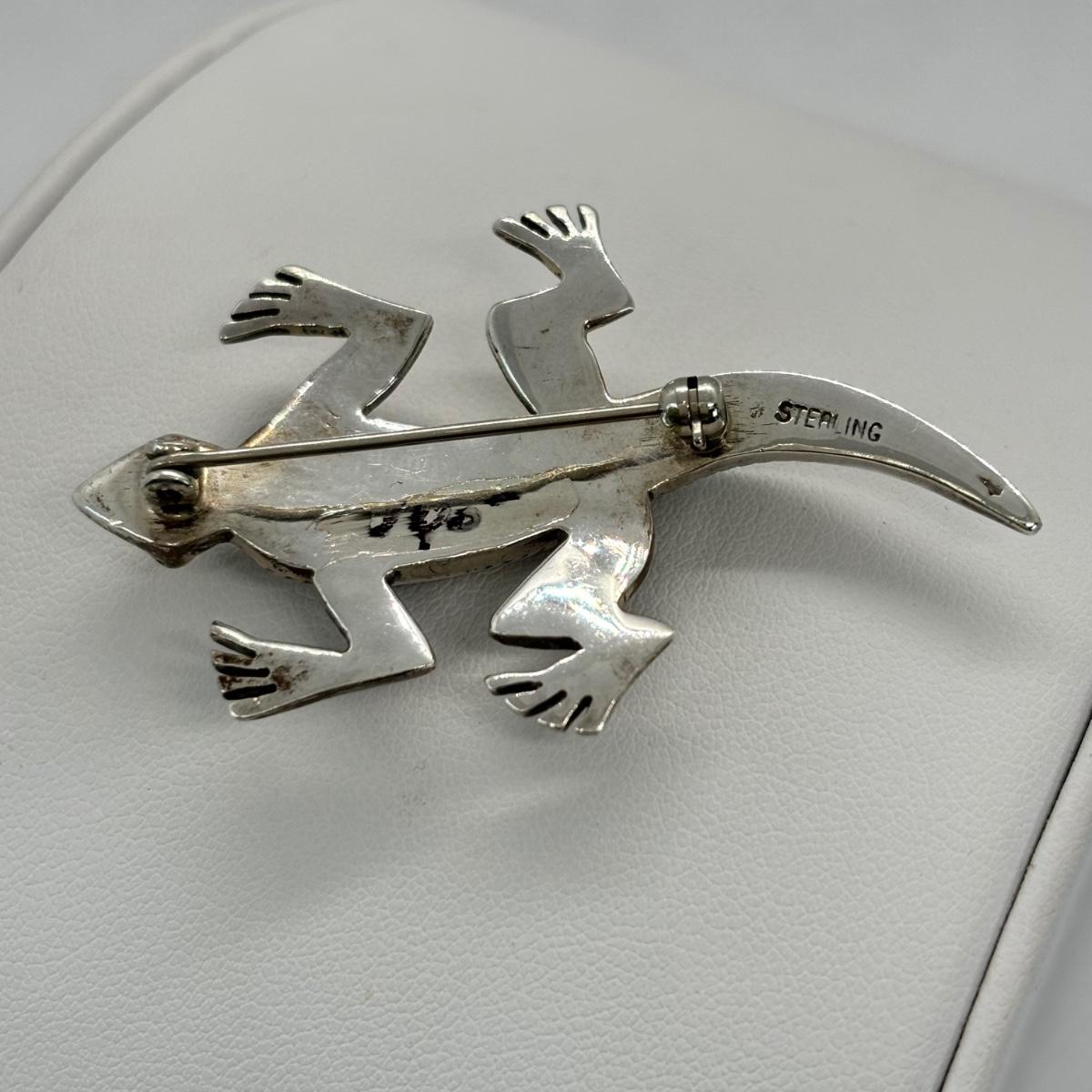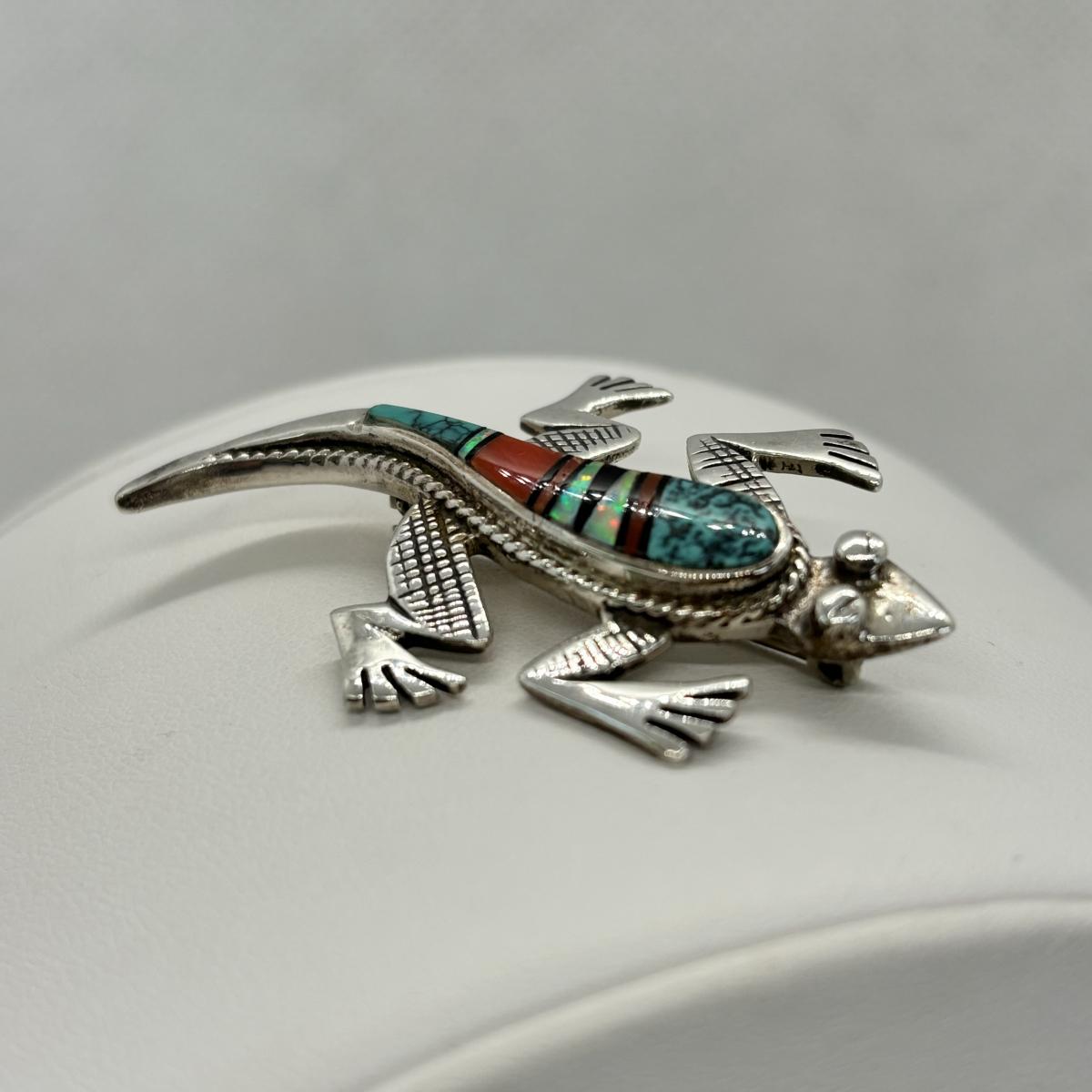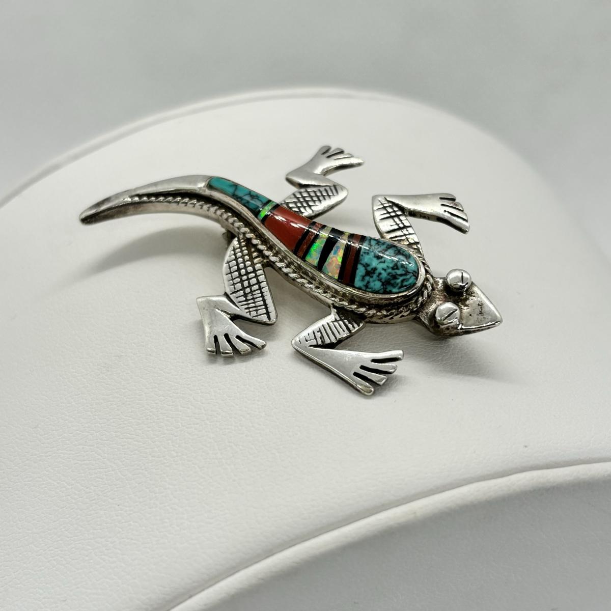 LOT 146: Vintage Zuni Native American Multi Color Inlay Lizard/Gecko Brooch - Turquoise, Cinnabar, Onyx & Opal - Tw 13g