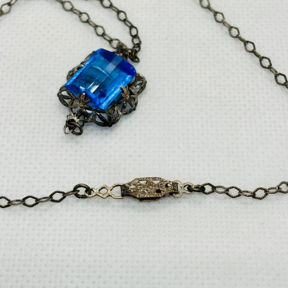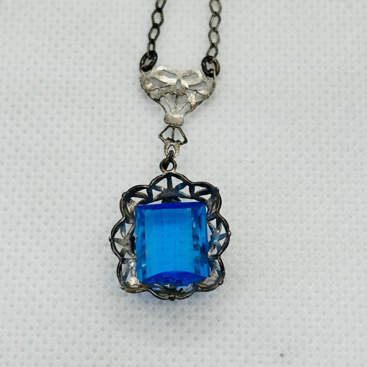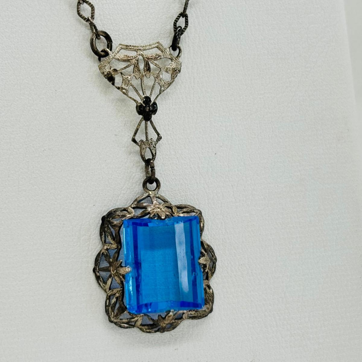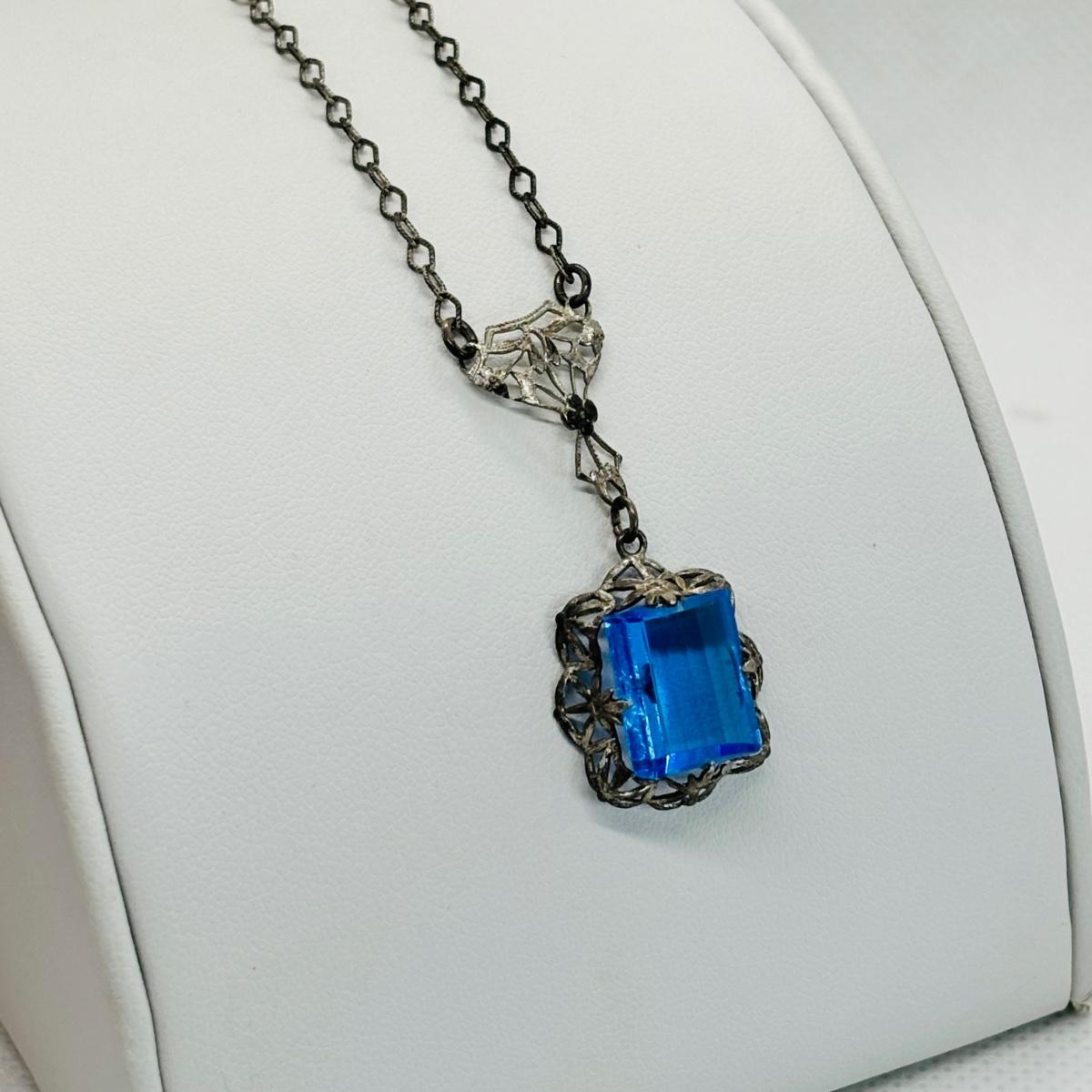 LOT 151: Delicate Art Nouveau Jugendstil Blue Faceted Czech Glass Lavaliere Necklace Marked STER - 15"L