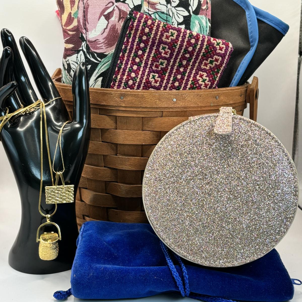 LOT 153. Longaberger Basket, Gold Tone Longaberger Pendant w/Chain, Jewelry Storage Solutions & More