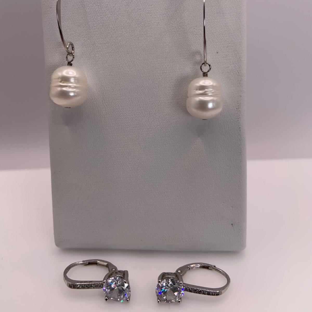 LOT171: Signed 925 Earrings with Pearl Dangles and Large C2 Earring with Diamond Accents