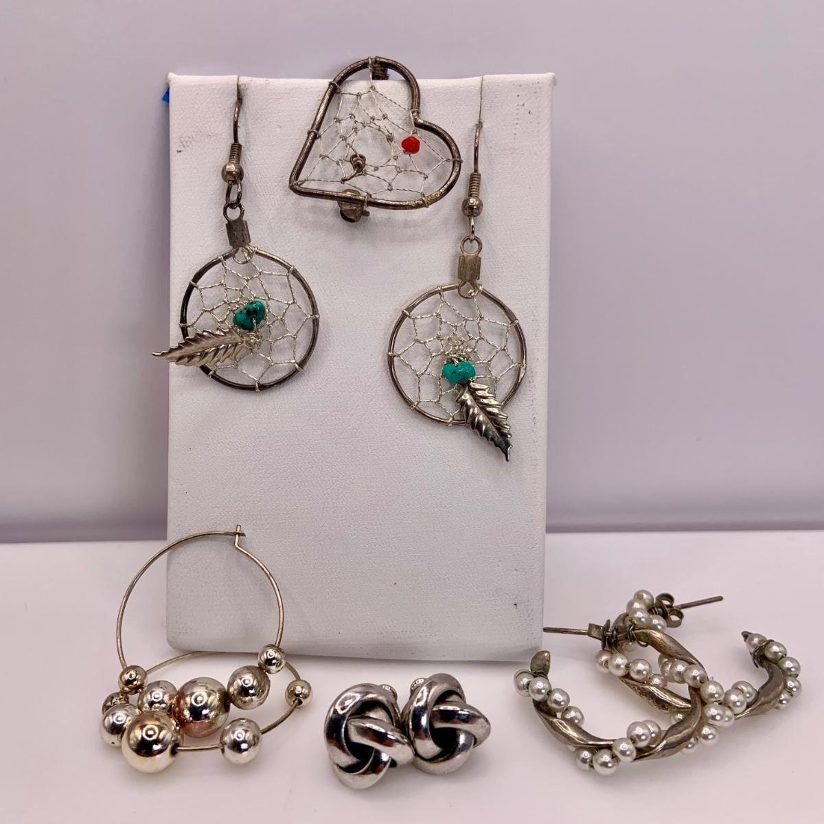 LOT172:: Beautiful Collection-Unsigned Silvertone Earring, Metal Knots Dreamcatcher Earring and Heartshaped Brooch and More