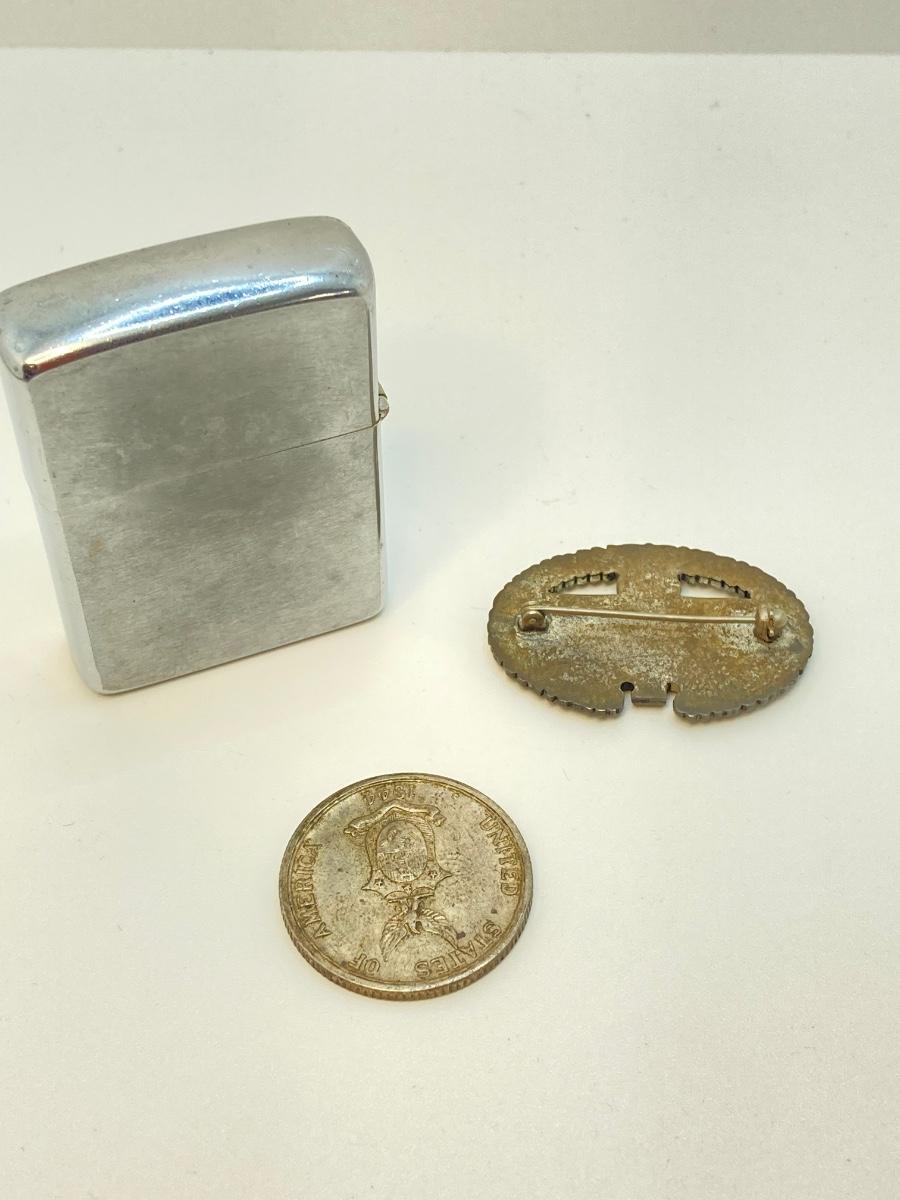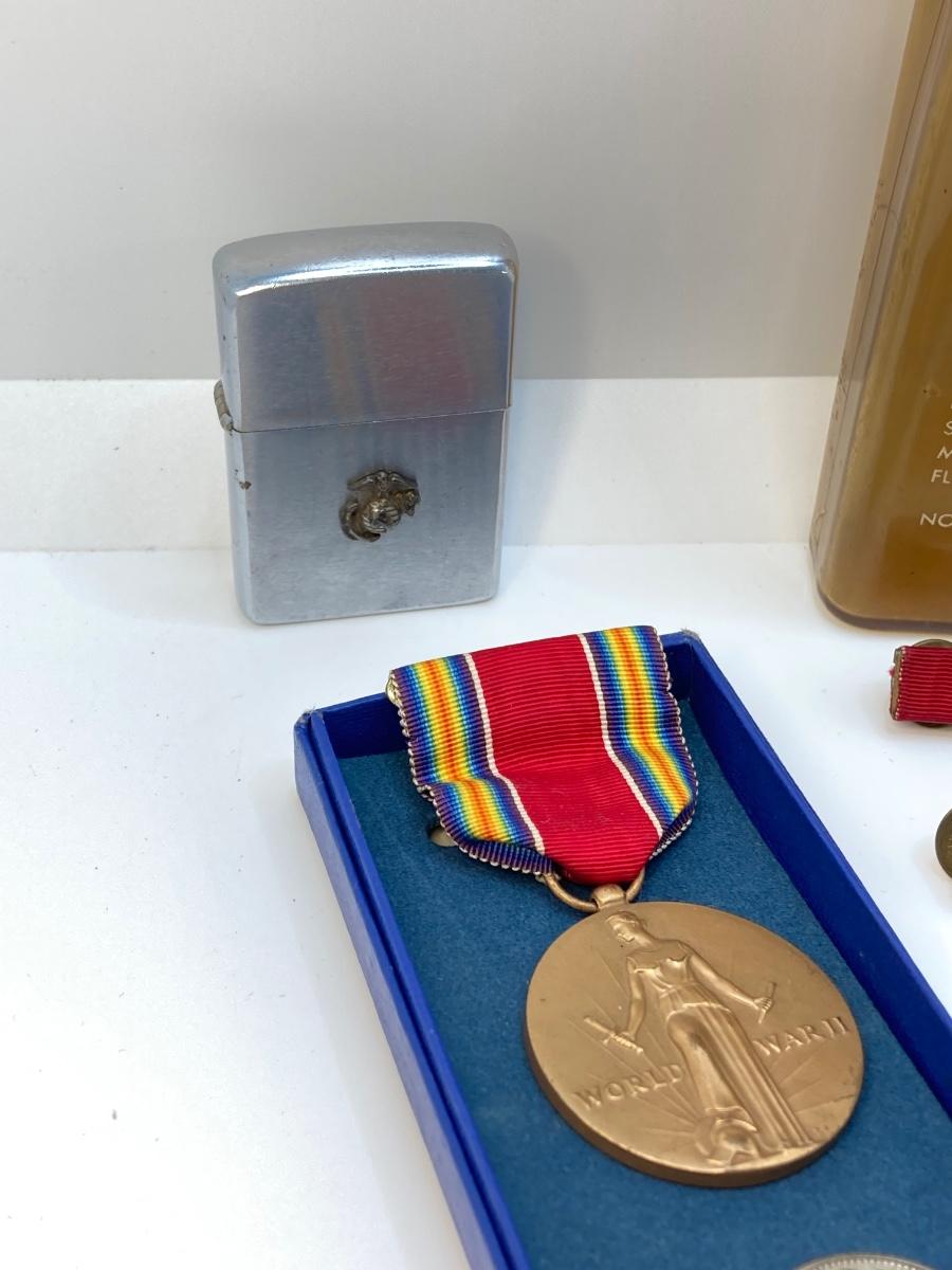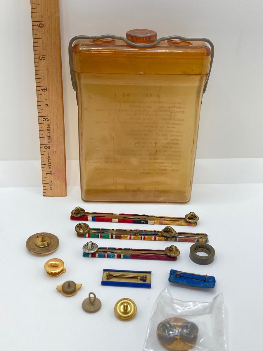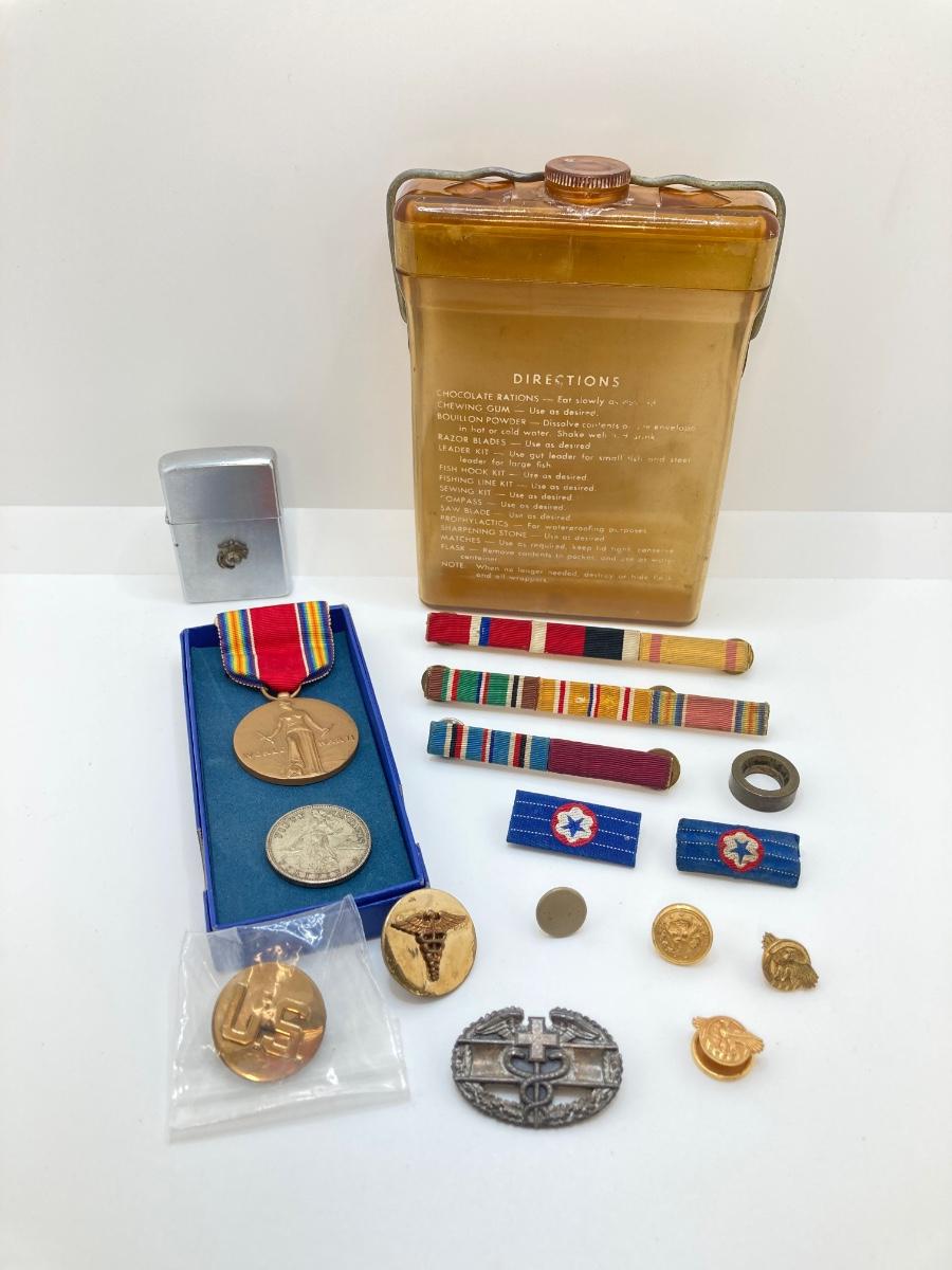 LOT 181: Vintage Rations Flask, Zippo Lighter, Military Memorabilia / Pins and More