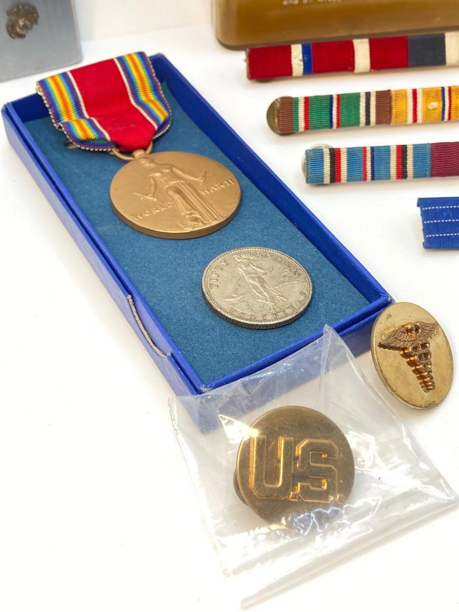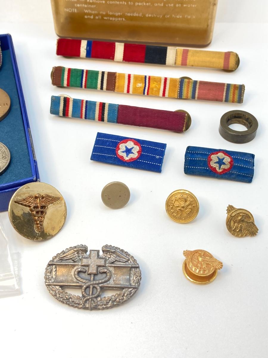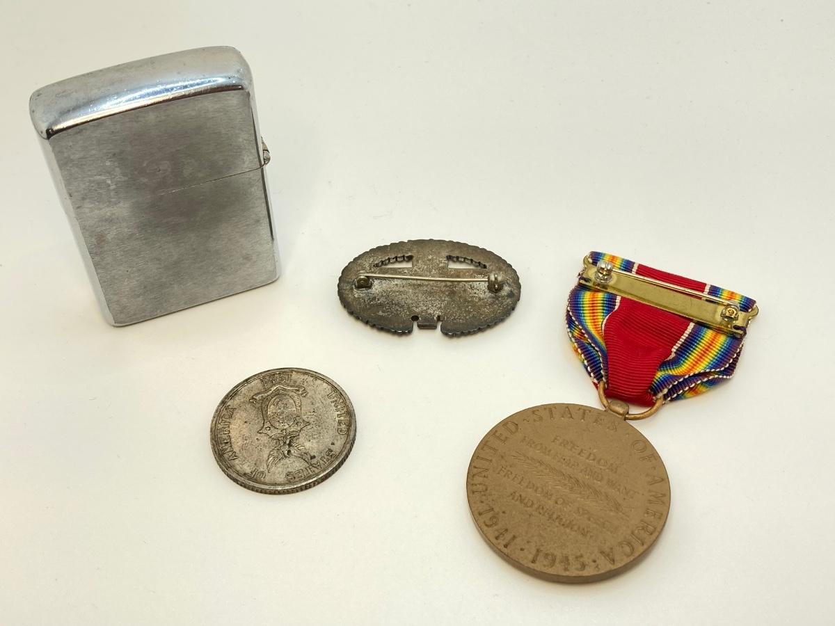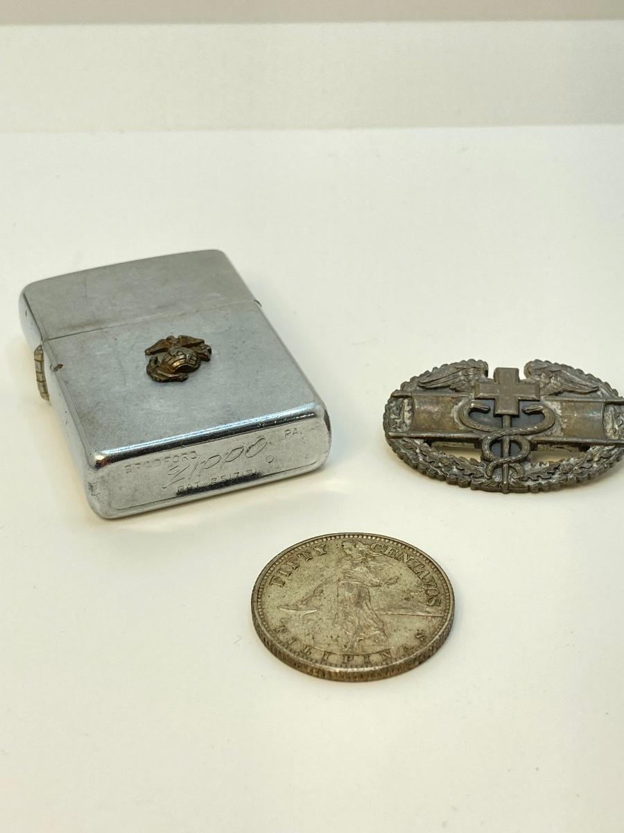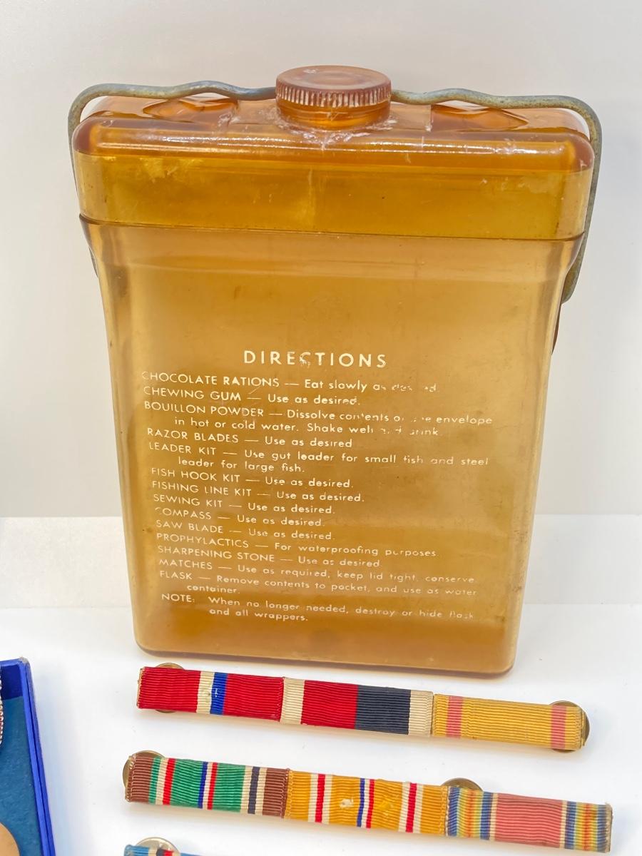 LOT 181: Vintage Rations Flask, Zippo Lighter, Military Memorabilia / Pins and More