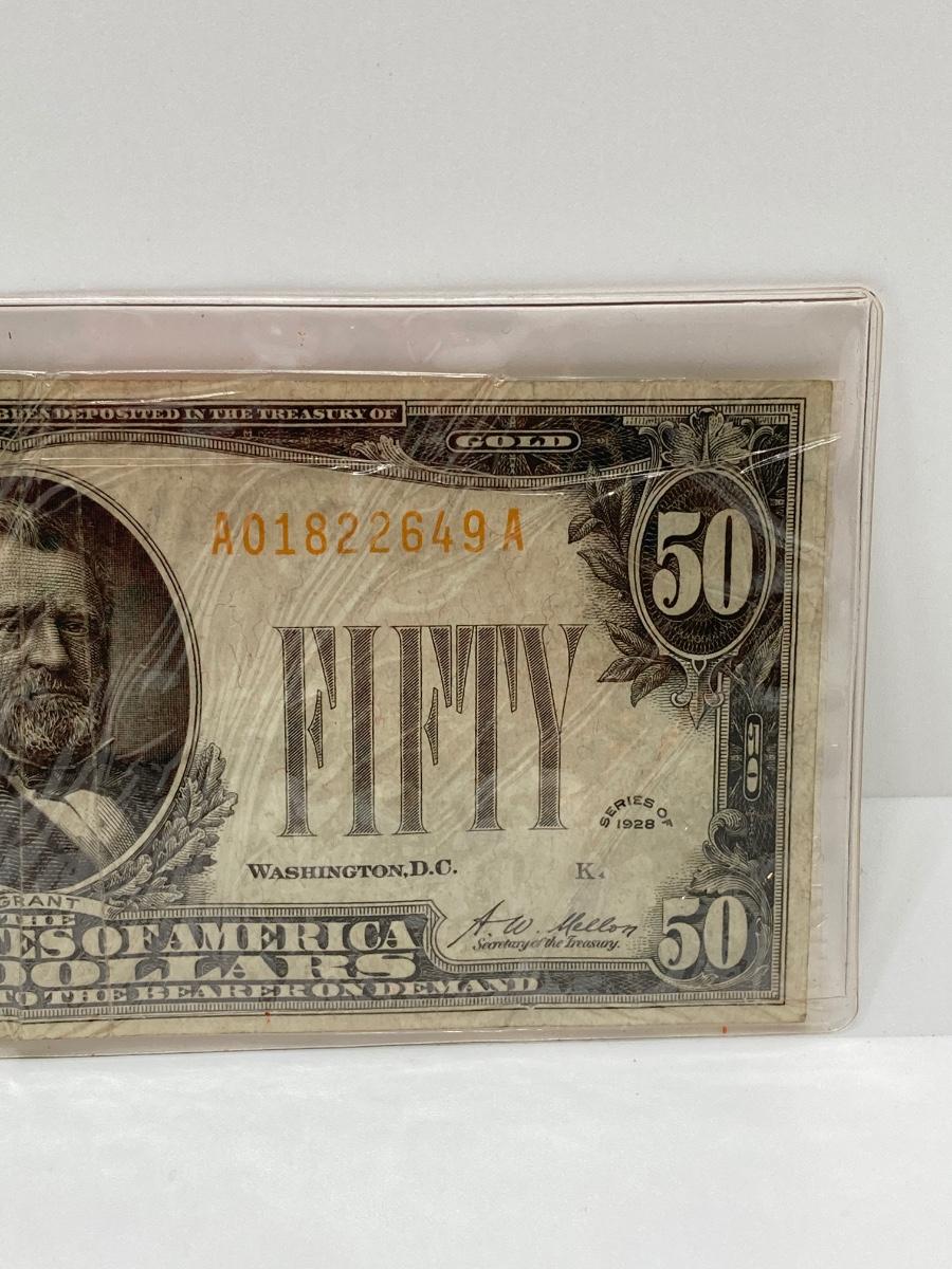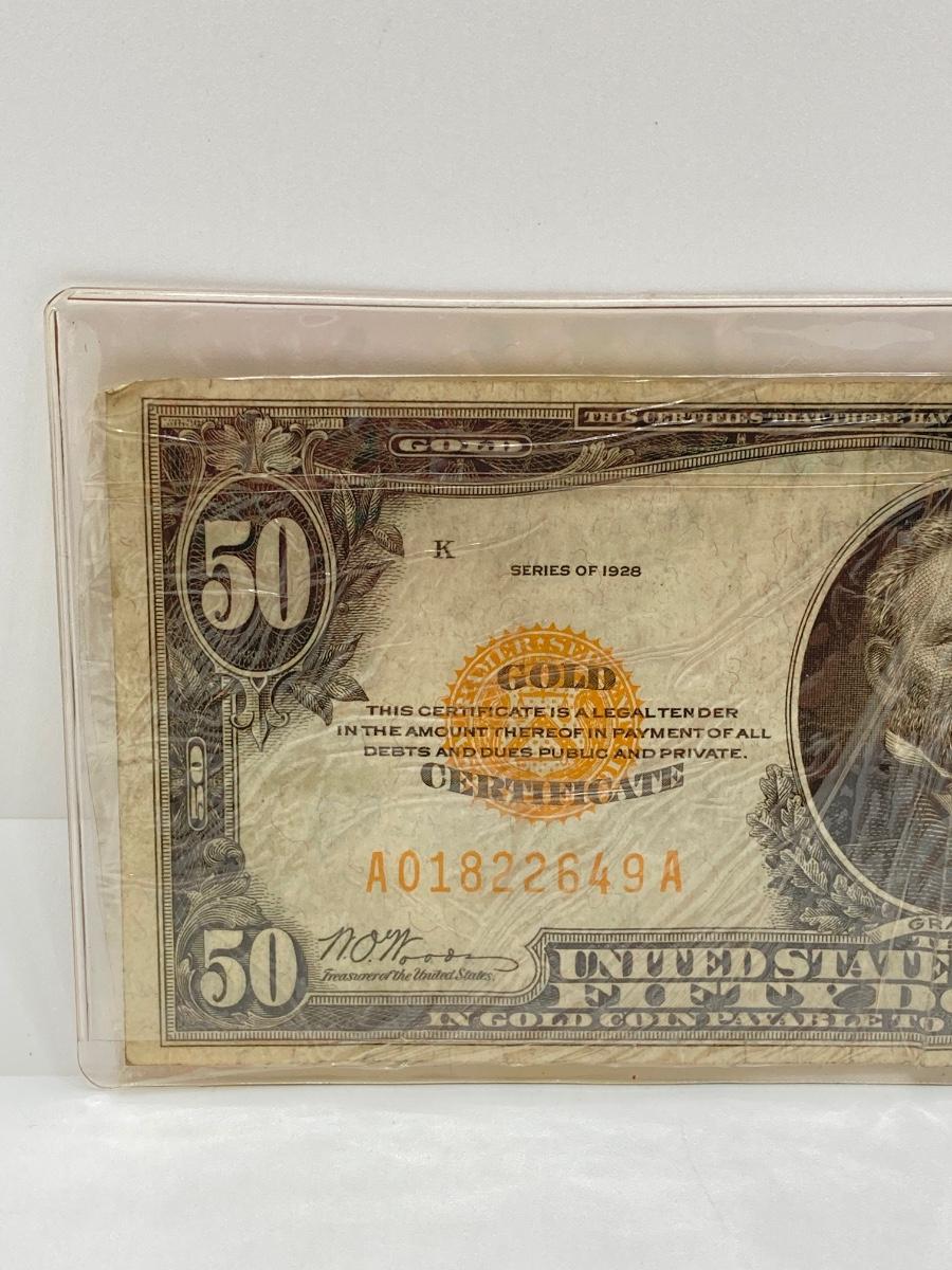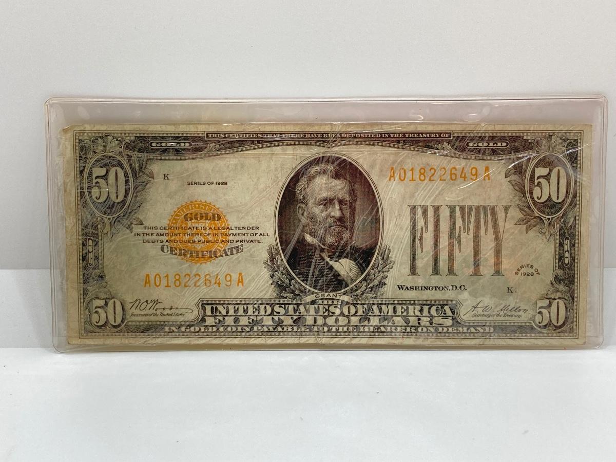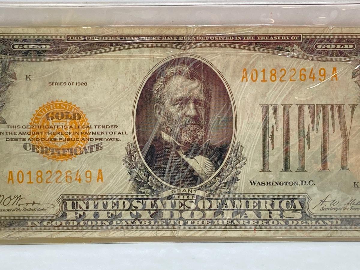 LOT 186: Vintage 1928 Gold Certificate Fifty Dollar Paper Currency