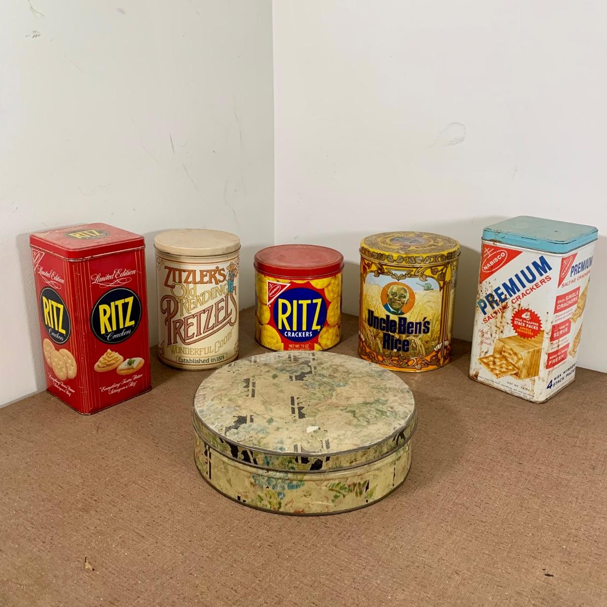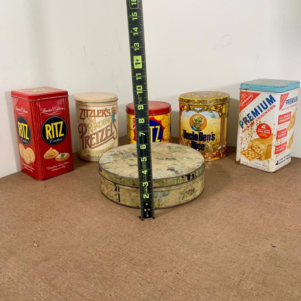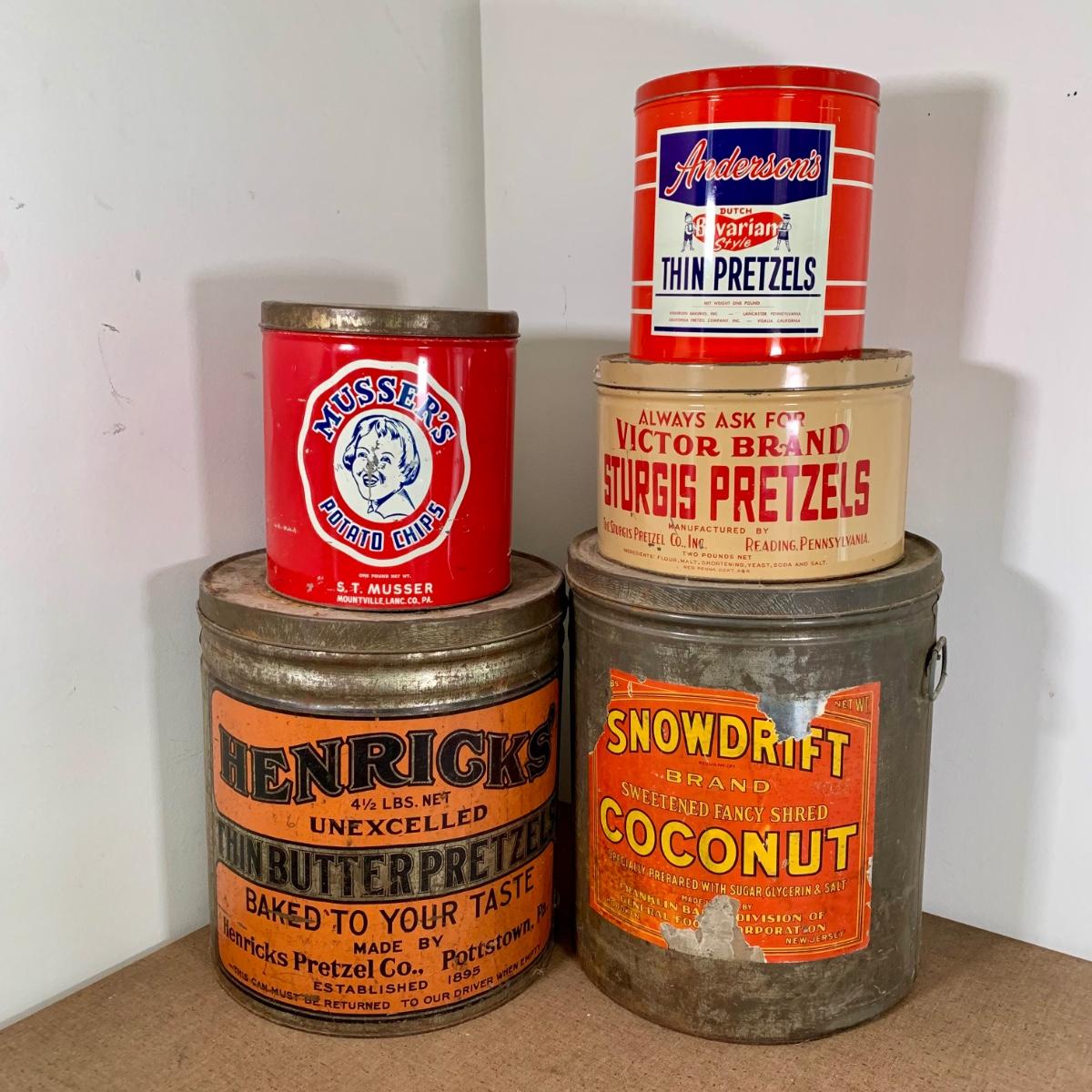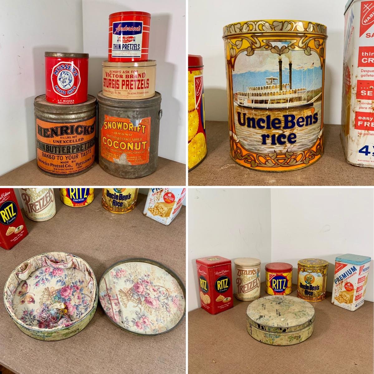 LOT 32 Y: Vintage TIn Collection: Snowdrift Shredded Coconut, Henrick's Thin Butter Pretzels, Musser's Potato Chips, Ritz Crackers, Uncle Bens Rice, & More