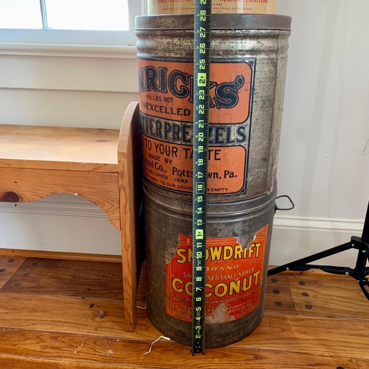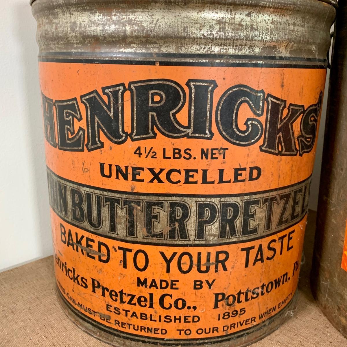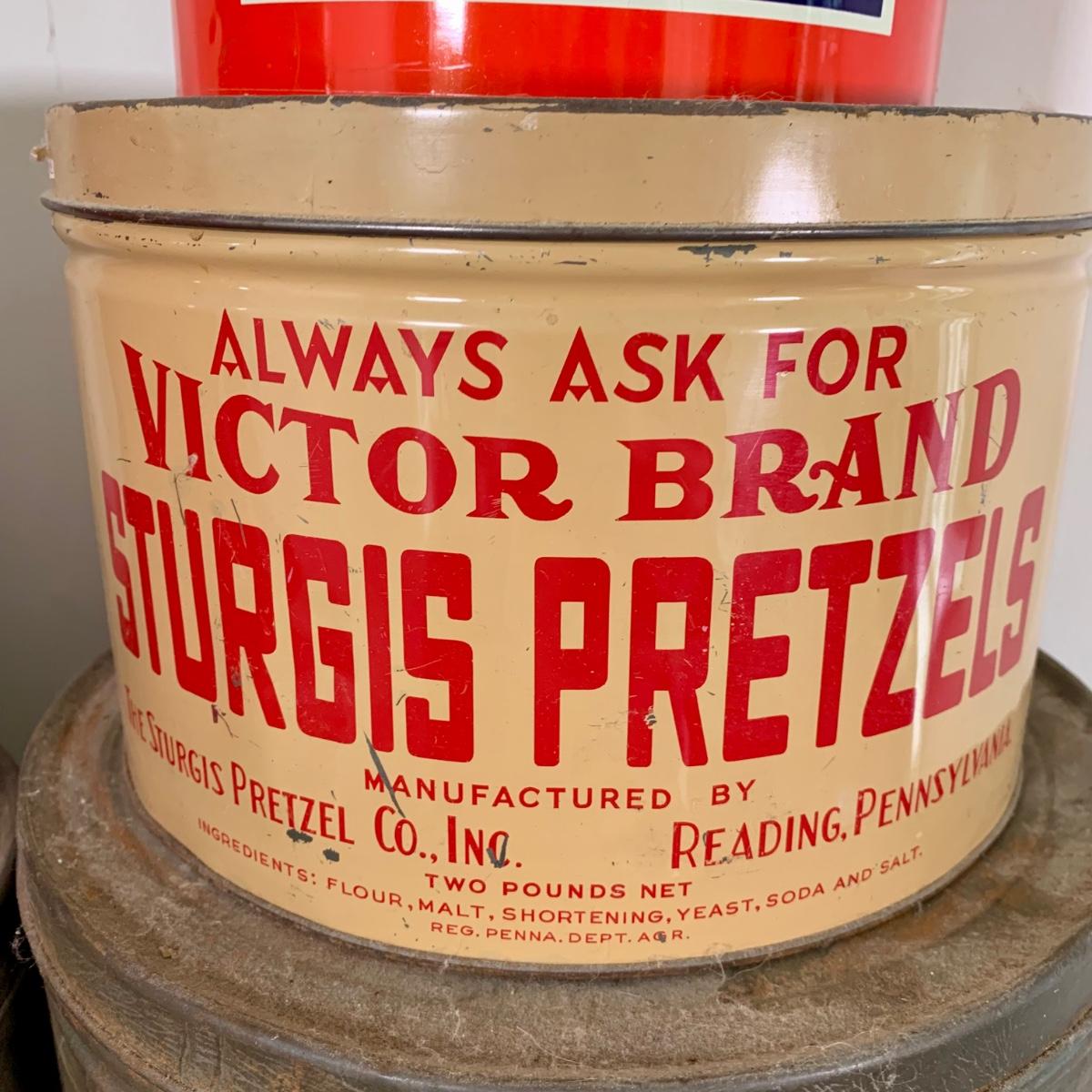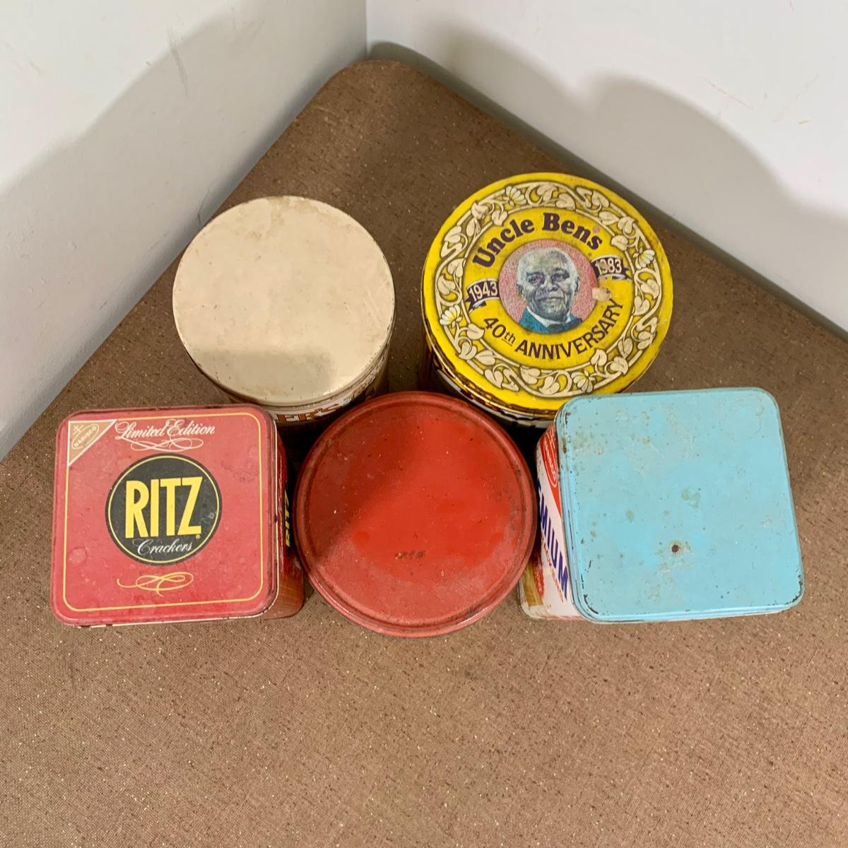 LOT 32 Y: Vintage TIn Collection: Snowdrift Shredded Coconut, Henrick's Thin Butter Pretzels, Musser's Potato Chips, Ritz Crackers, Uncle Bens Rice, & More
