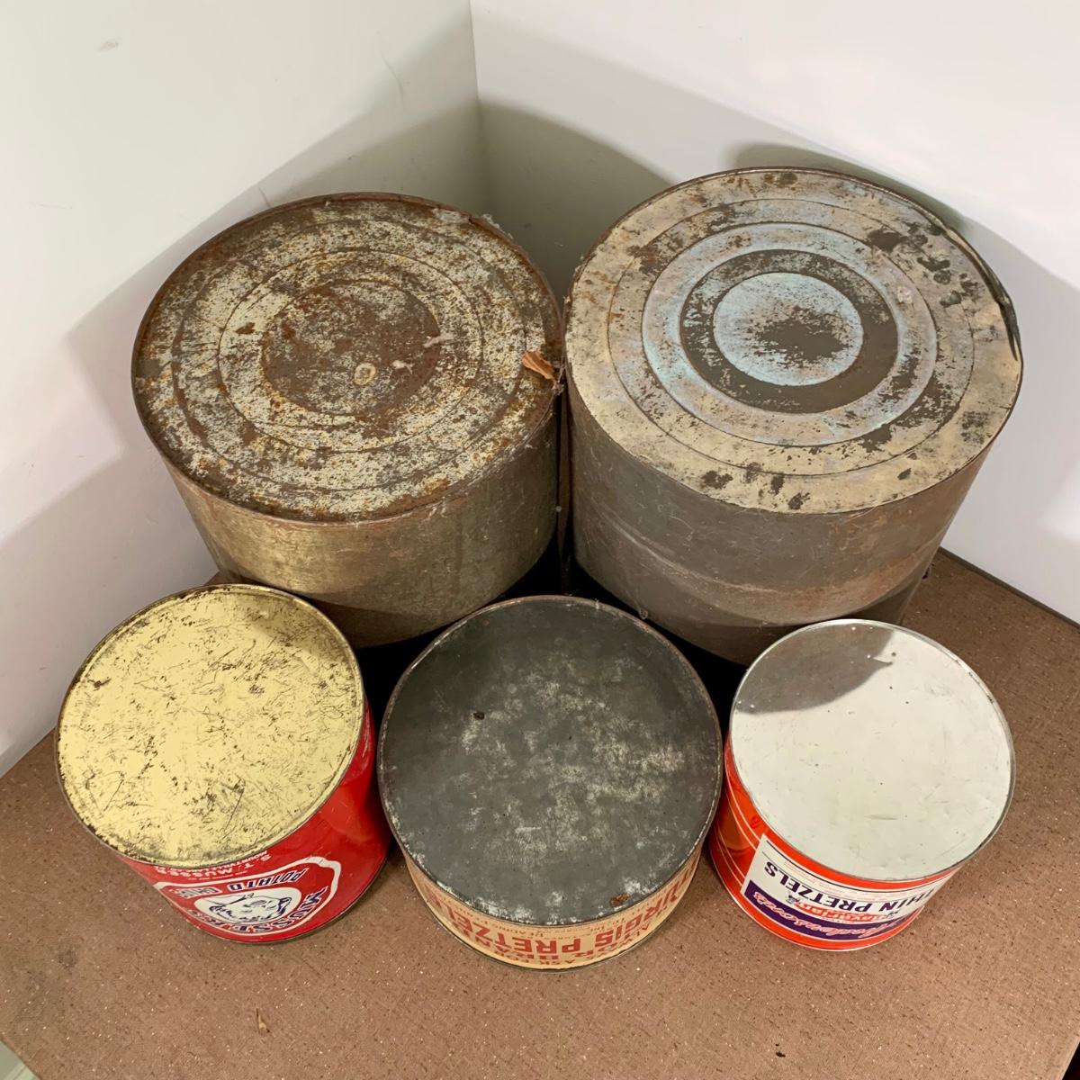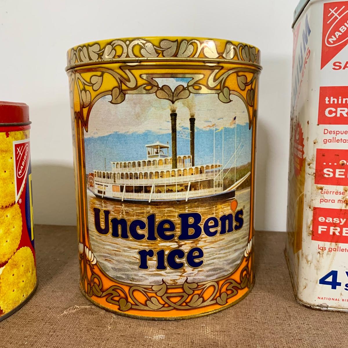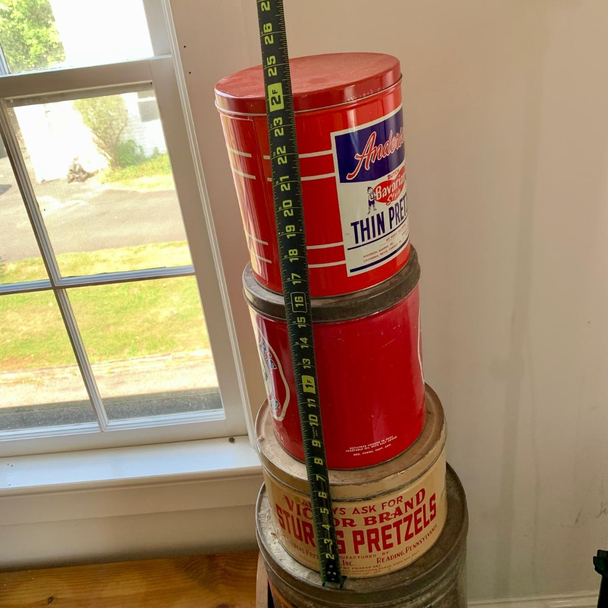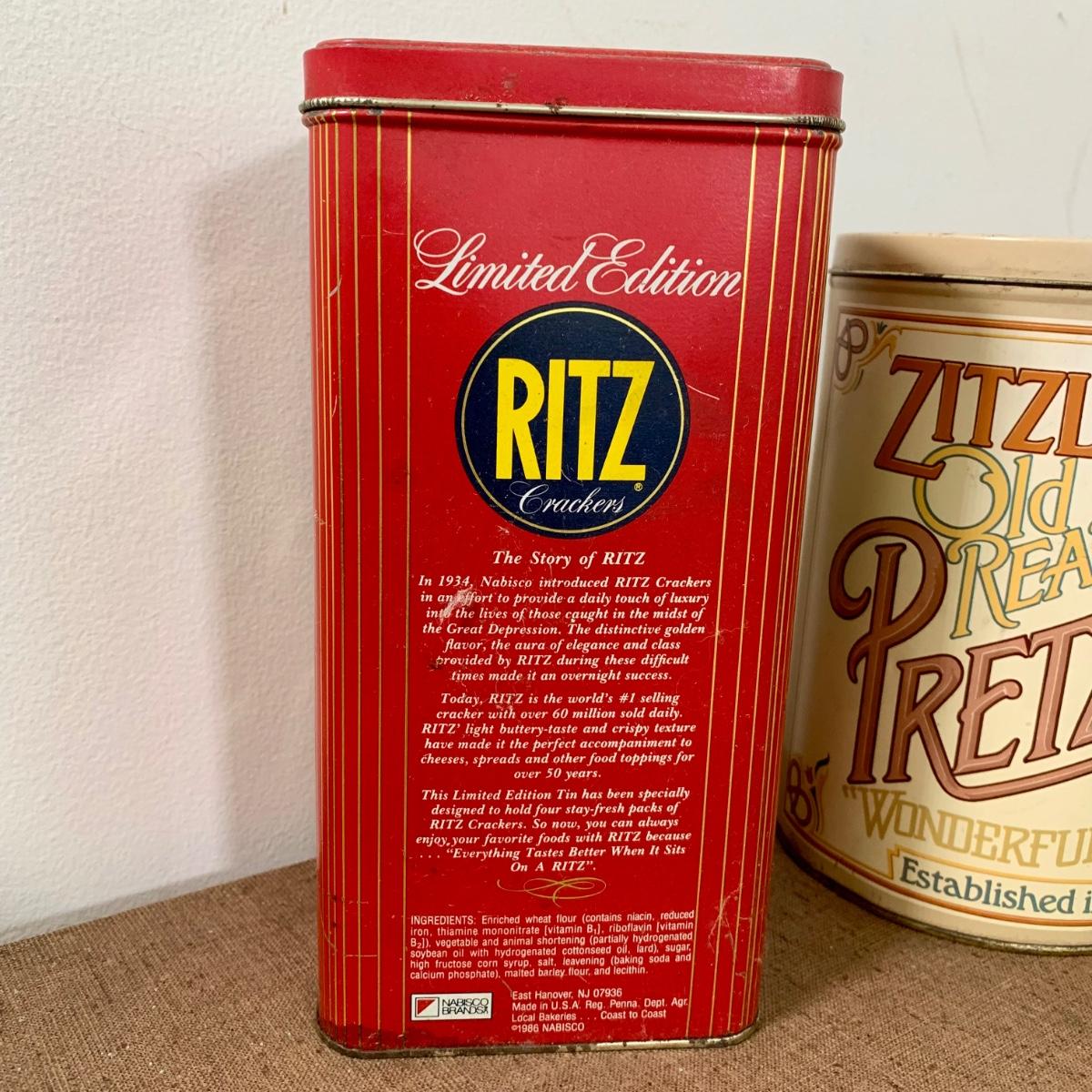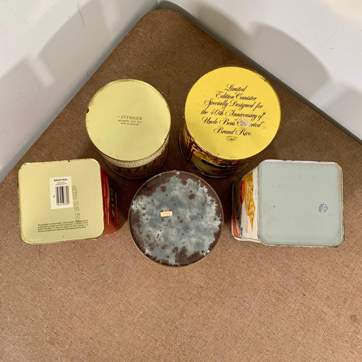 LOT 32 Y: Vintage TIn Collection: Snowdrift Shredded Coconut, Henrick's Thin Butter Pretzels, Musser's Potato Chips, Ritz Crackers, Uncle Bens Rice, & More