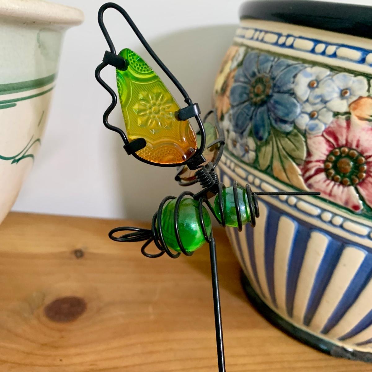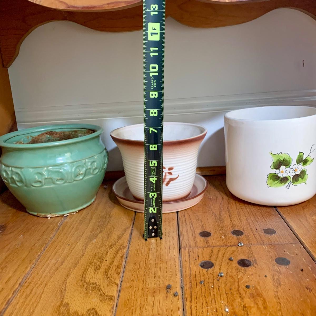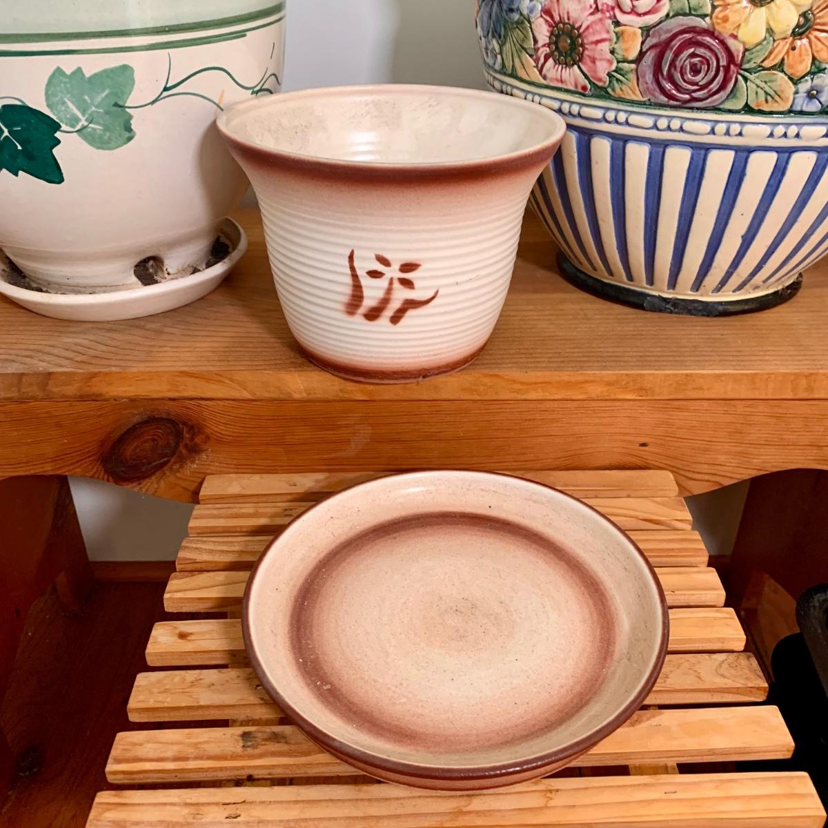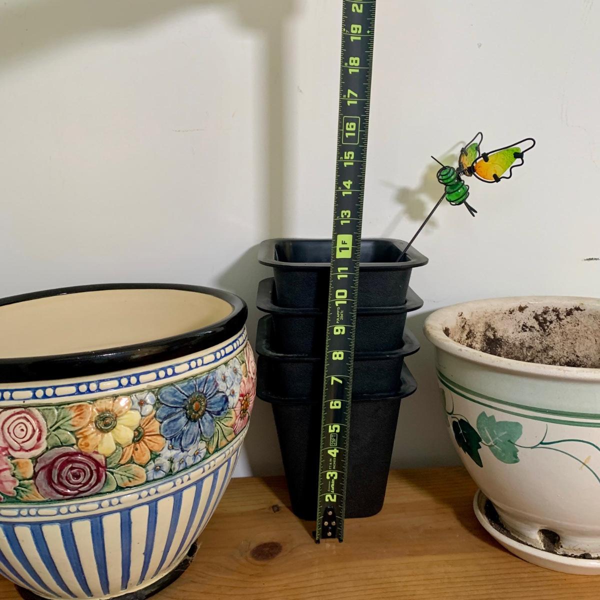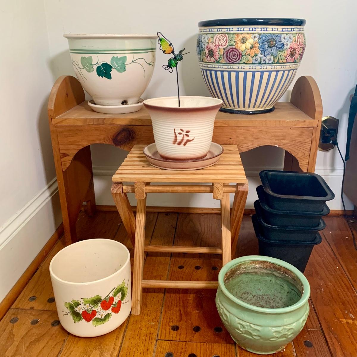 LOT 174 Y: Pretty Garden Planter Collection: Ceramic Plant Pots, Plant Stand, Small Wooden Garden Bench, Stained Glass Humming Bird Garden Decor & Plastic Plant Pots
