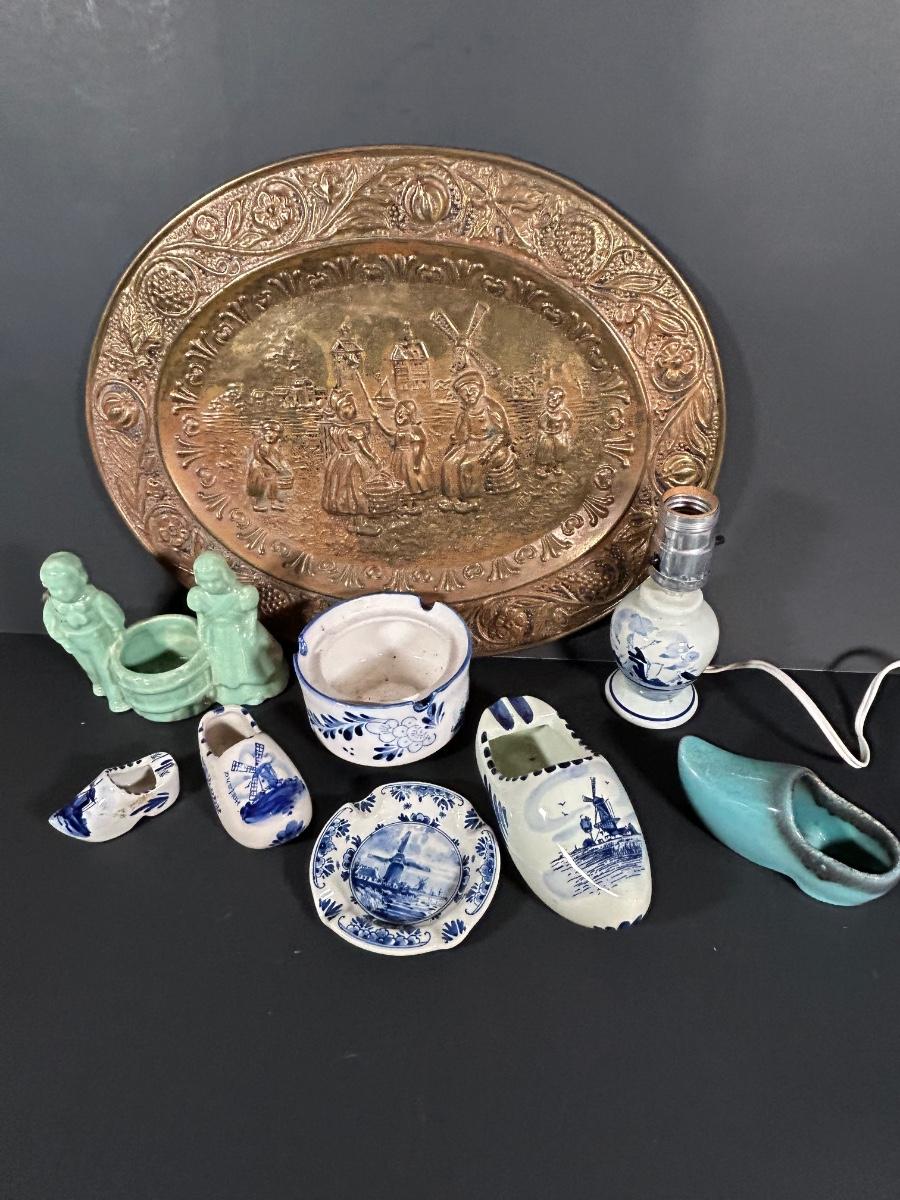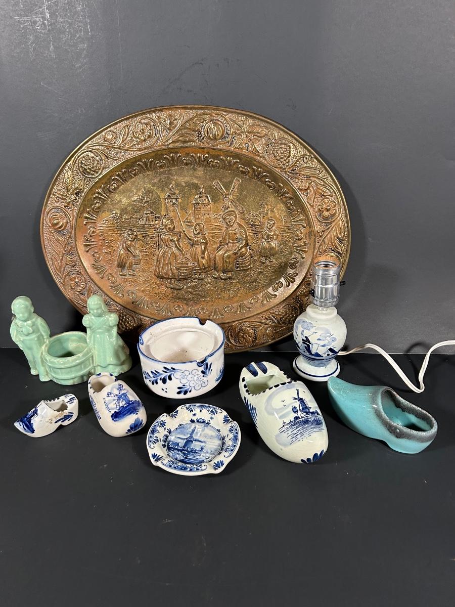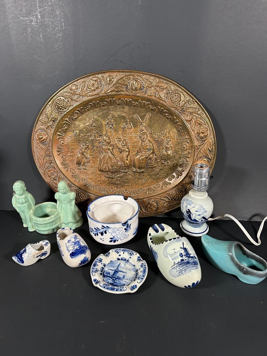 LOT 36 S: Delpts Blue Windwill Ashtray, Blue Windmill Porcelain, Lamp, and Shoes, and Other Vintage Dutch Themed Decor