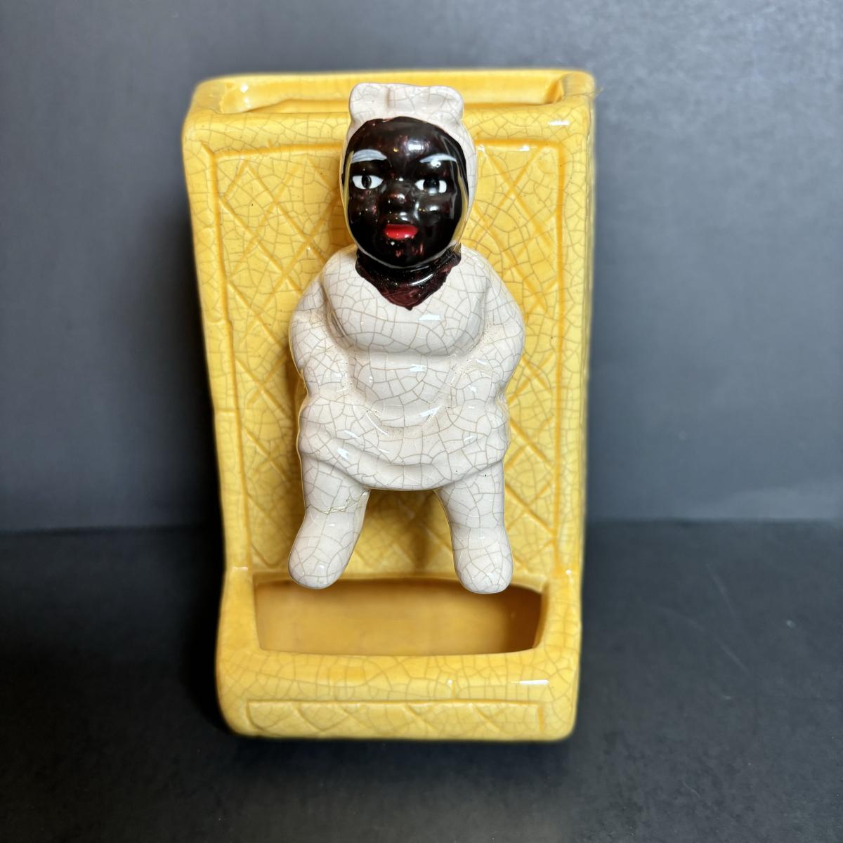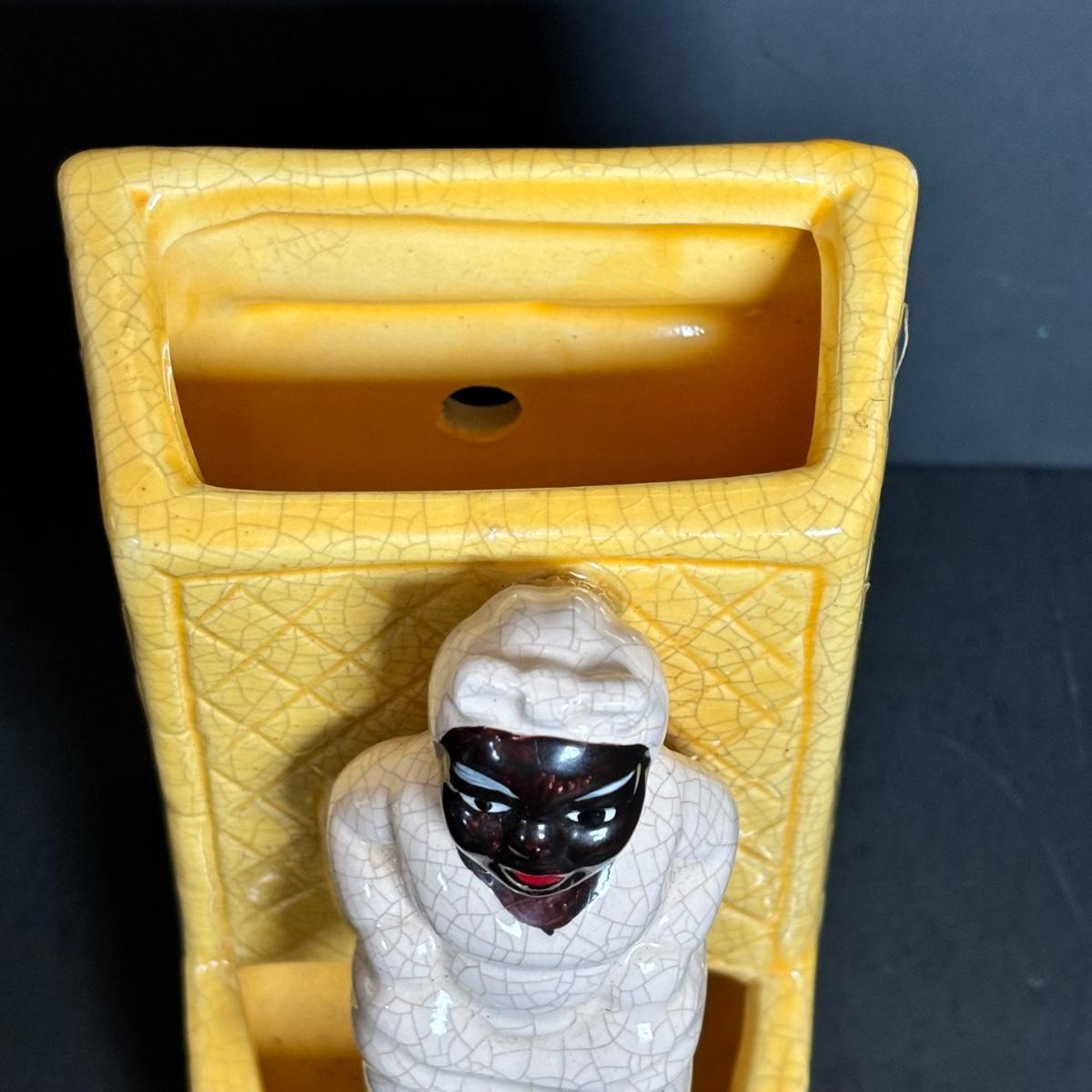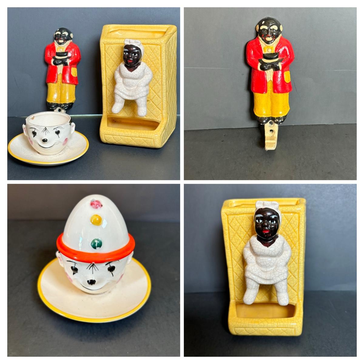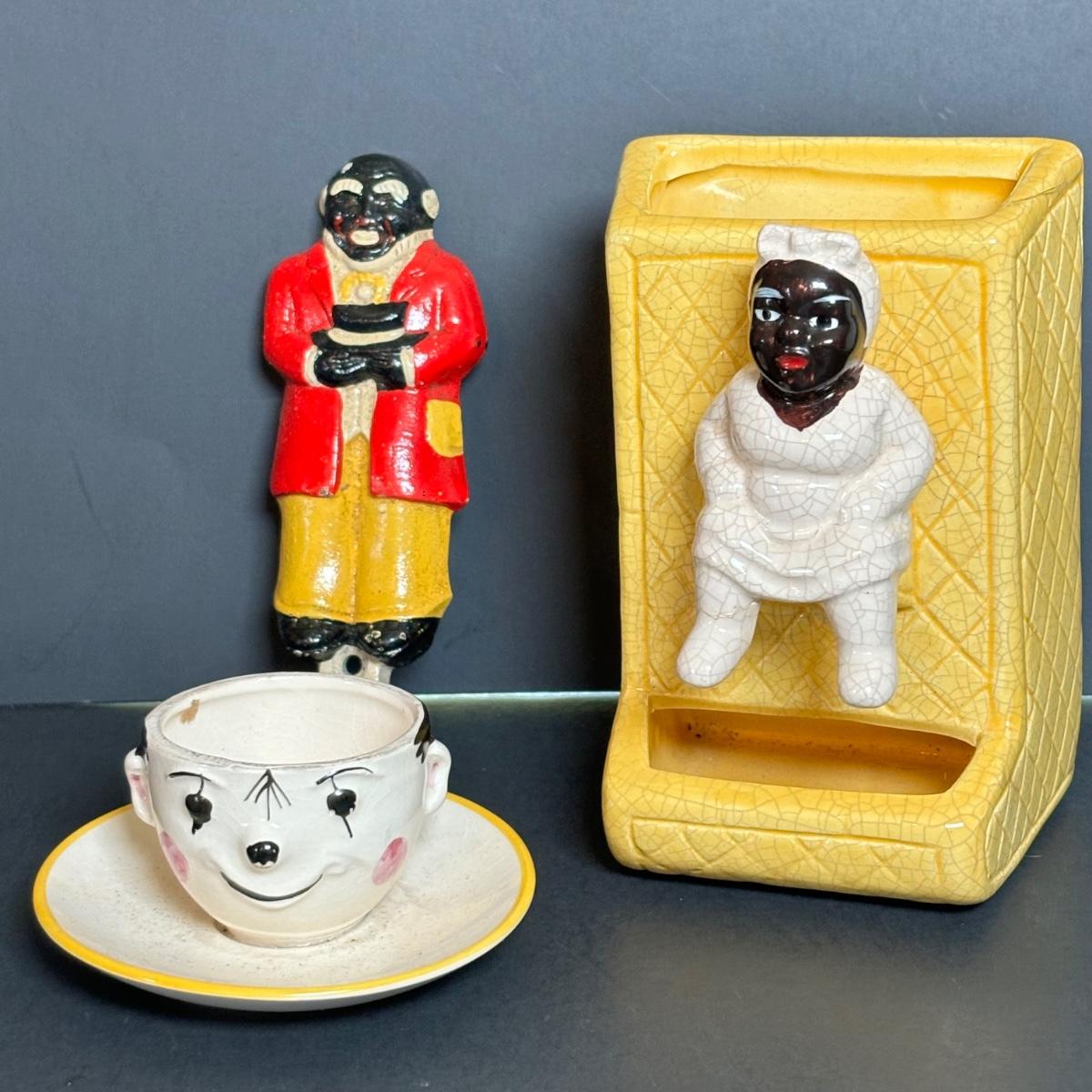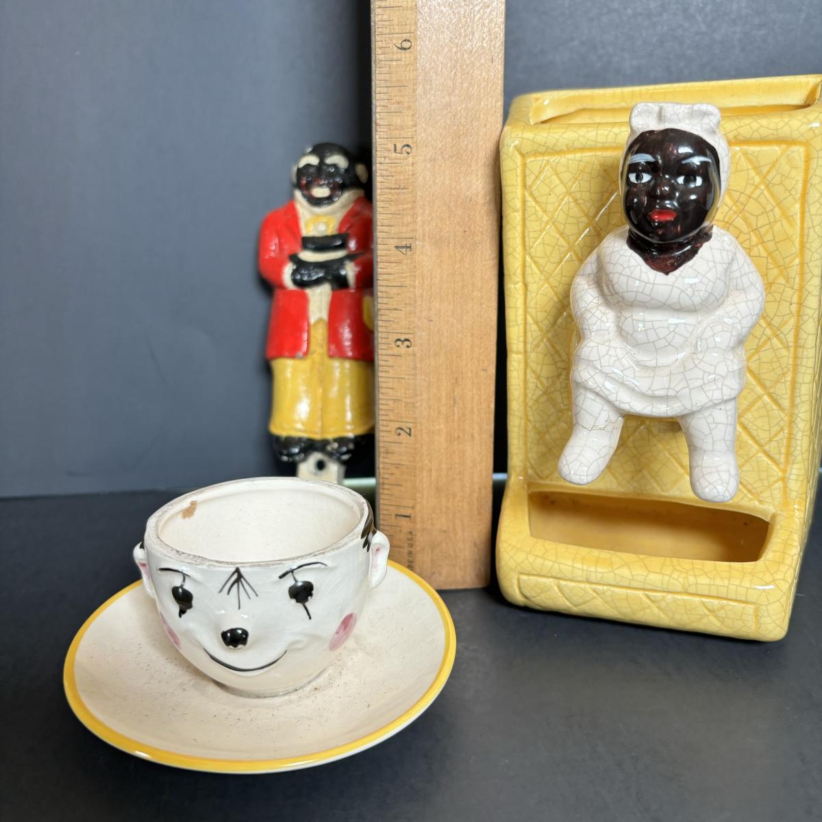 LOT 55: Vintage Black Americana Collection - McCoy Mammy Match Holder, Cast Iron Uncle Moses Hook and Stacking Clown Cup, Saucer and Shaker Lid Made in Japan