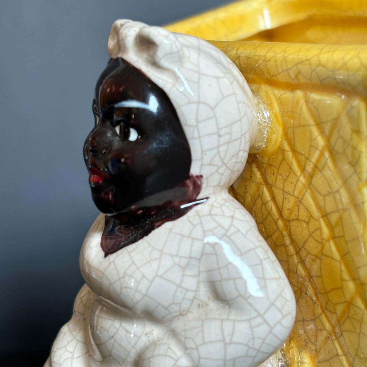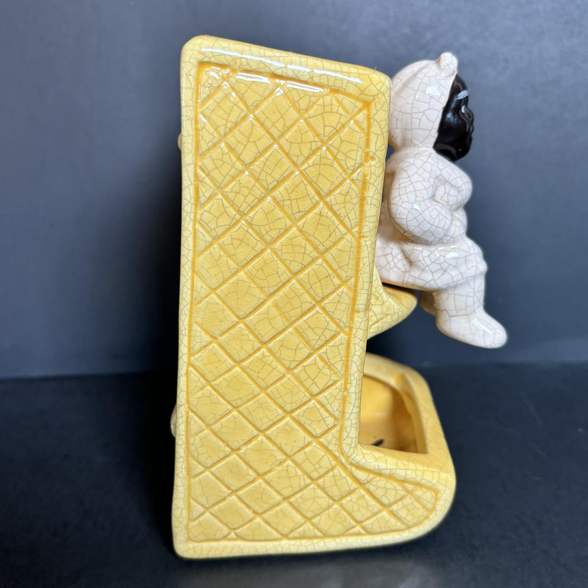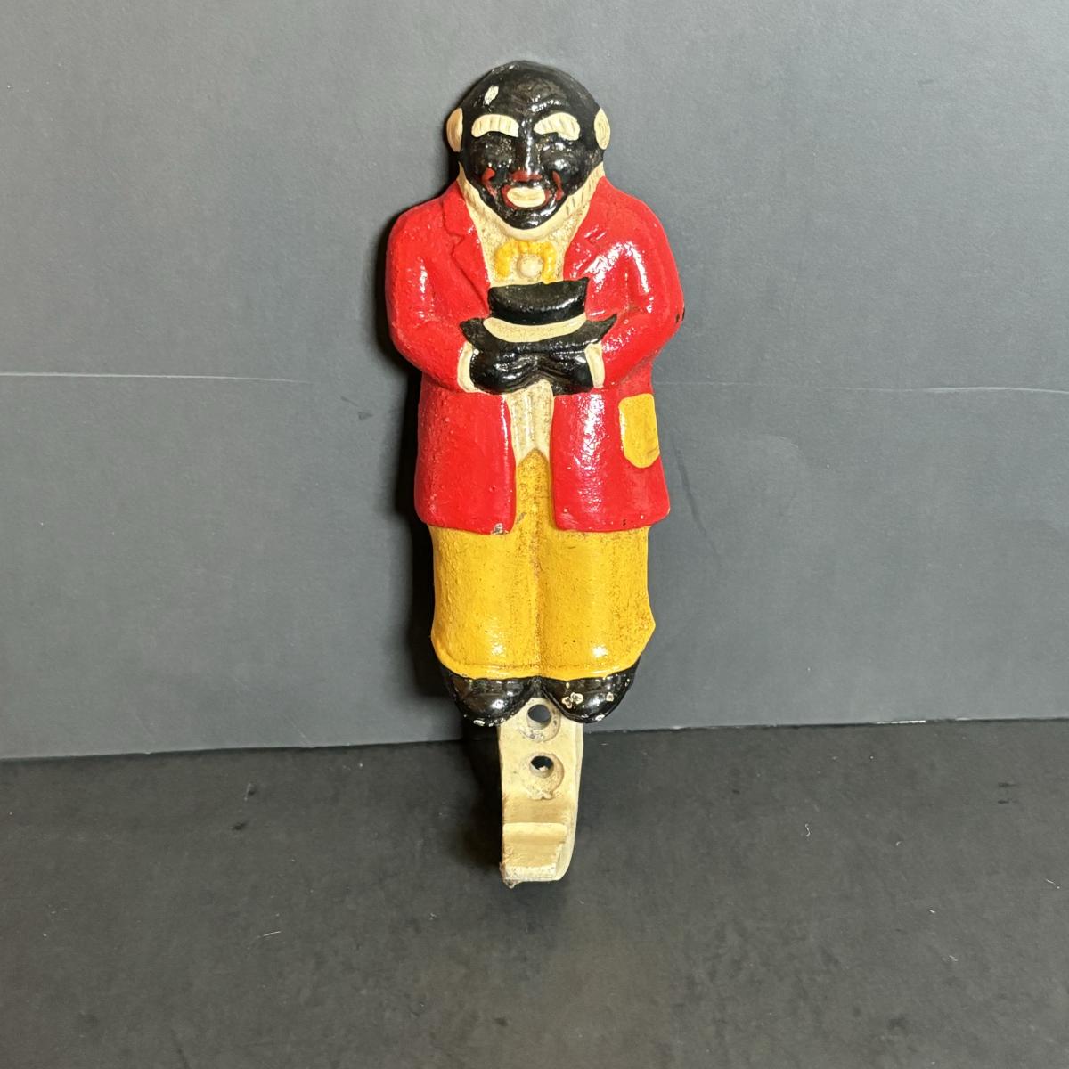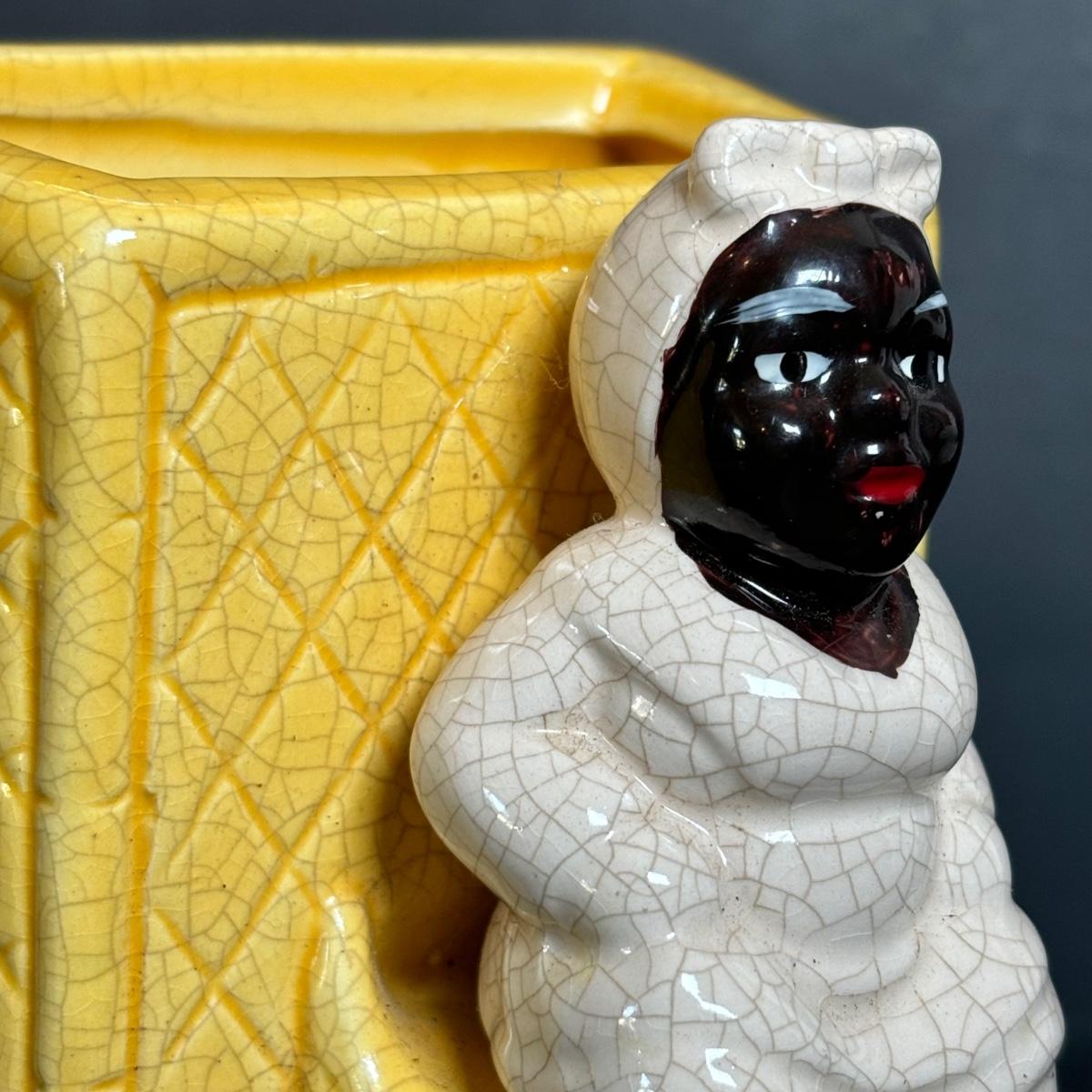 LOT 55: Vintage Black Americana Collection - McCoy Mammy Match Holder, Cast Iron Uncle Moses Hook and Stacking Clown Cup, Saucer and Shaker Lid Made in Japan