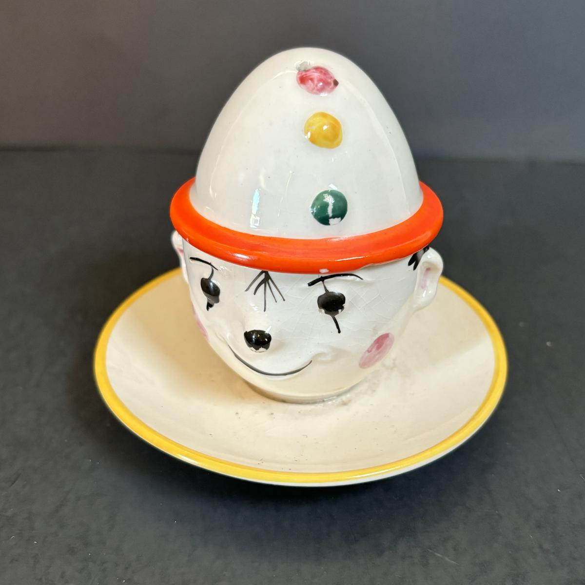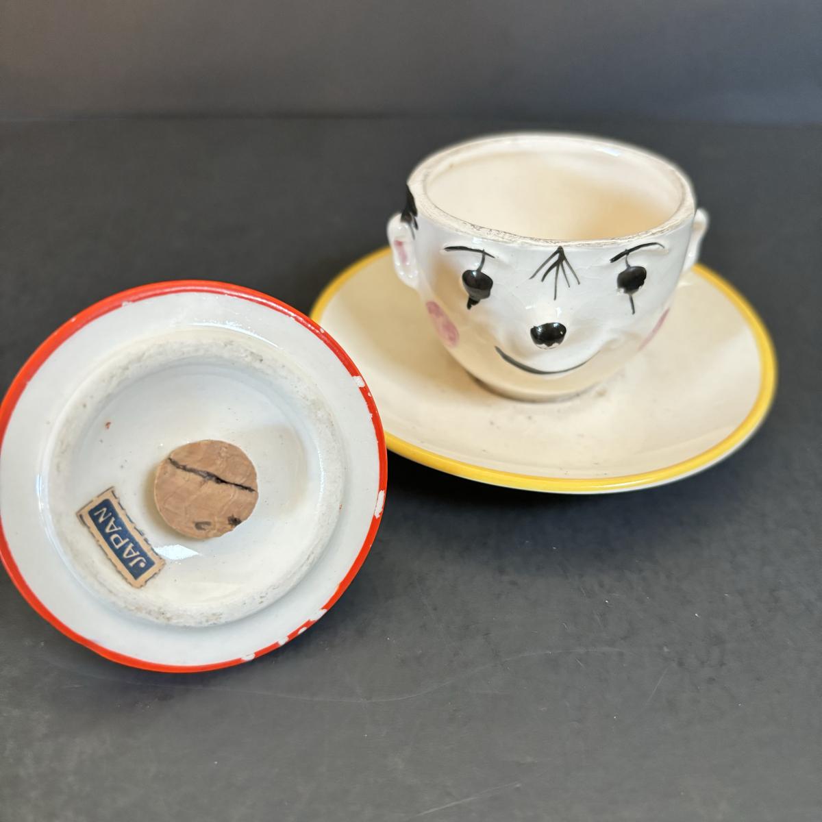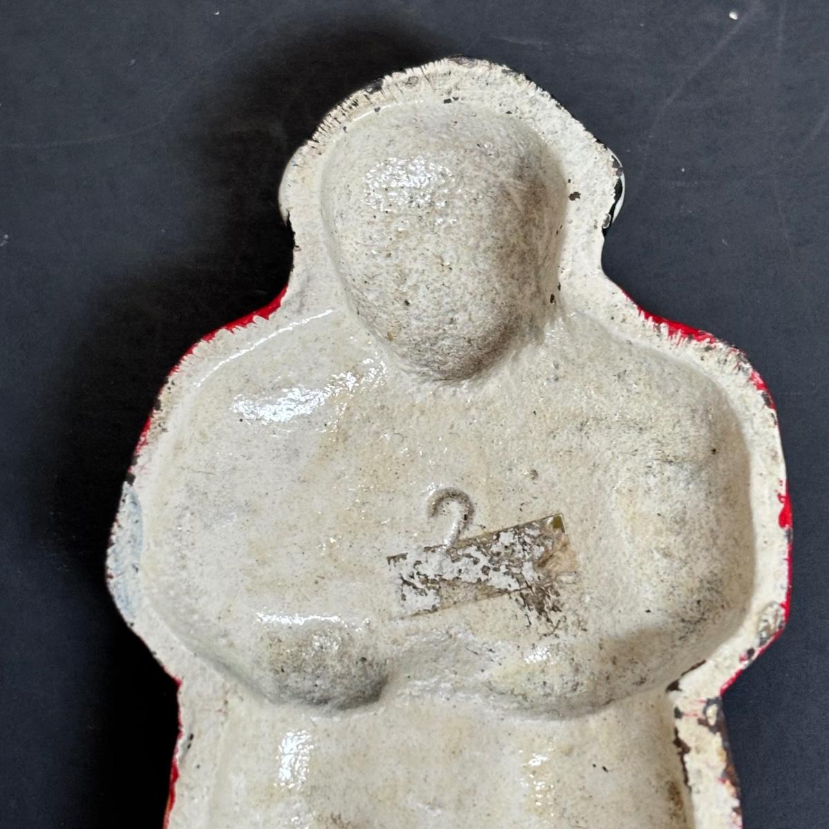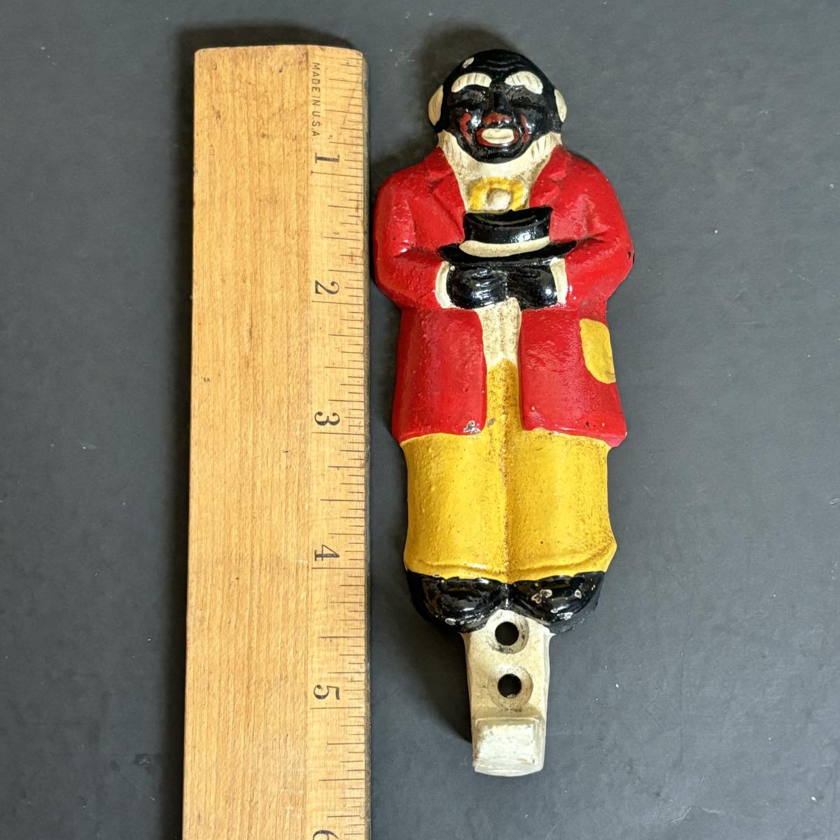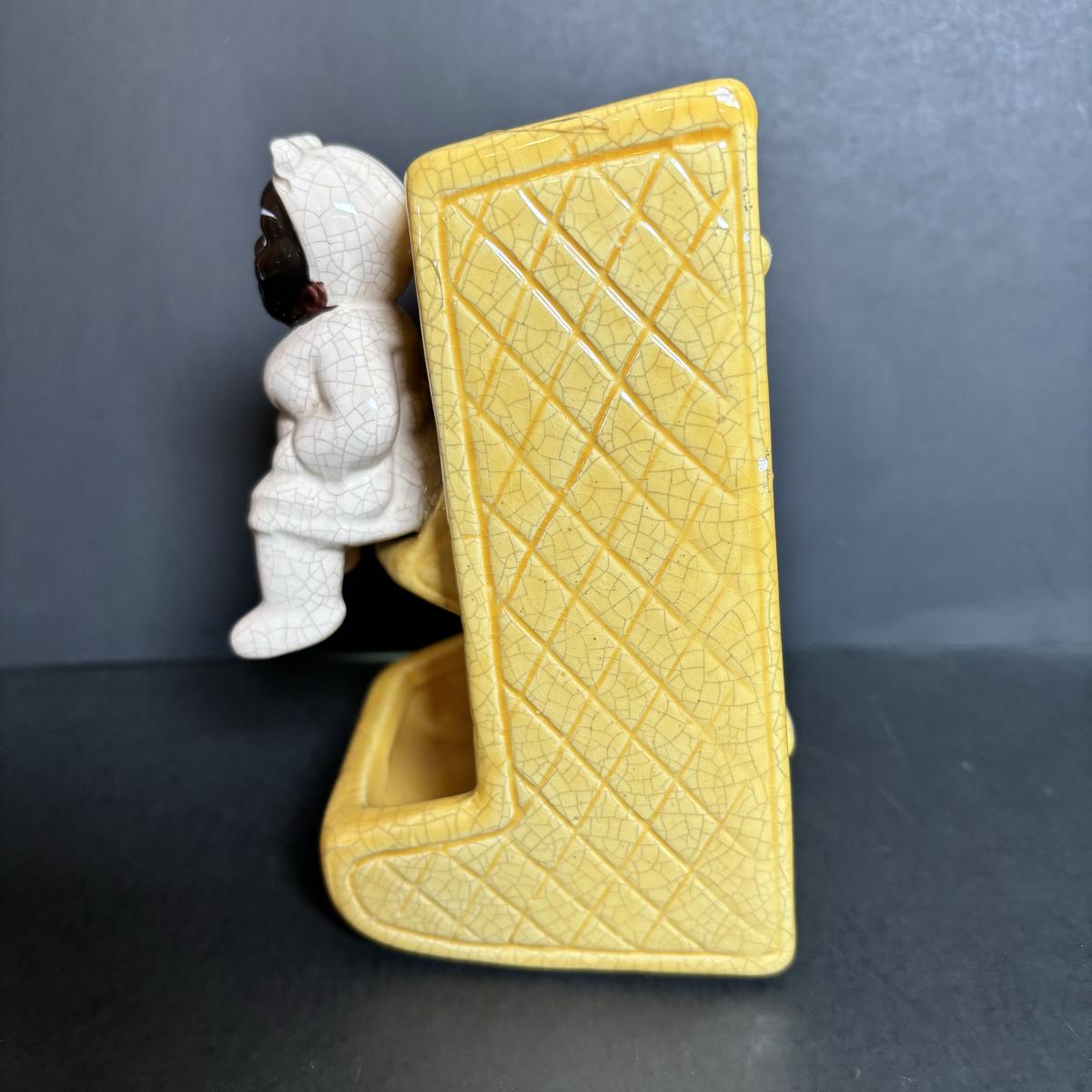LOT 55: Vintage Black Americana Collection - McCoy Mammy Match Holder, Cast Iron Uncle Moses Hook and Stacking Clown Cup, Saucer and Shaker Lid Made in Japan