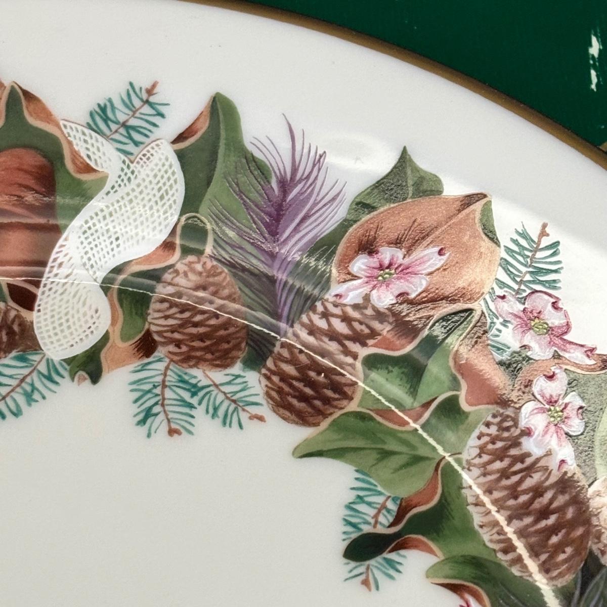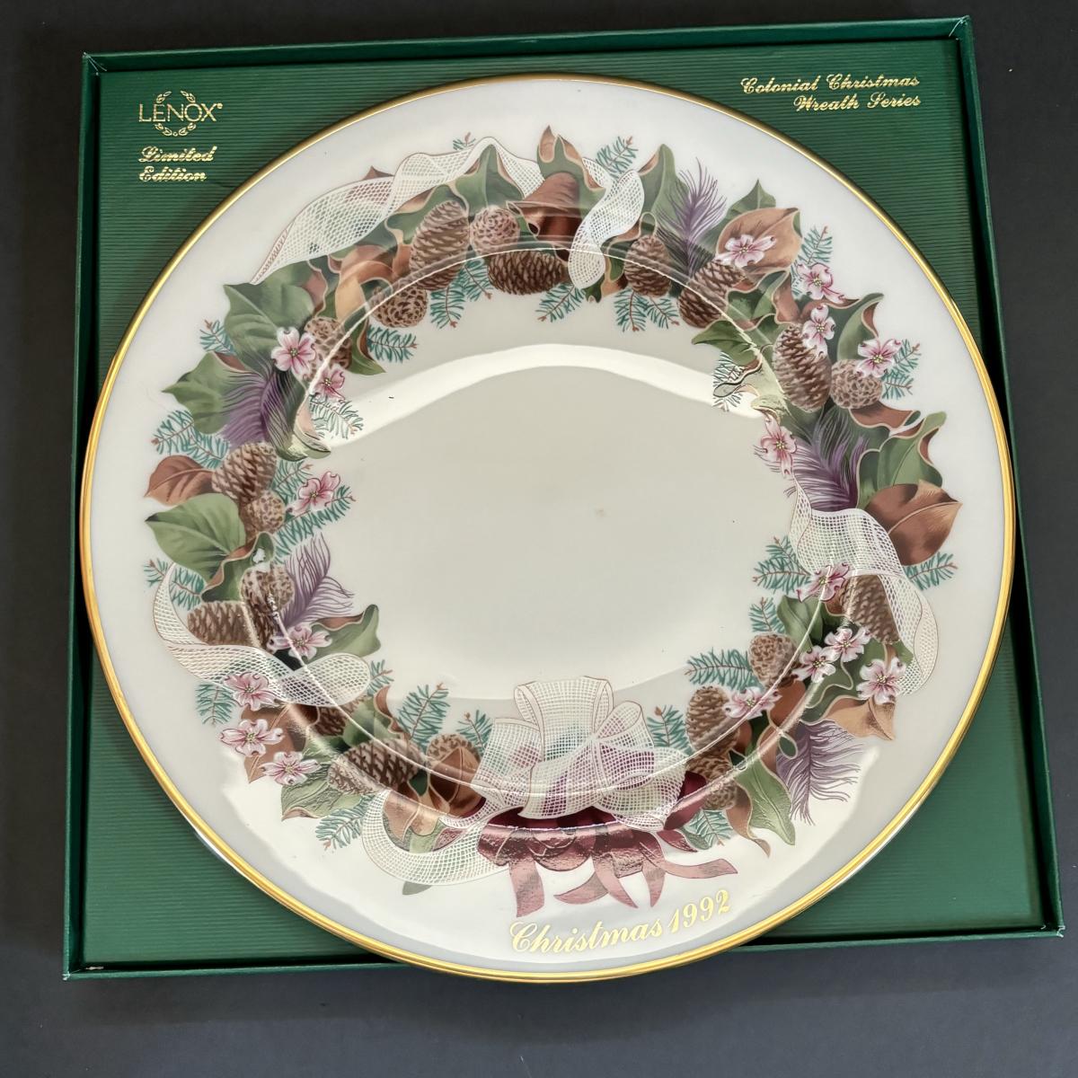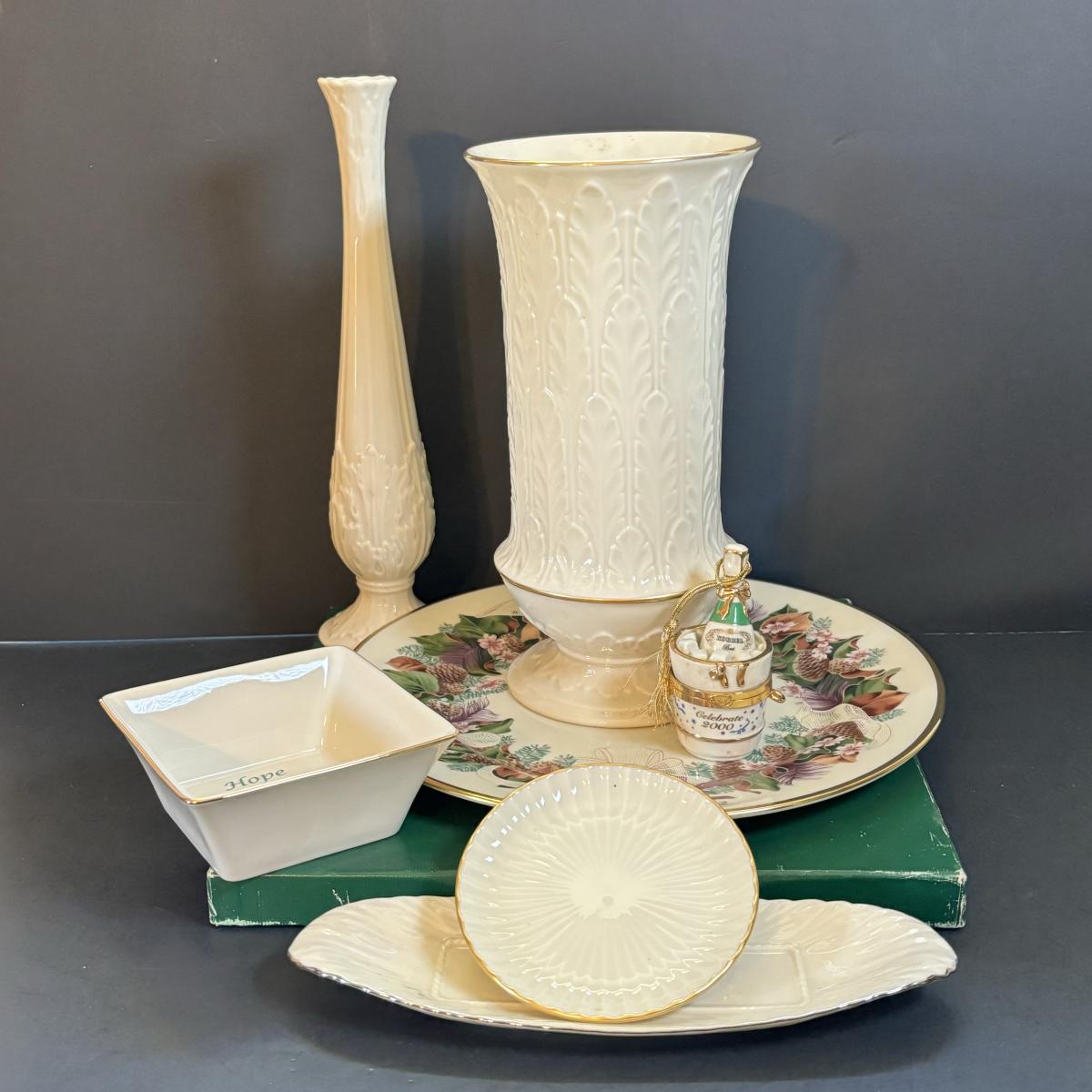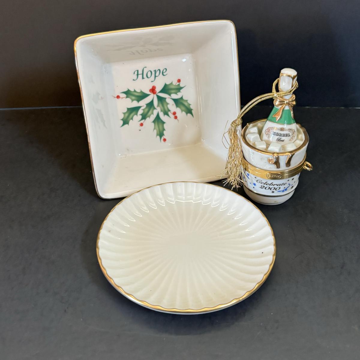 LOT 78: Collection of Lenox China Including Woodland Budvase and Dish, Holy Berry Hope Dish, Scalloped Plate, Ornament, Collector Plate and Large Acanthus Leaf Vase