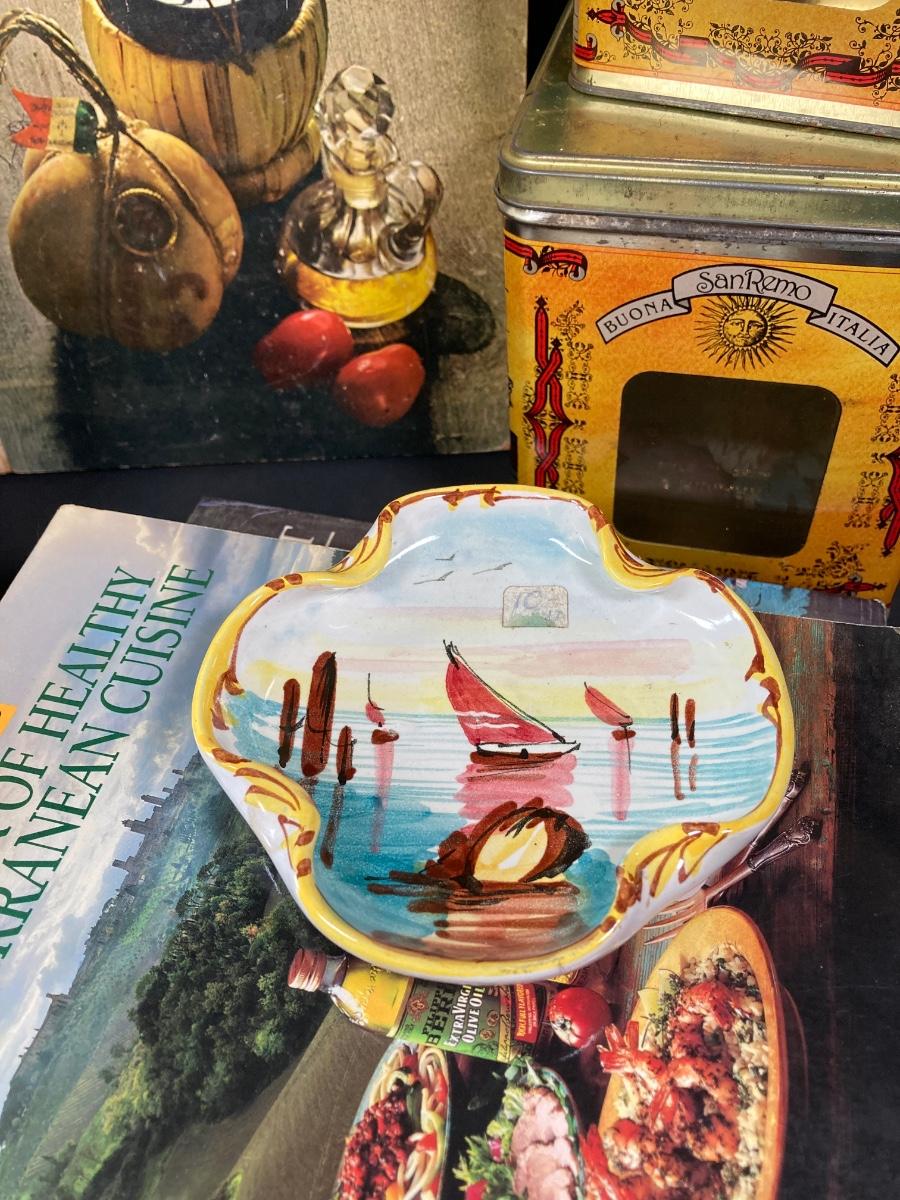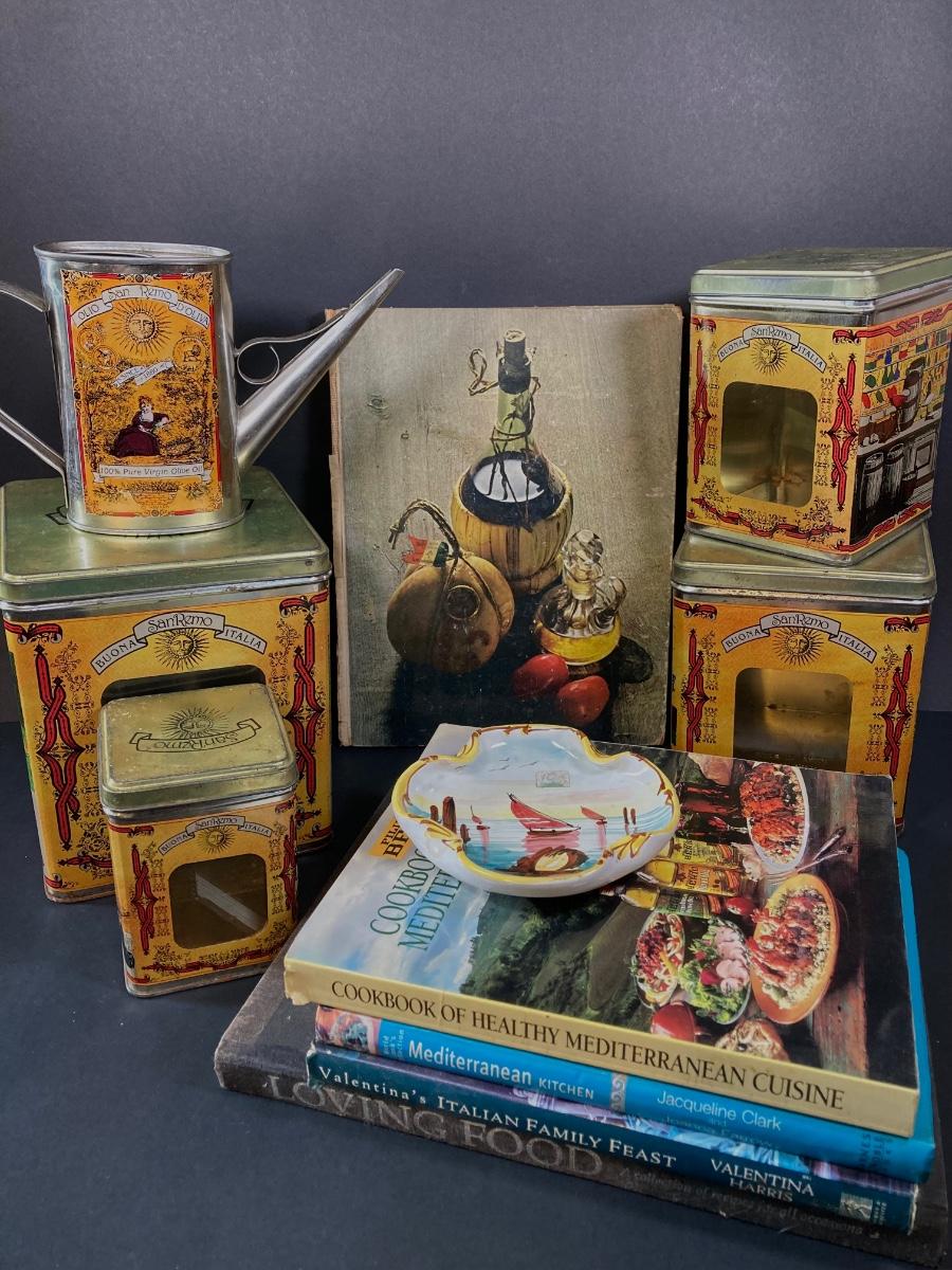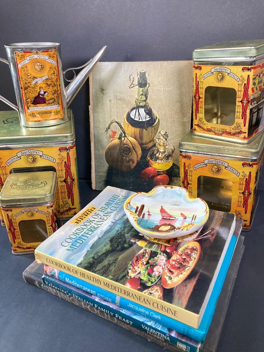 LOT 91D: A Touch of Italy - San Remo Olive Oil Tins, Wall Art, Ceramic Dish and Cookbooks