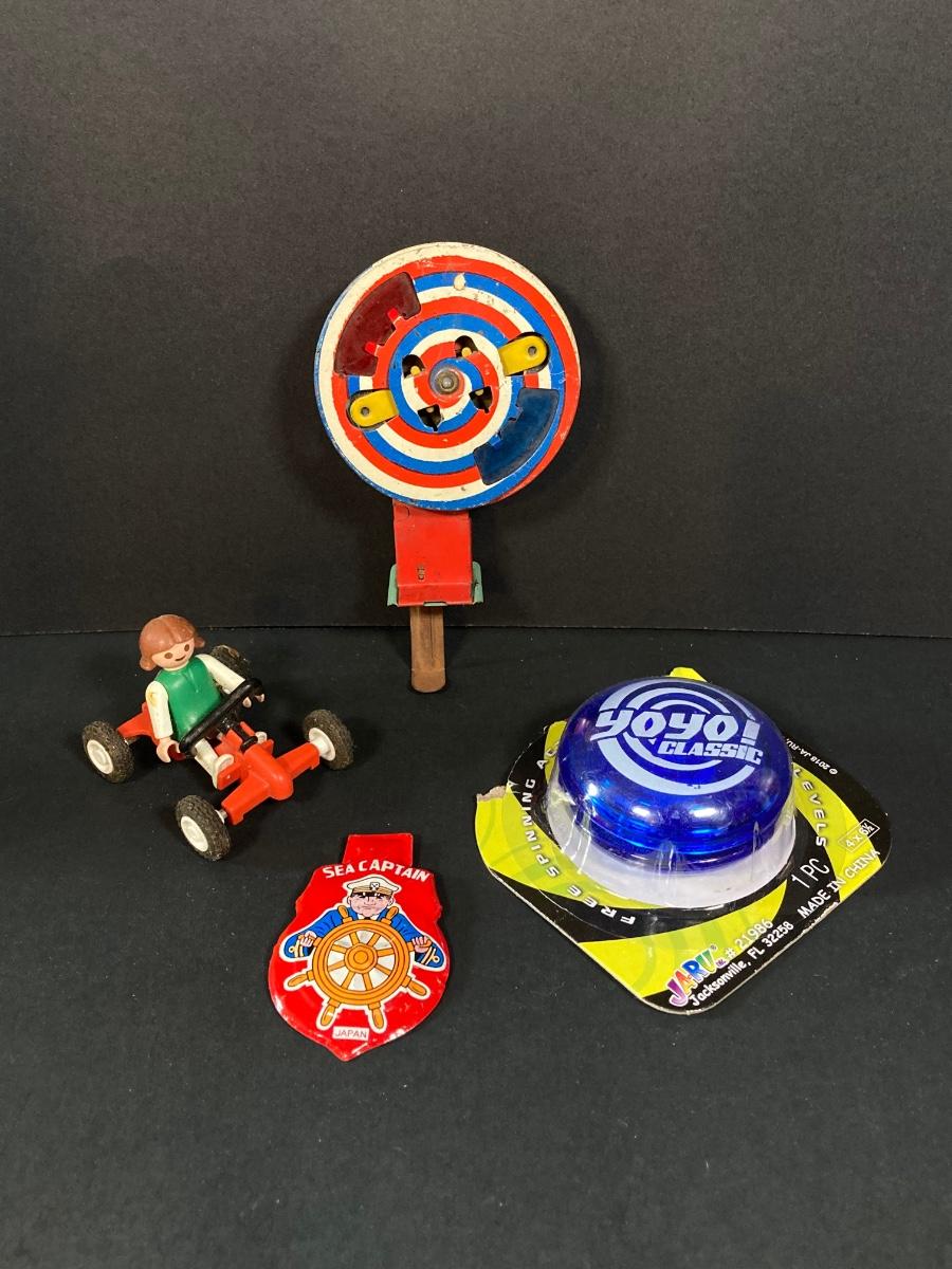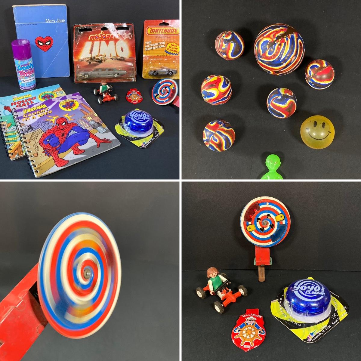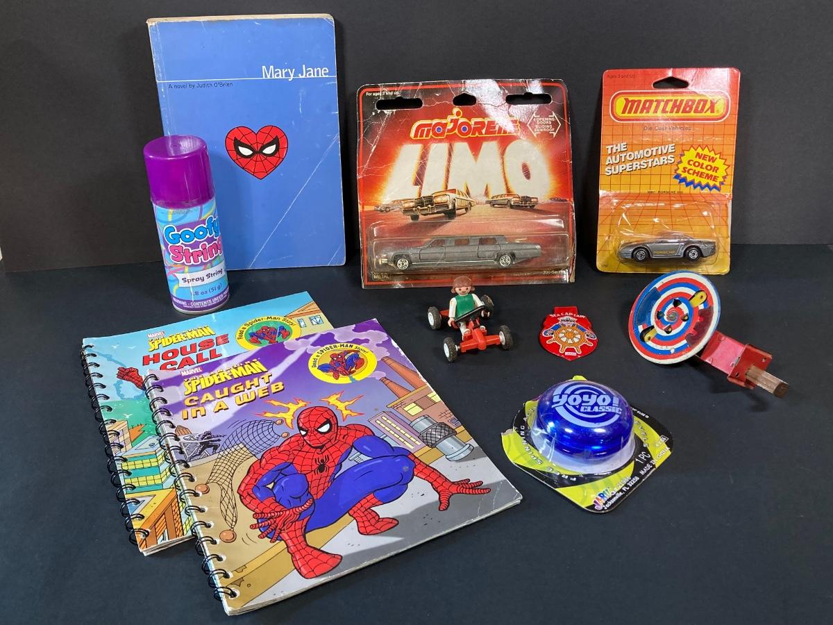 LOT 94: Vintage Toy Collection - Yoyo, Tin Spinner, Super Bouncy Balls, Matchbox and Other Toy Car, Spiderman Books, Goofy String and More