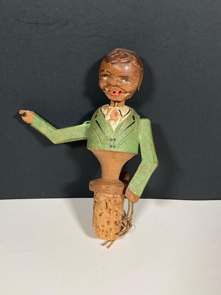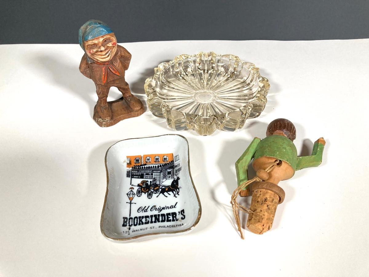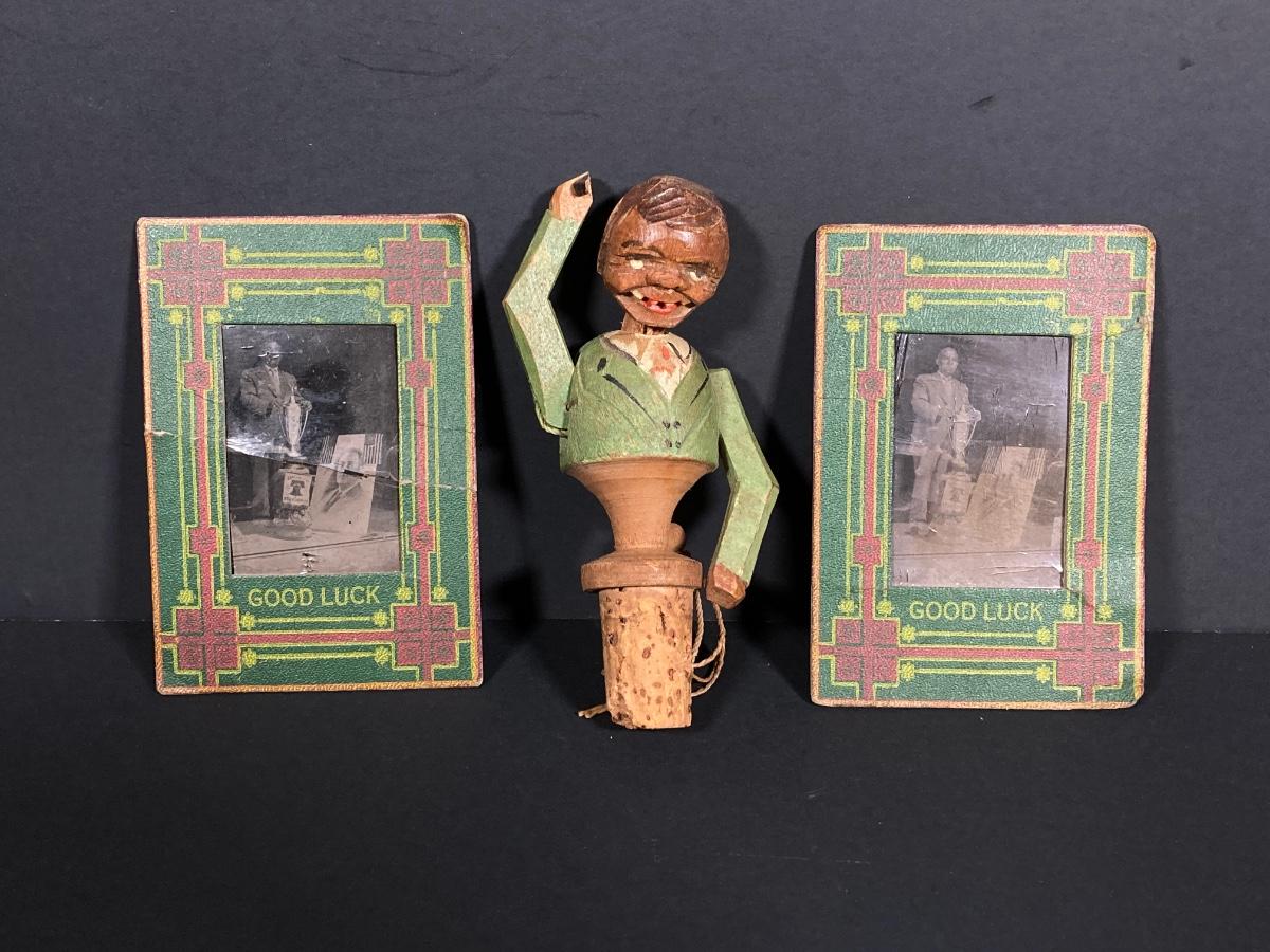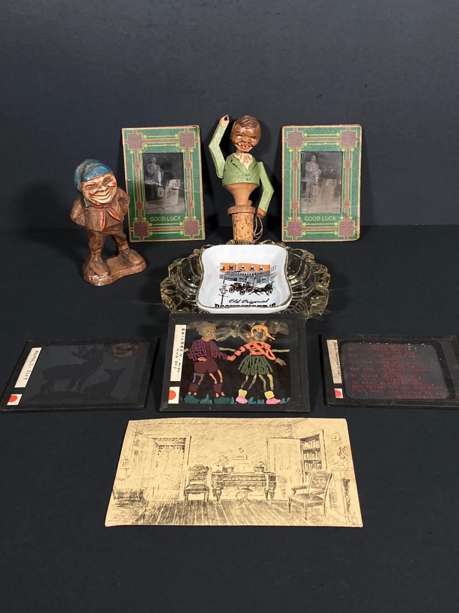 LOT 100: Vintage / Antique Collectibles Including Mechanical Wooden Bottle Stopper, Carved Wooden Sailor, Postcard, Bookbinder's Dish, Glass Slides and More