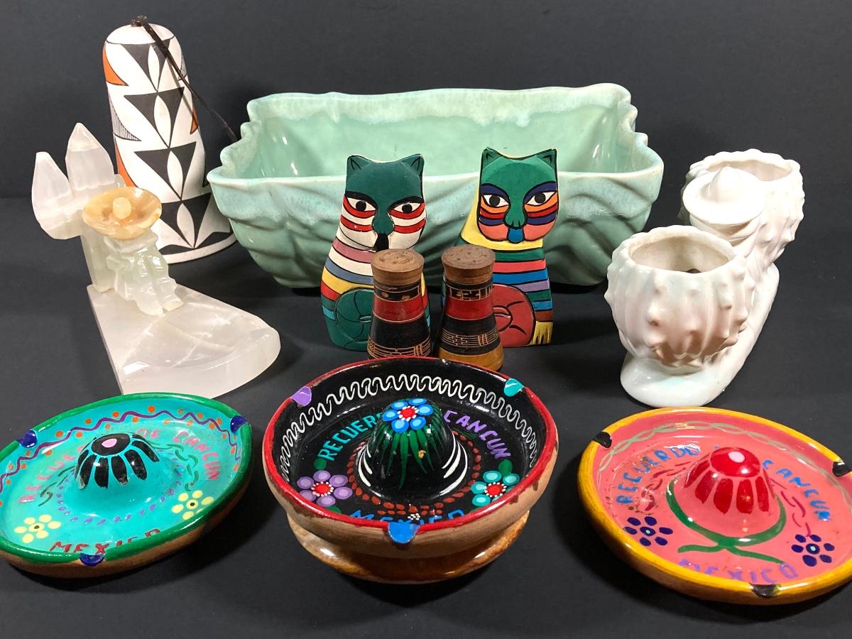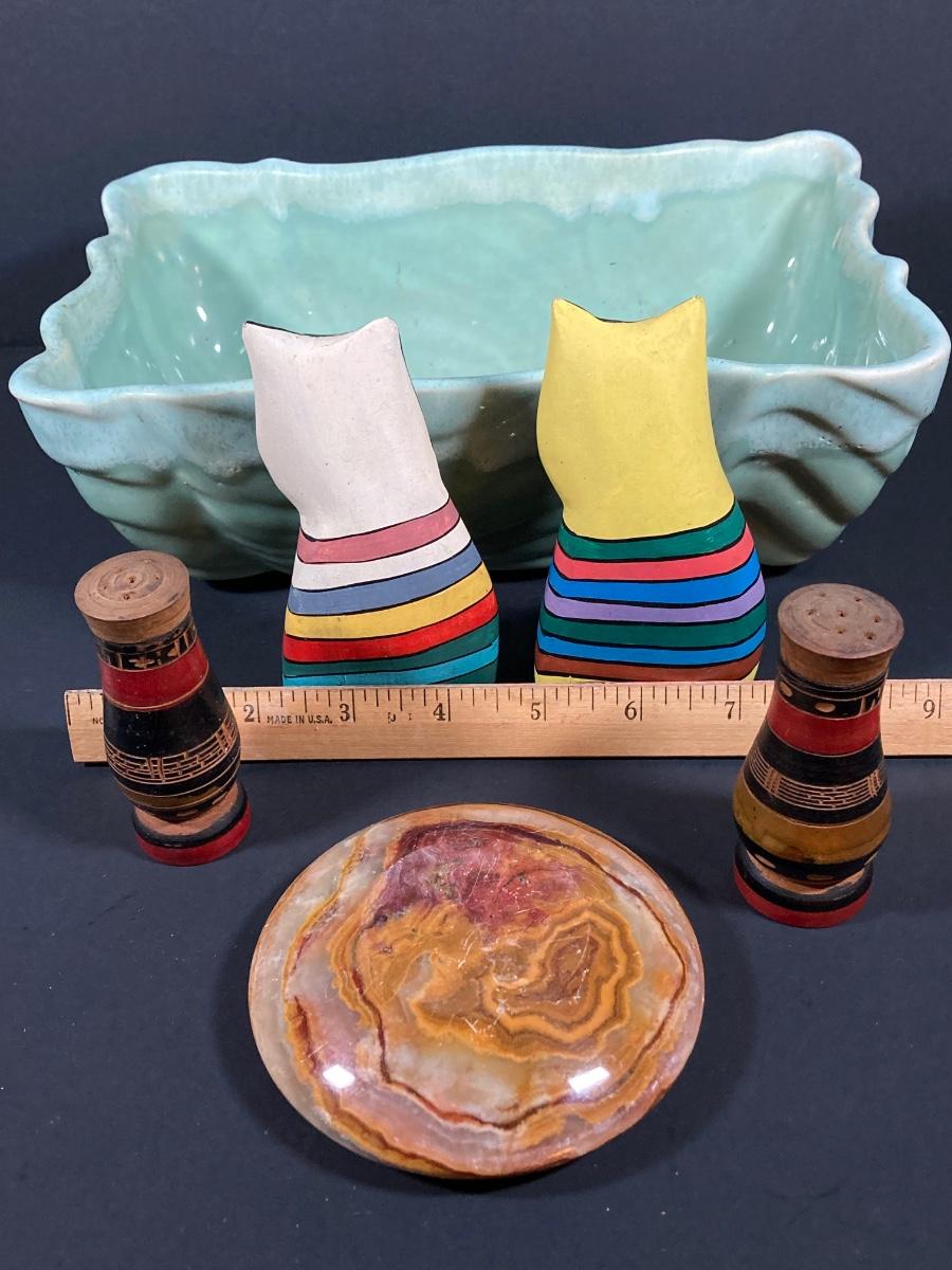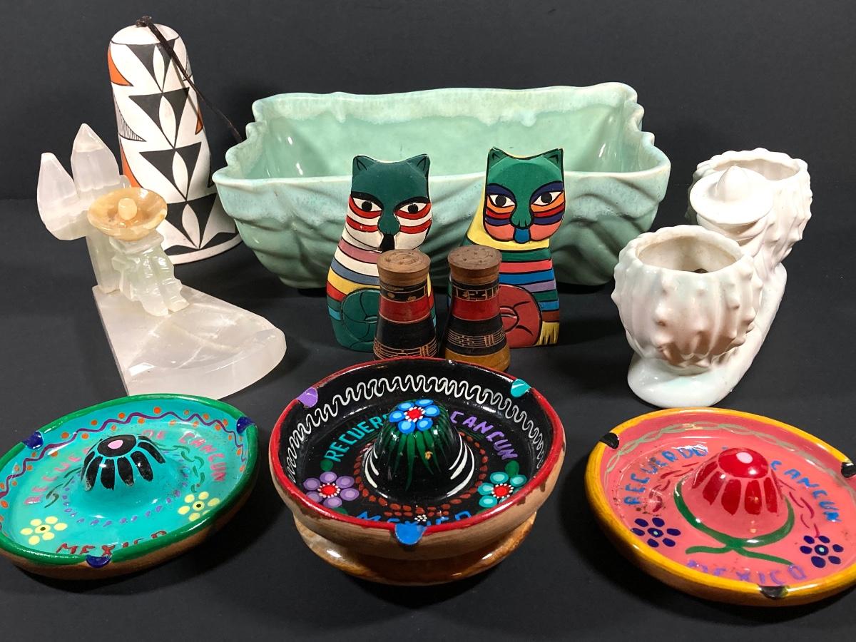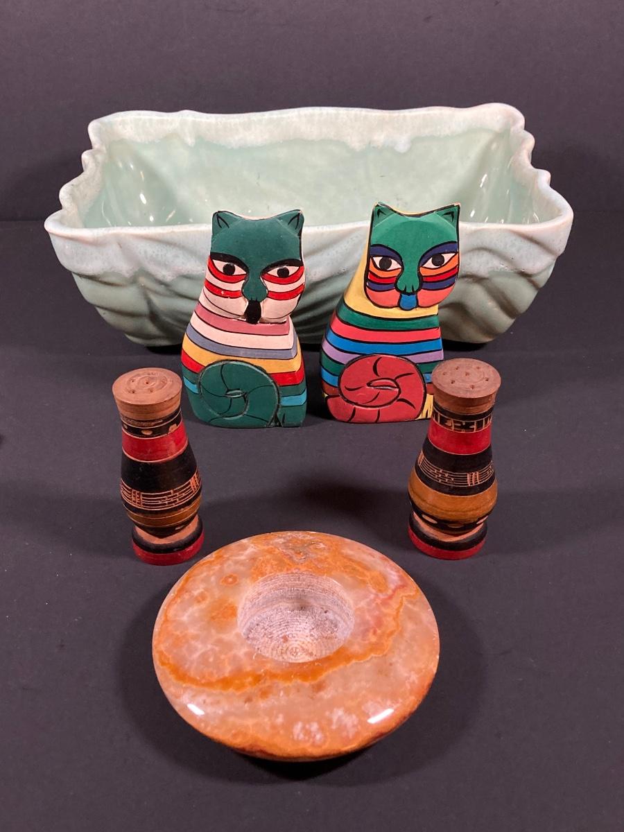 LOT 106: Mexican Memorabilia Including Sombrero Ashtrays, Wood Salt and Pepper Shakers, Painted Wood Cats, Carved Onyx Ashtray and More
