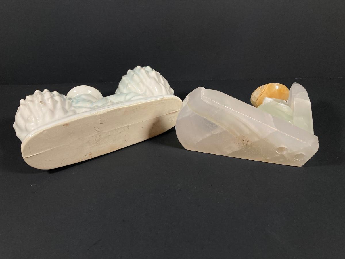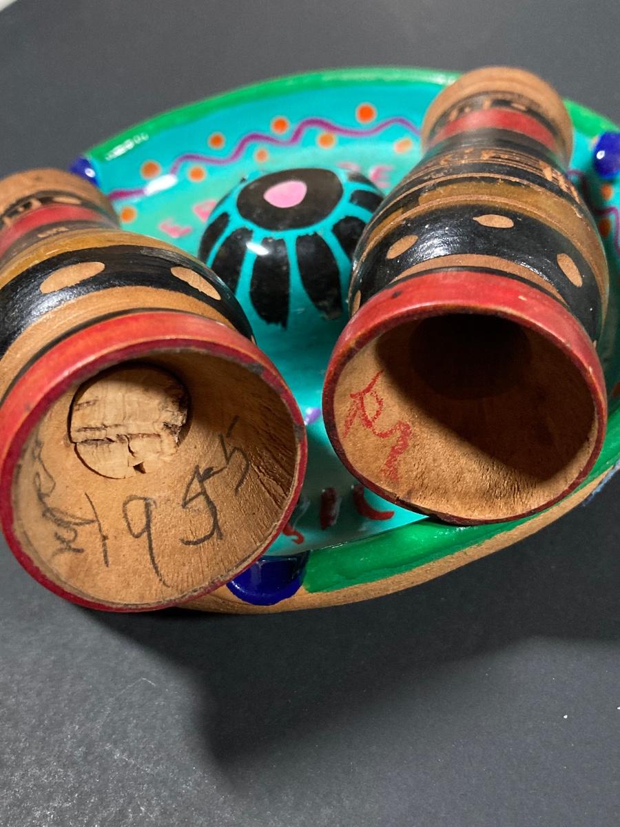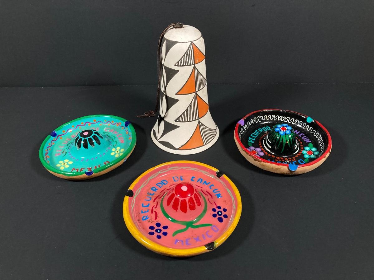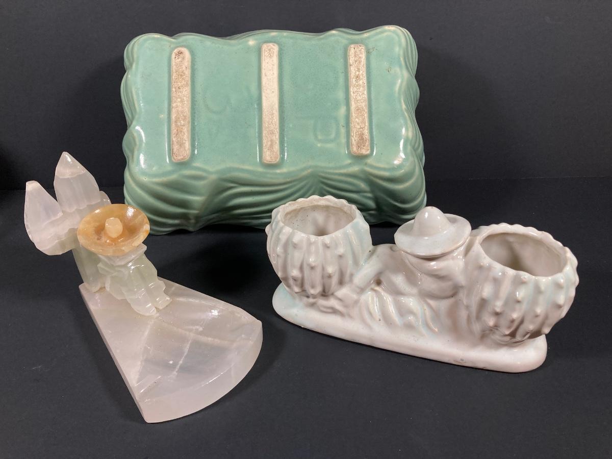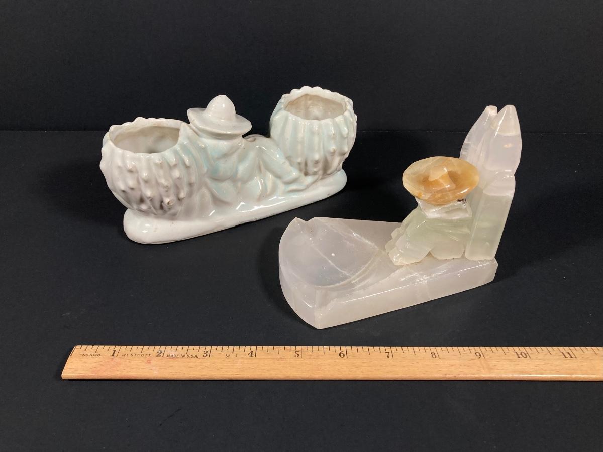 LOT 106: Mexican Memorabilia Including Sombrero Ashtrays, Wood Salt and Pepper Shakers, Painted Wood Cats, Carved Onyx Ashtray and More