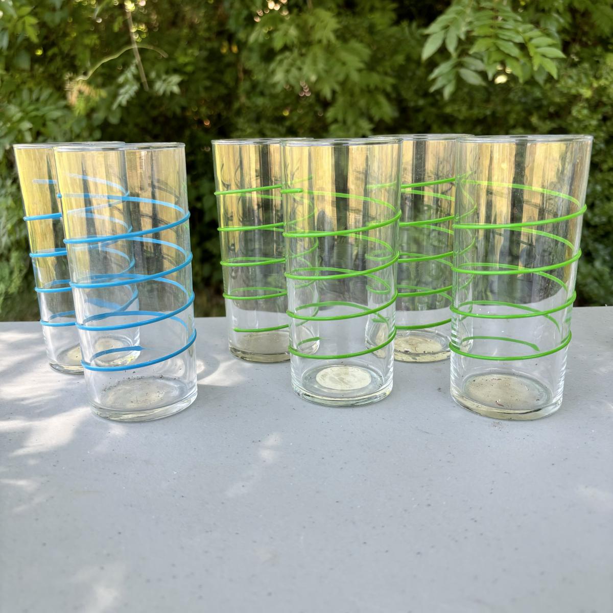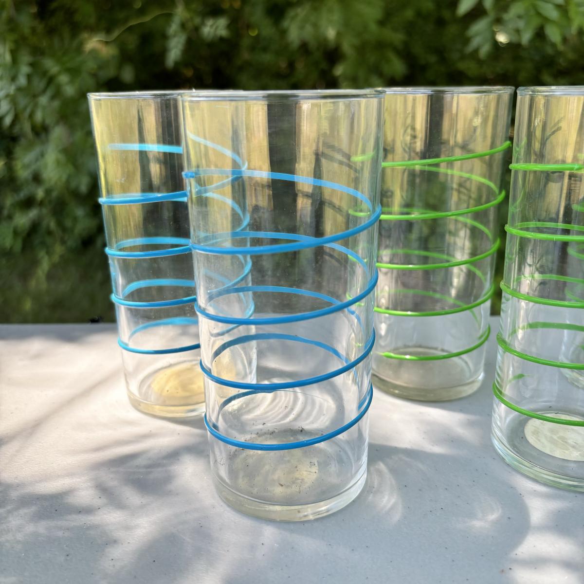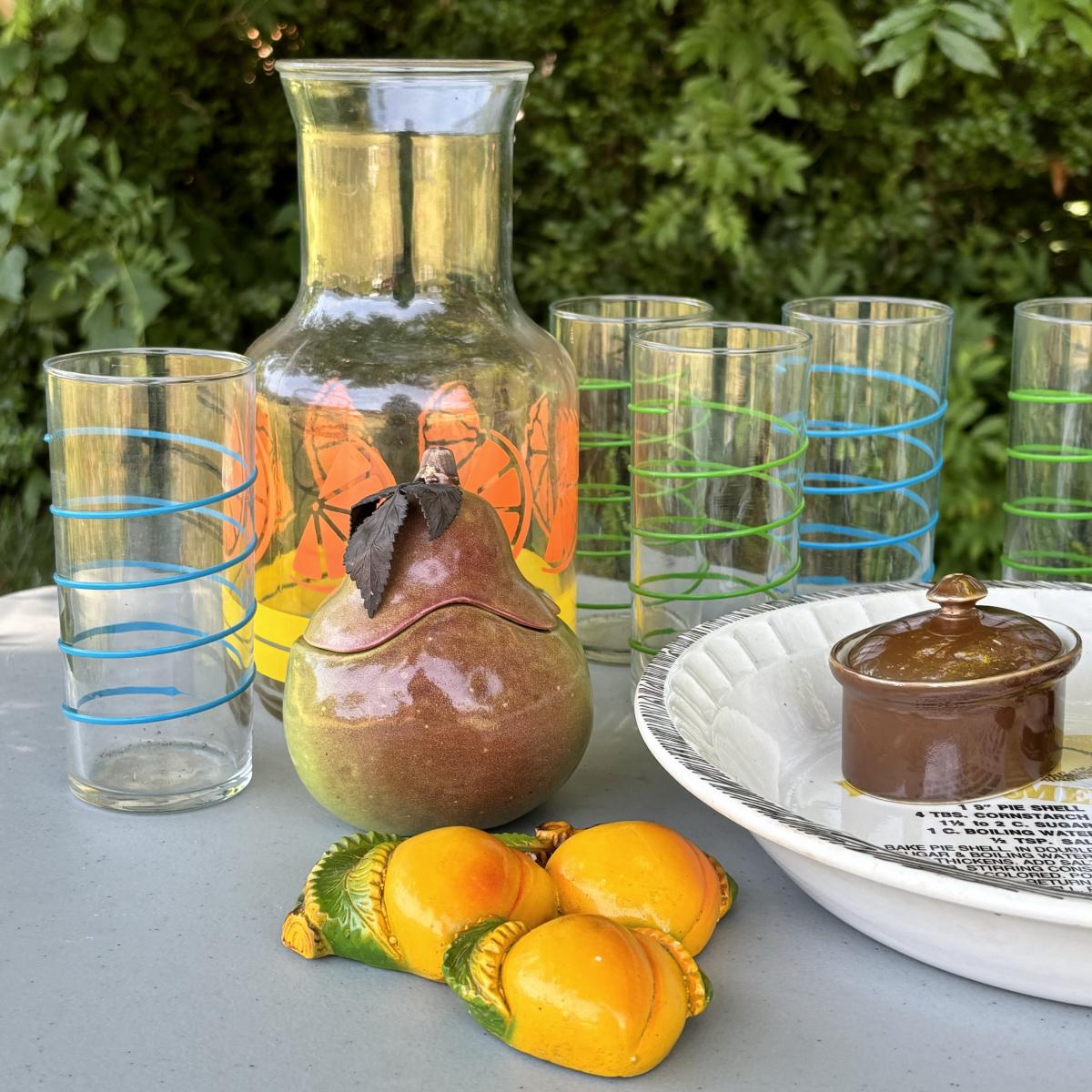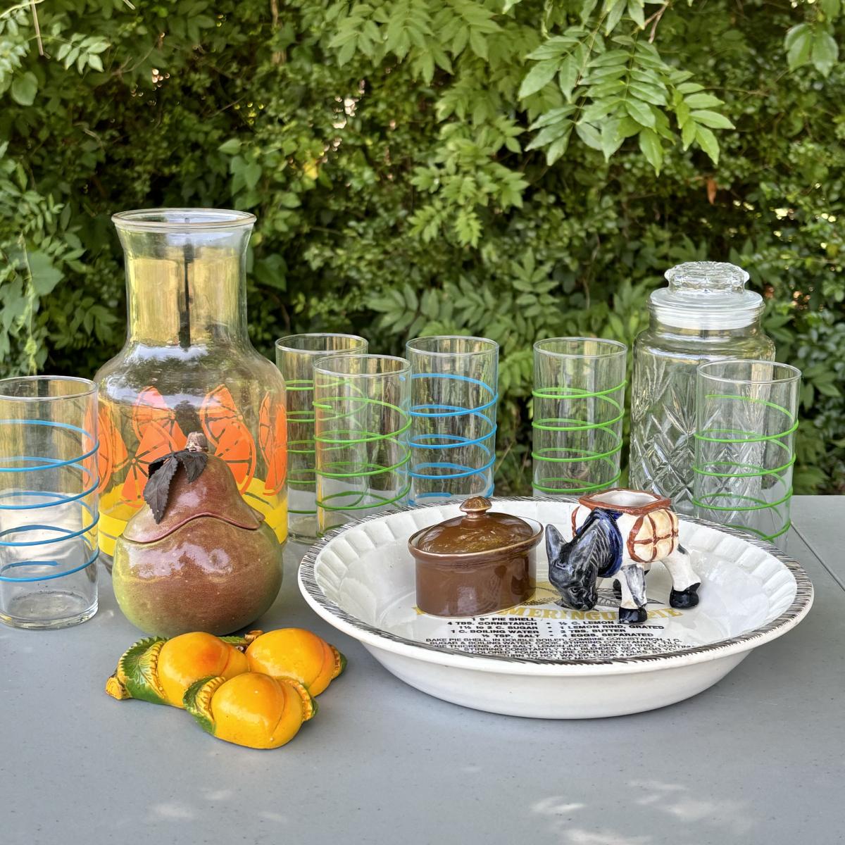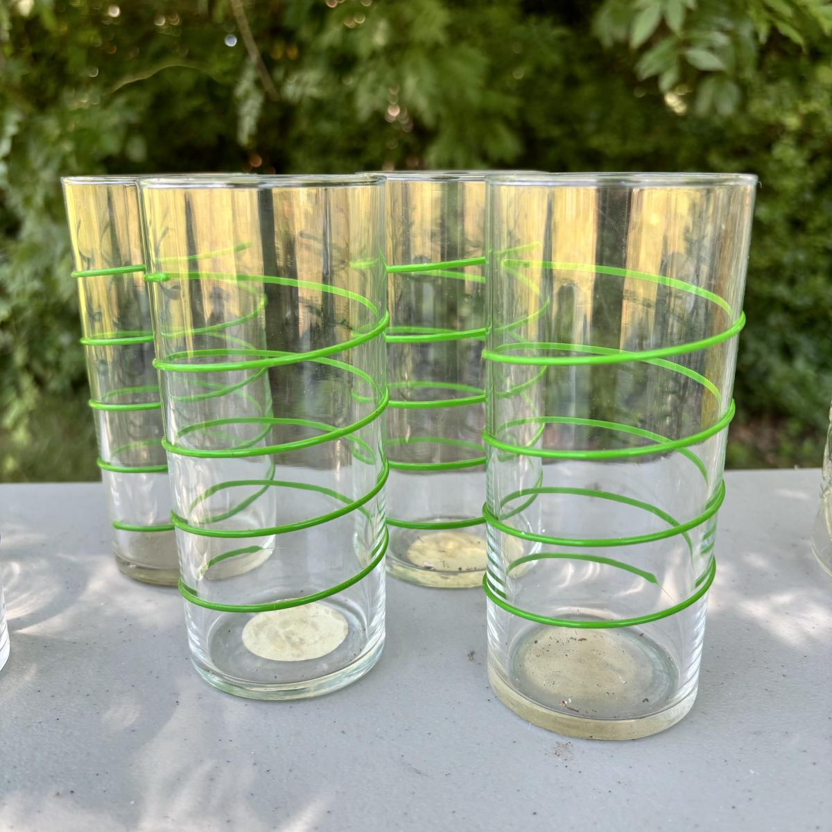 LOT 197: Luminarc Blue & Green Stripe 10.5oz Beverage Glasses, Small Pillivuyt Covered Dish, Signed Pear Sugar Bowl & More