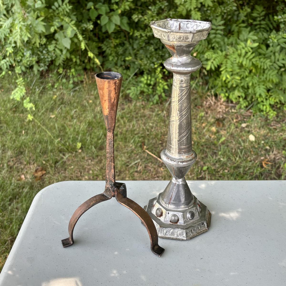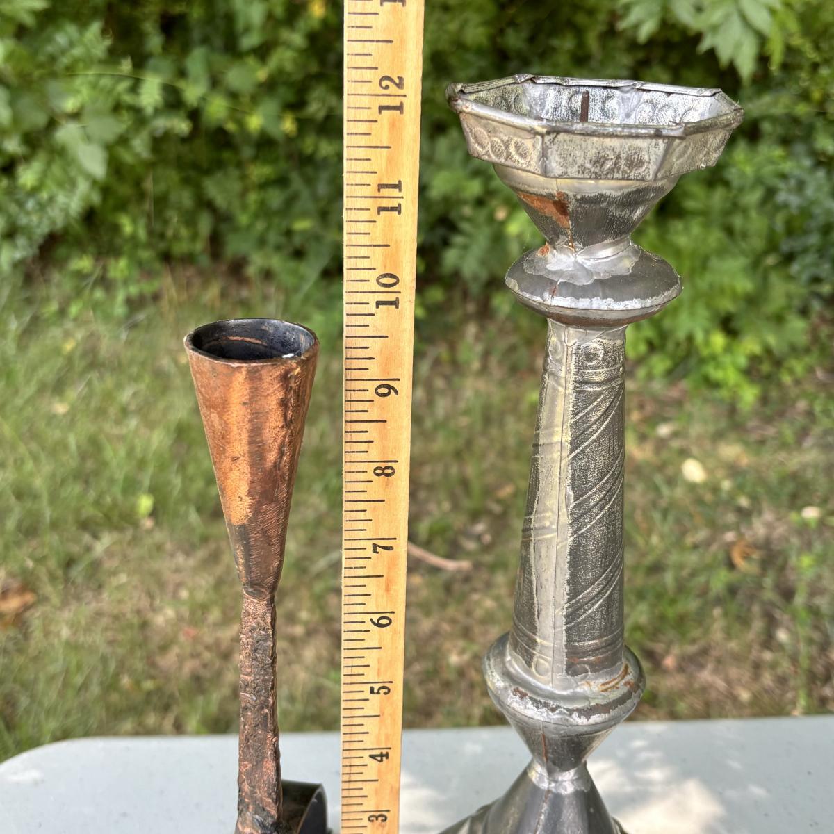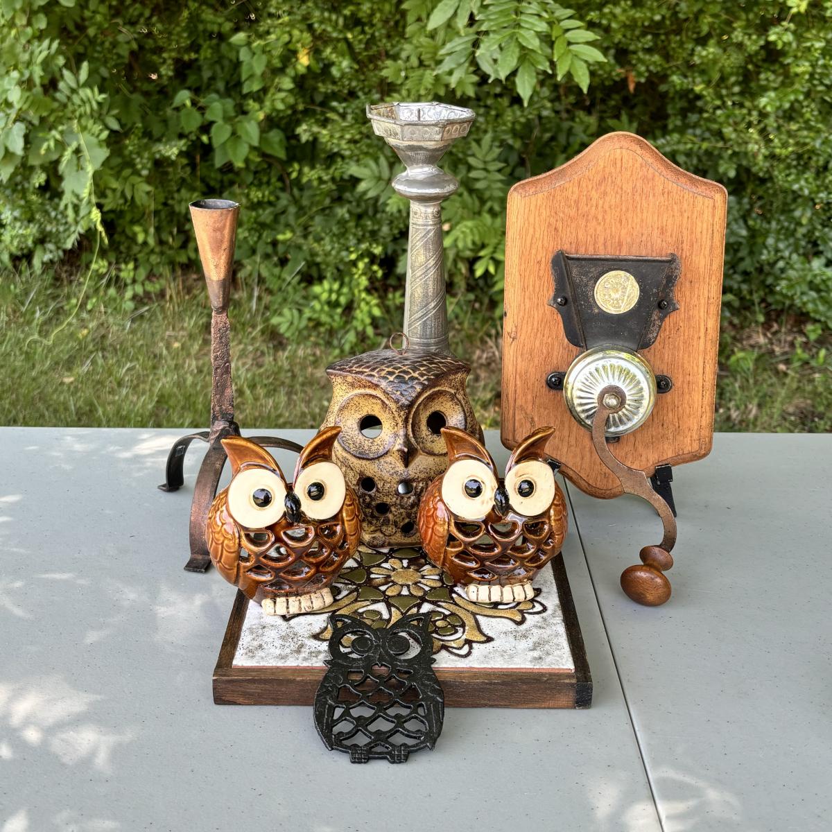 LOT 198: Ceramic and Cast Iron Owls, Handcrafted Copper and Other Candlestick Holders, Vintage Coffee Mill and Ceramic Tile