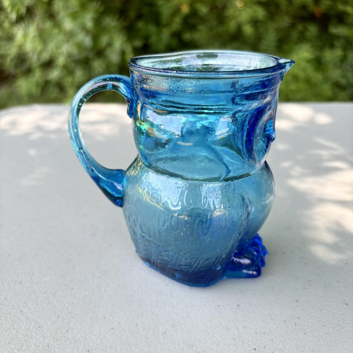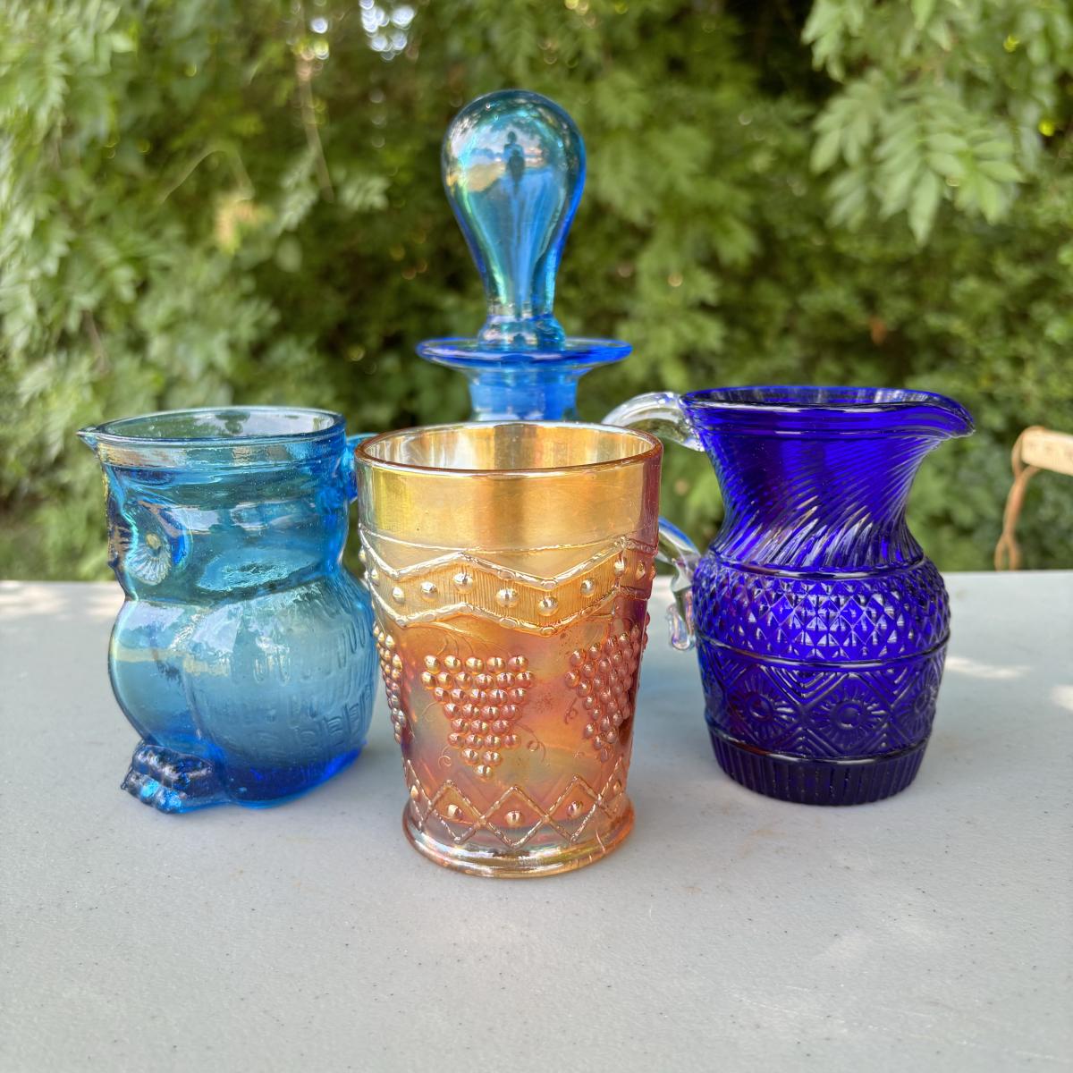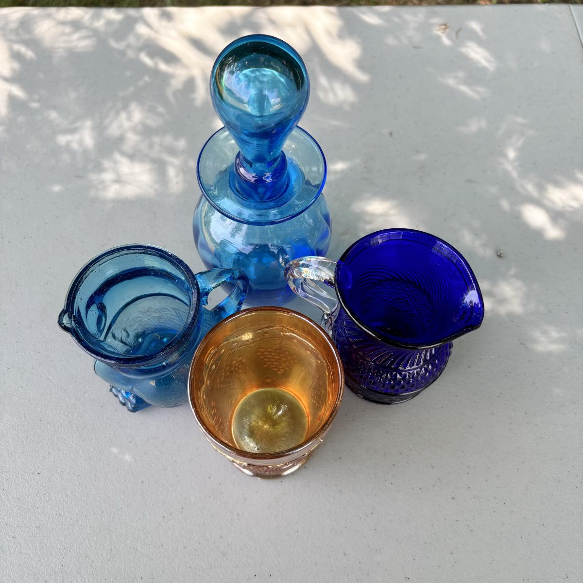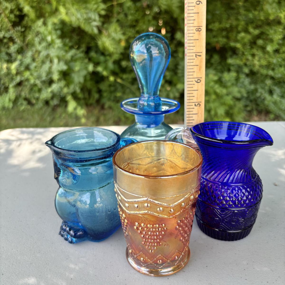 LOT 200: Vintage Colored Glass Collection, with Blue Owl Mug, Cobalt Blue Press Creamer with Clear Handle, Fenton Style Marigold Carnival Glass and Blue Art Glass Bottle with Stopper