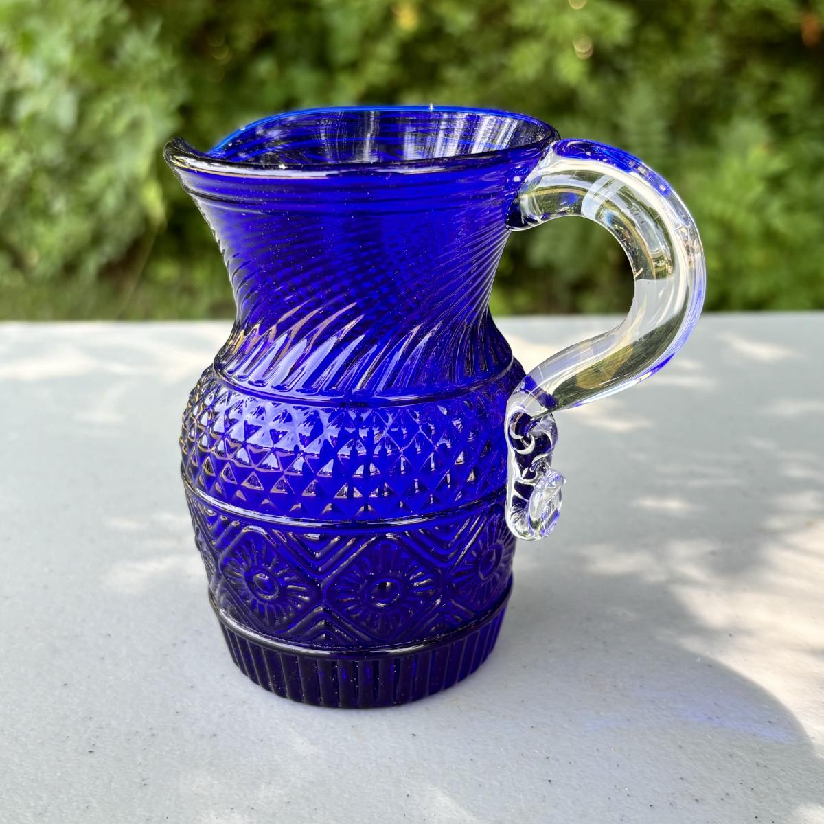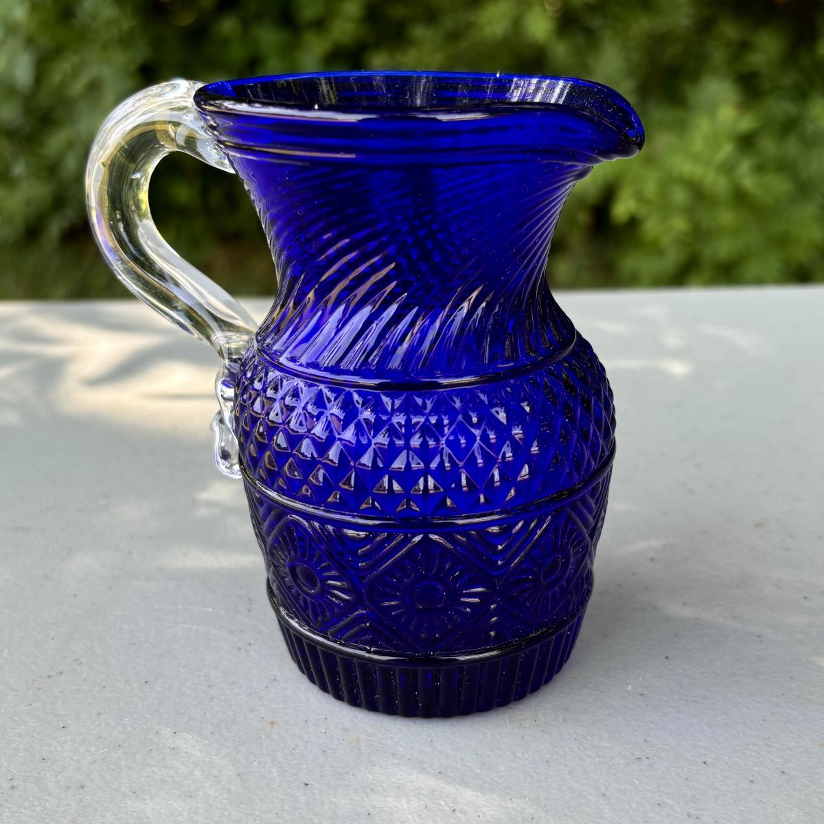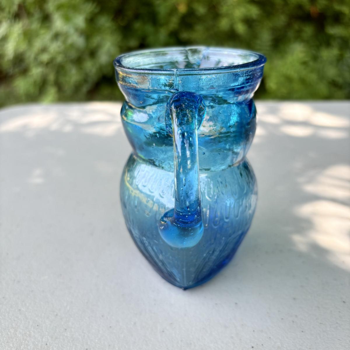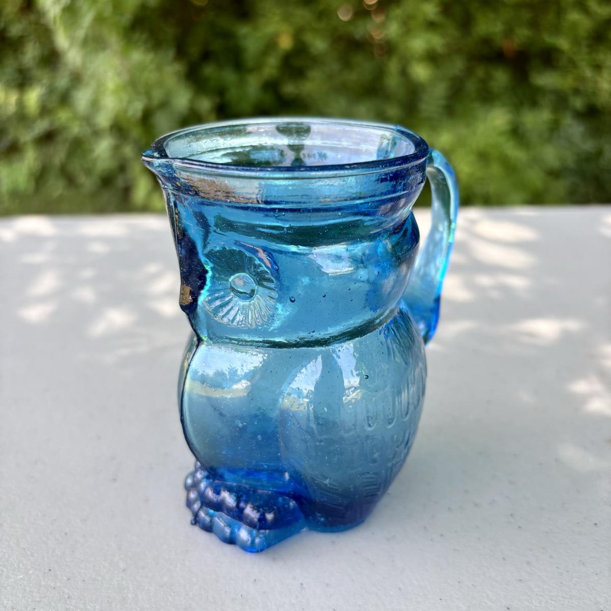 LOT 200: Vintage Colored Glass Collection, with Blue Owl Mug, Cobalt Blue Press Creamer with Clear Handle, Fenton Style Marigold Carnival Glass and Blue Art Glass Bottle with Stopper