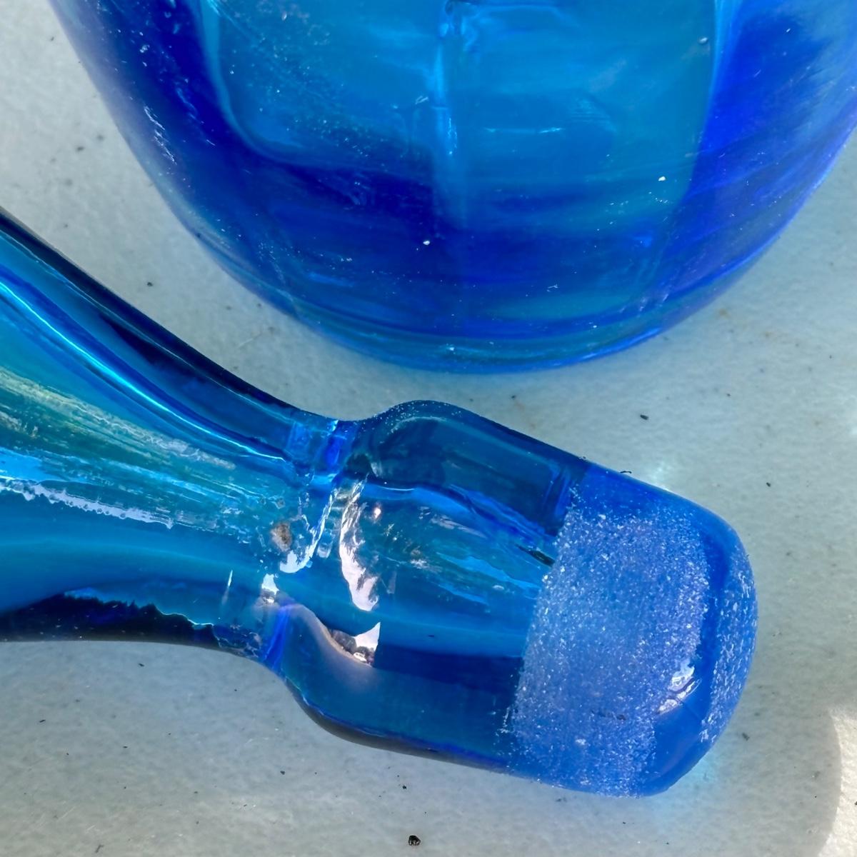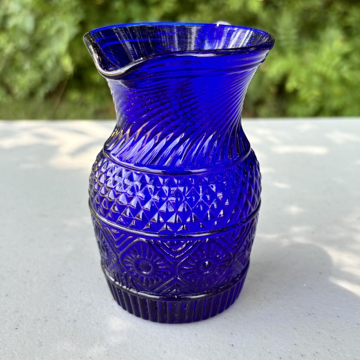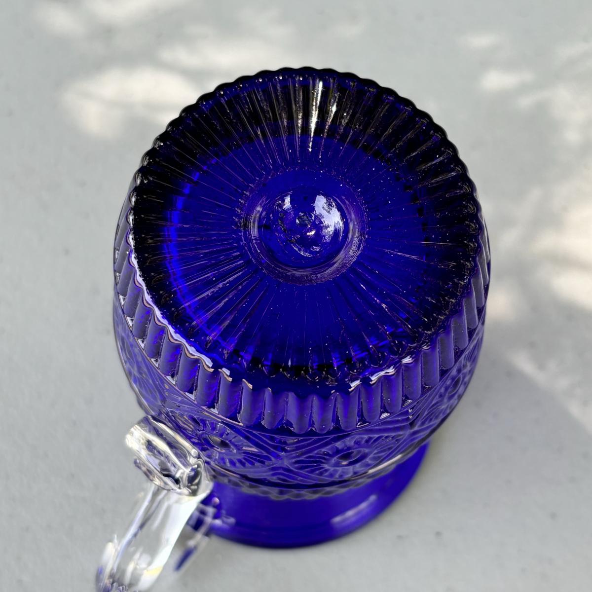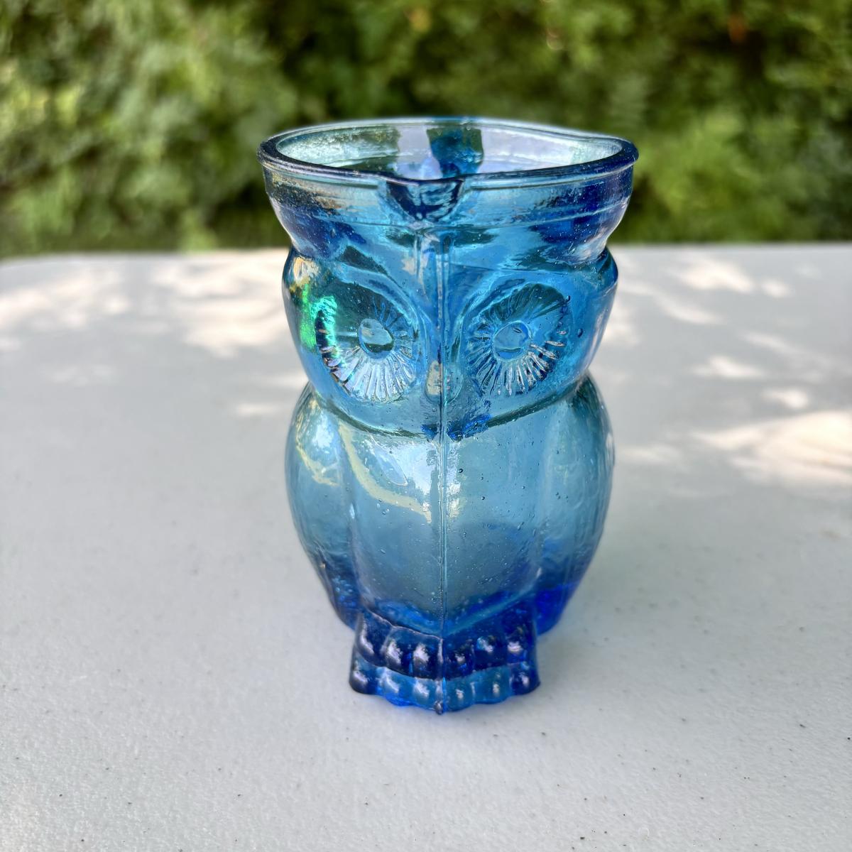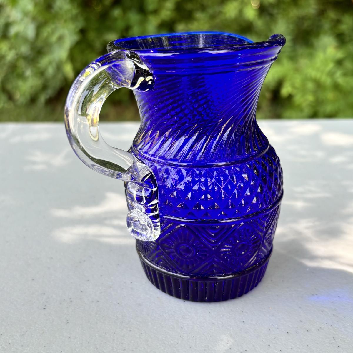 LOT 200: Vintage Colored Glass Collection, with Blue Owl Mug, Cobalt Blue Press Creamer with Clear Handle, Fenton Style Marigold Carnival Glass and Blue Art Glass Bottle with Stopper
