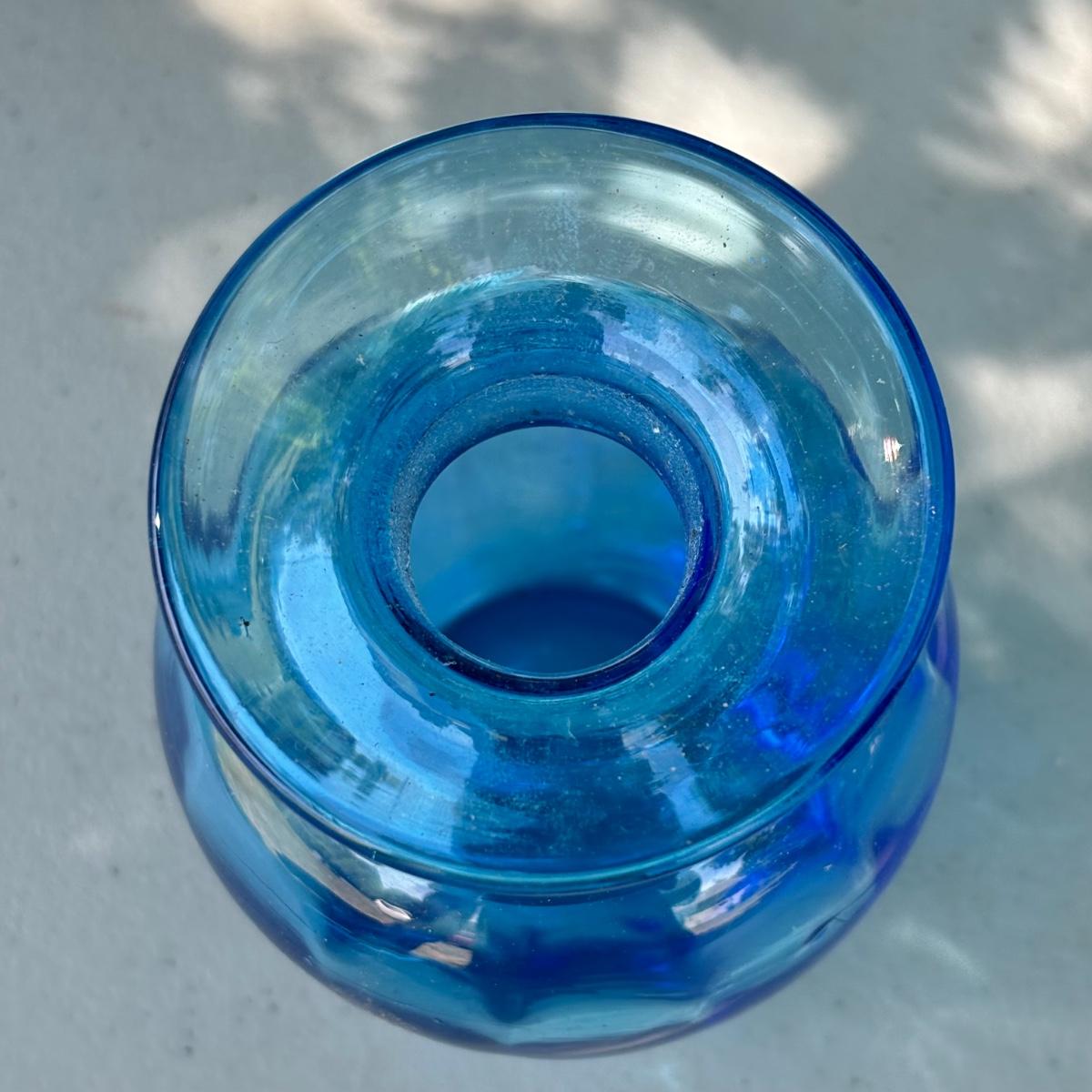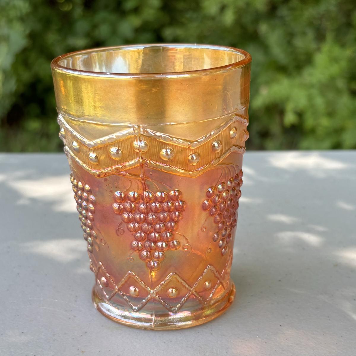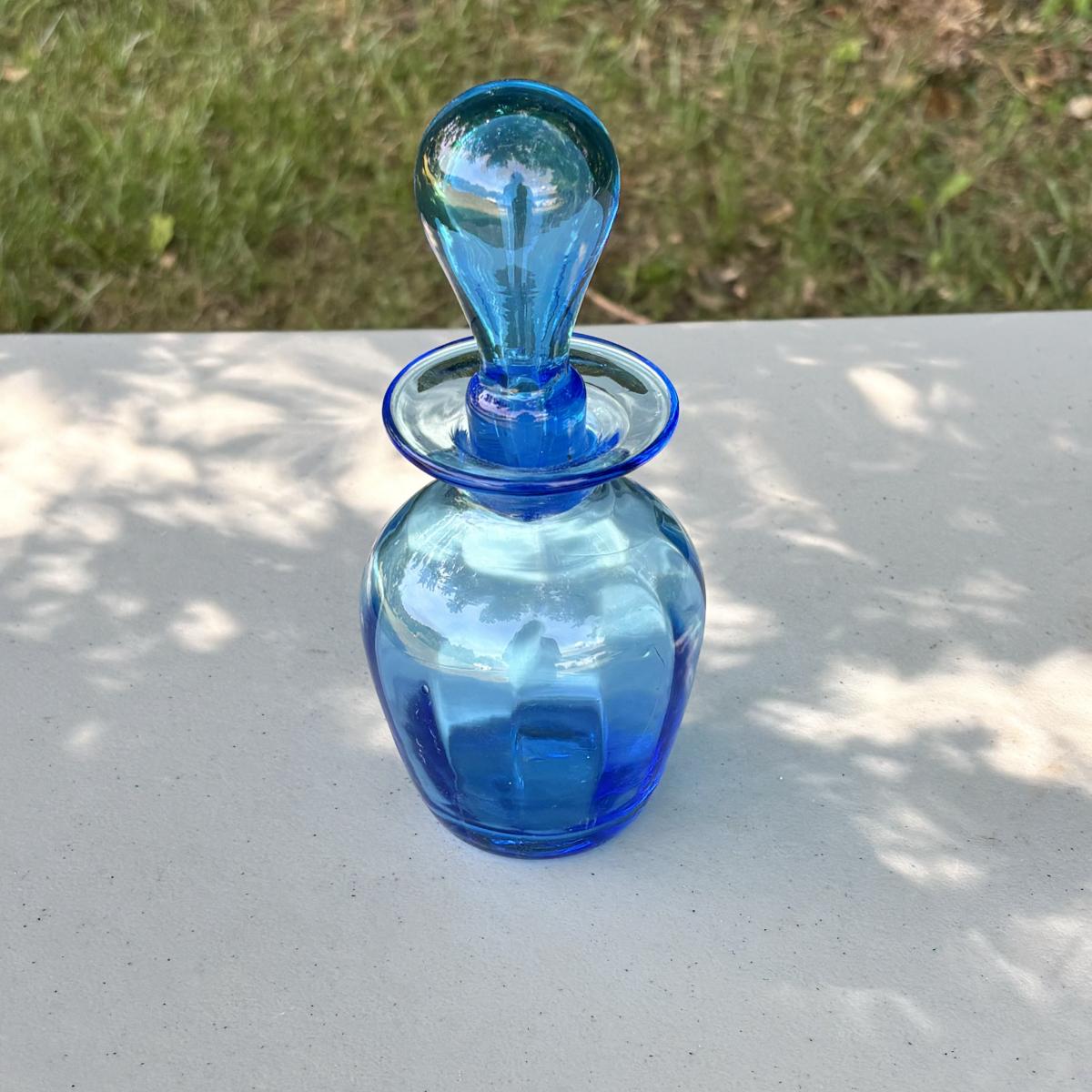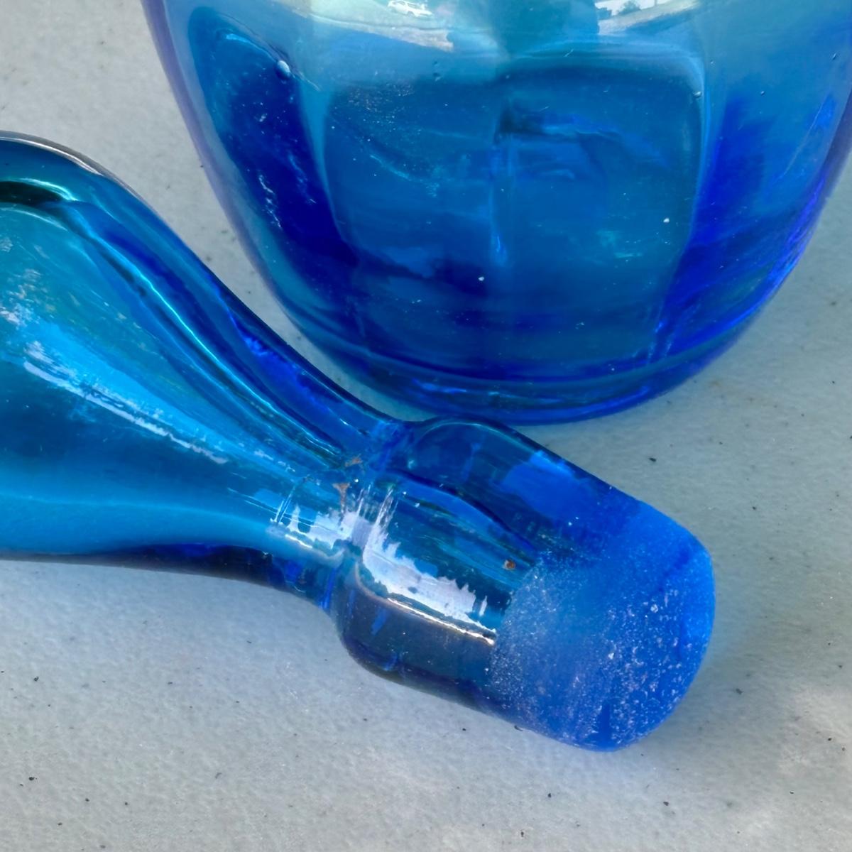 LOT 200: Vintage Colored Glass Collection, with Blue Owl Mug, Cobalt Blue Press Creamer with Clear Handle, Fenton Style Marigold Carnival Glass and Blue Art Glass Bottle with Stopper