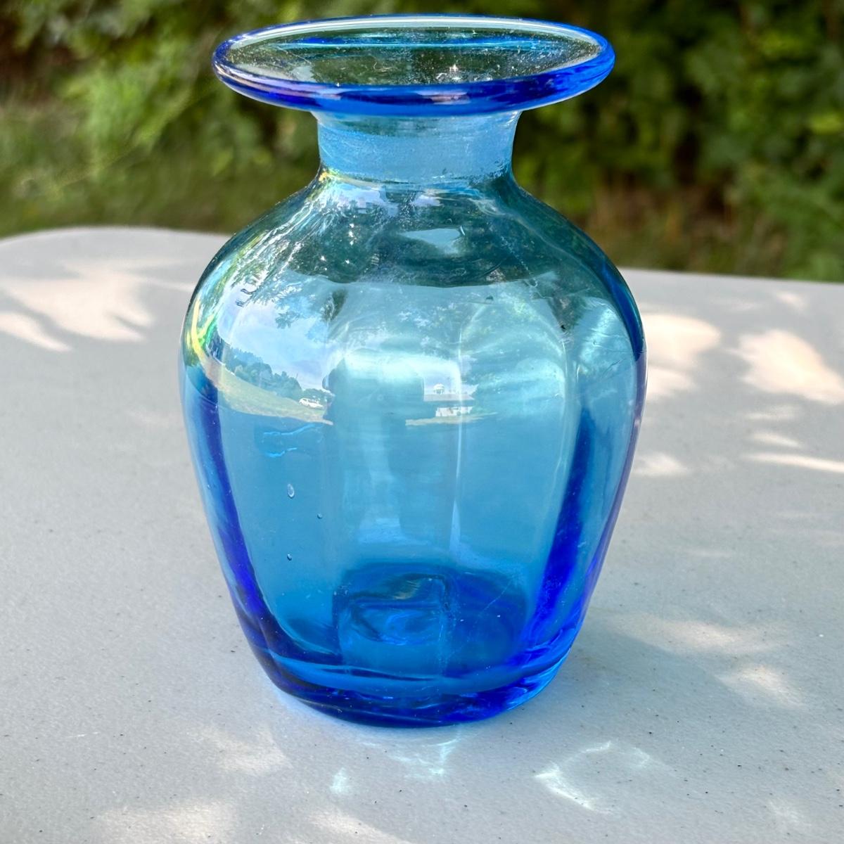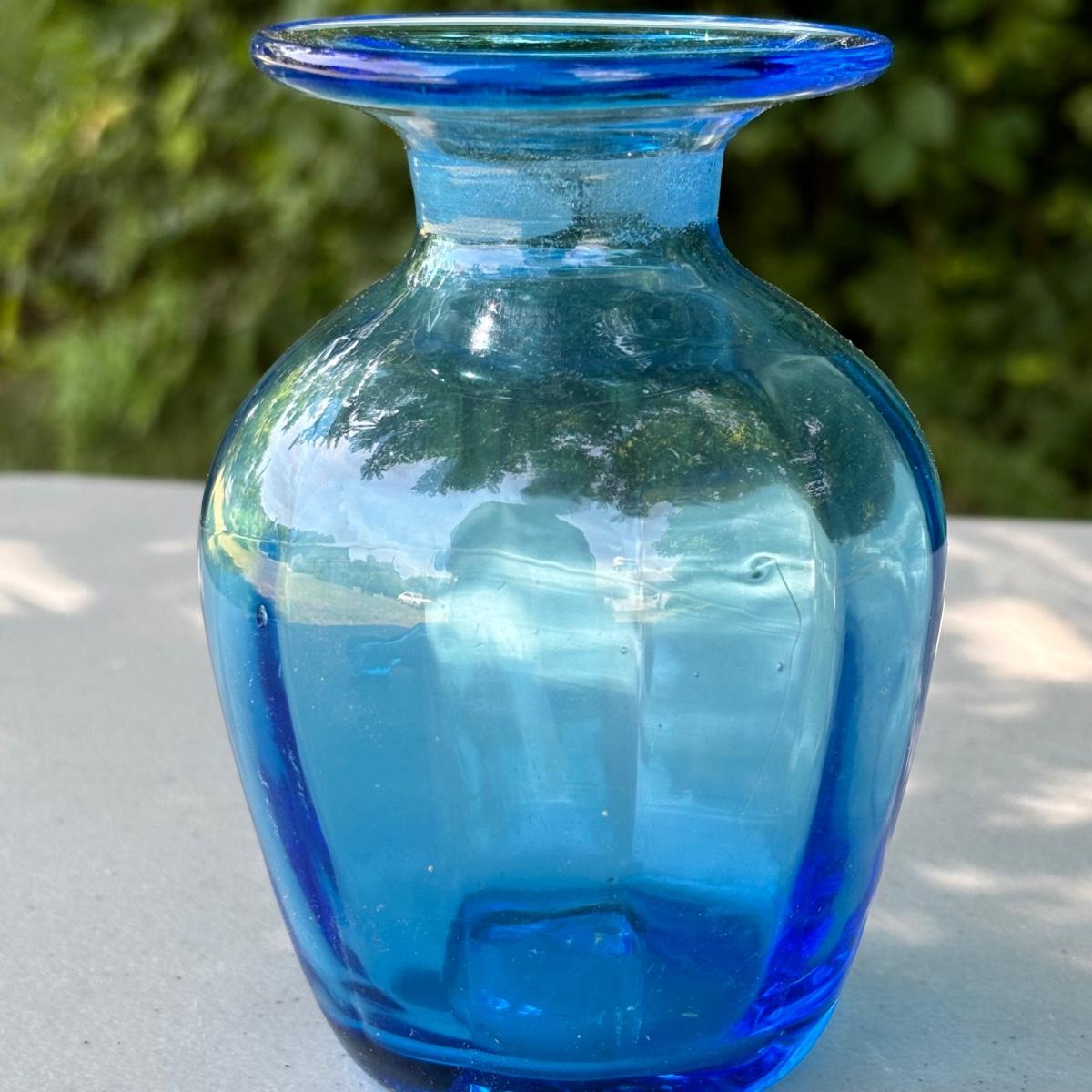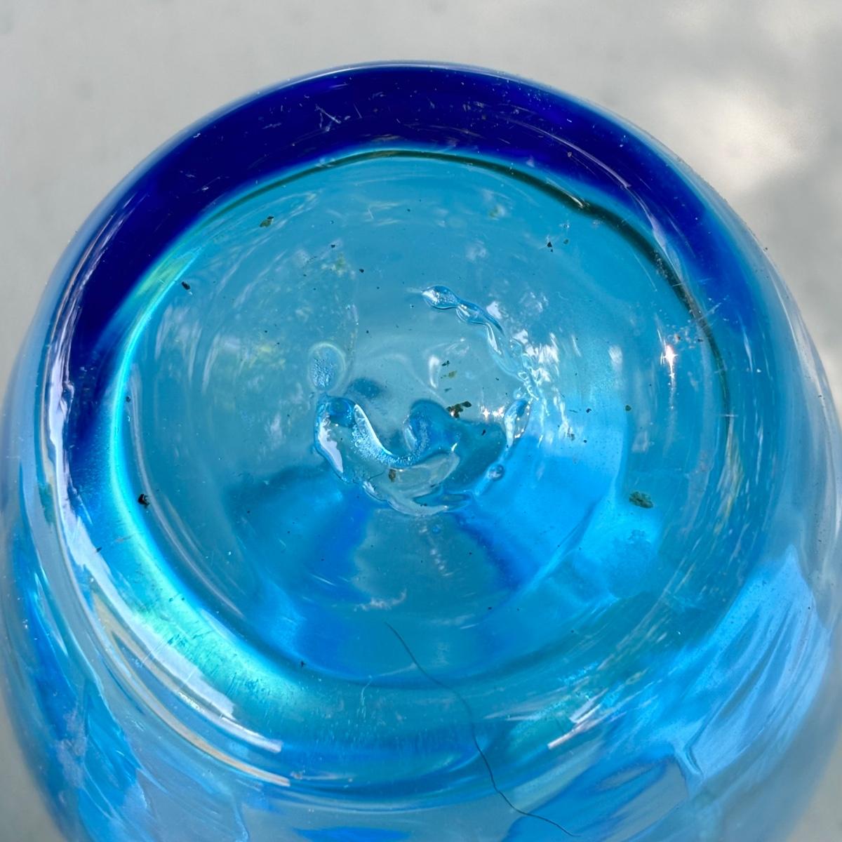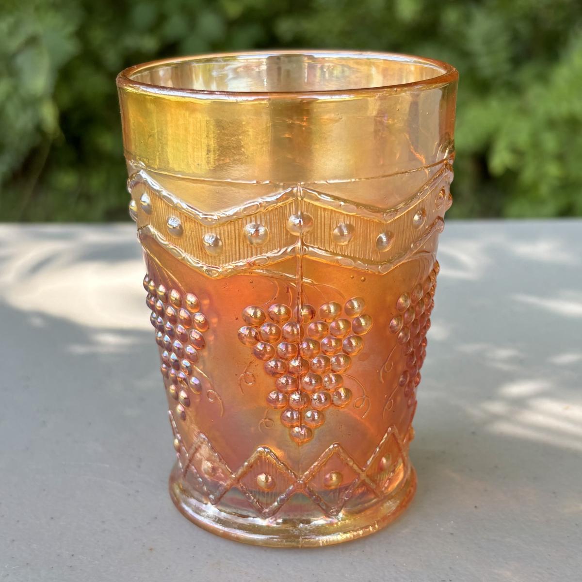 LOT 200: Vintage Colored Glass Collection, with Blue Owl Mug, Cobalt Blue Press Creamer with Clear Handle, Fenton Style Marigold Carnival Glass and Blue Art Glass Bottle with Stopper
