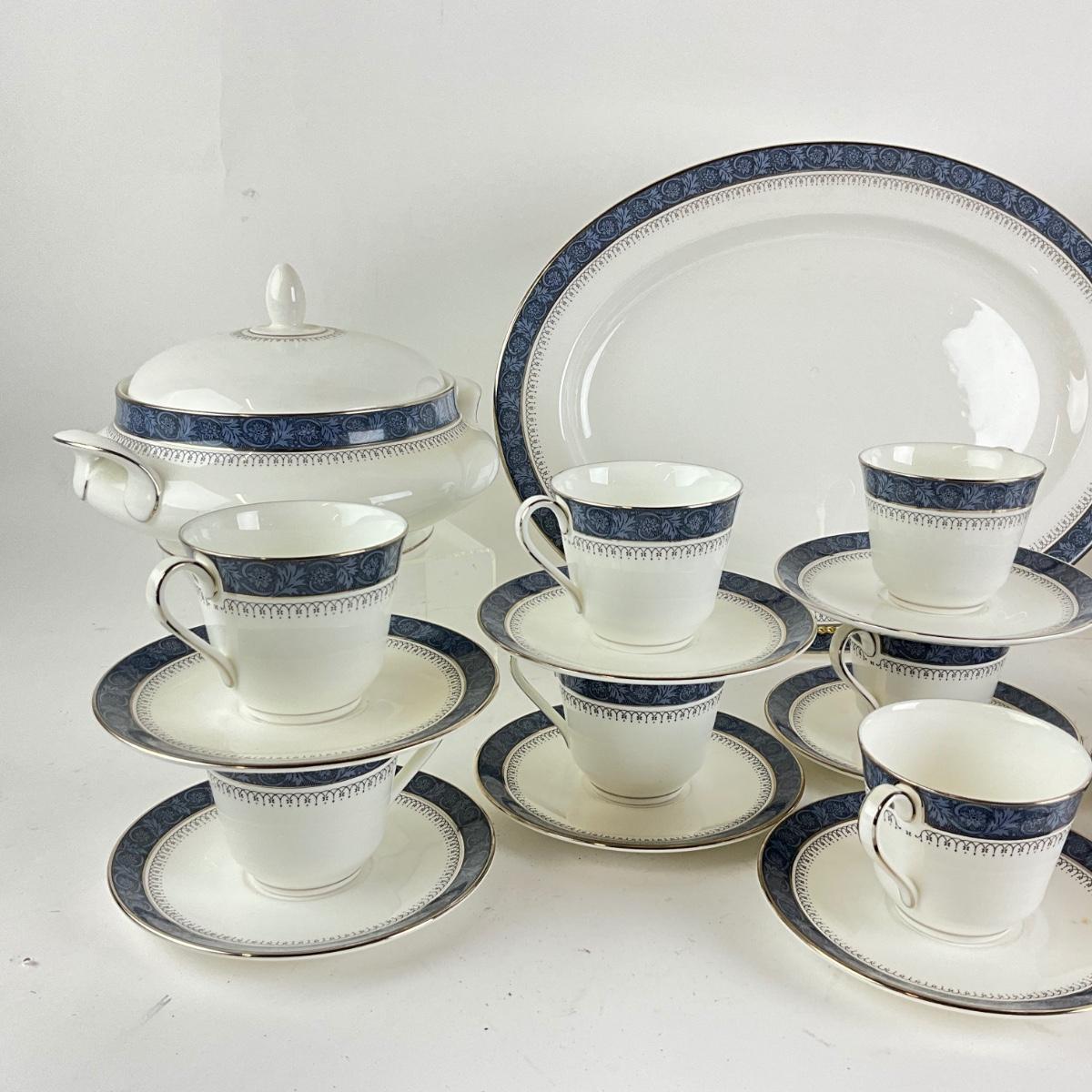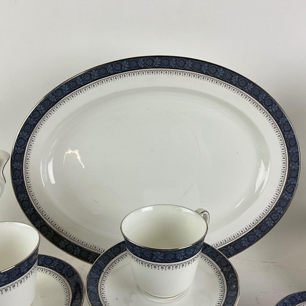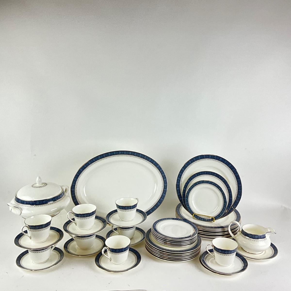 53 piece set of Royal Doulton Fine Bone China "Sherbrooke" pattern. 8 bread plates, 8 salad plates, 8 dinner plates. 8 cups & 9 saucers, covered vegetable serving dish, gravy boat & saucer, large oval platter.