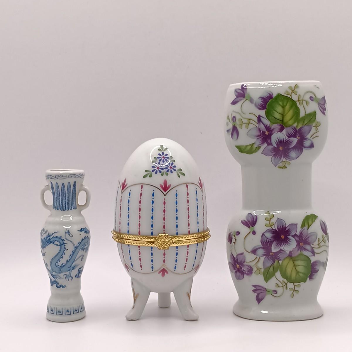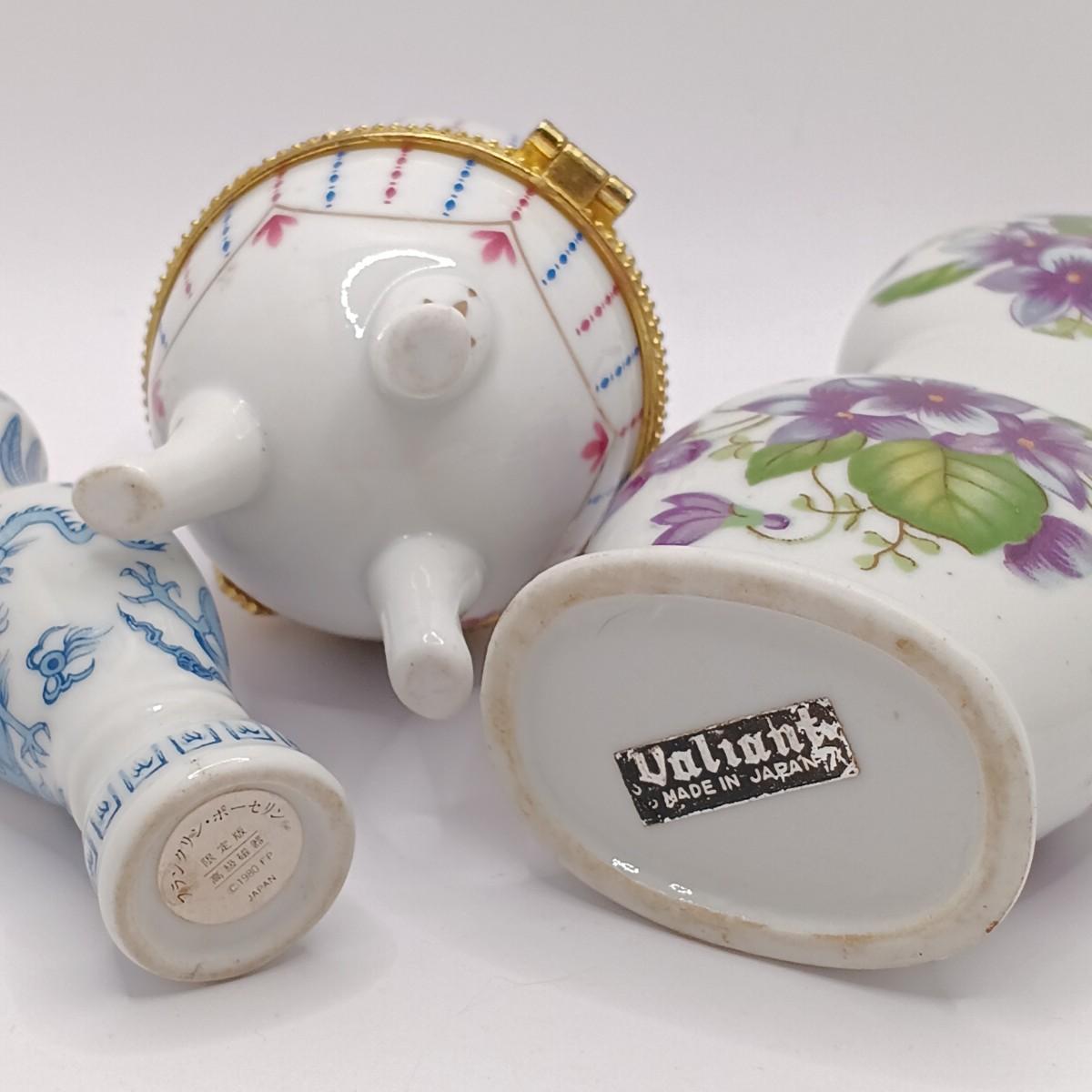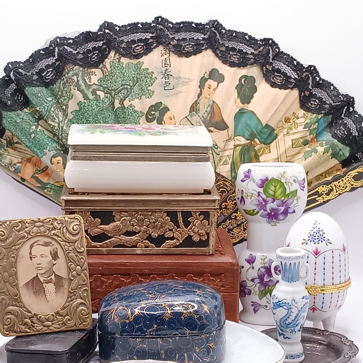 LOT 6: A Collection of Vintage Trinket Boxes w/ a Fabric and Celluloid Hand Fan, Valiant Bud Vase & More