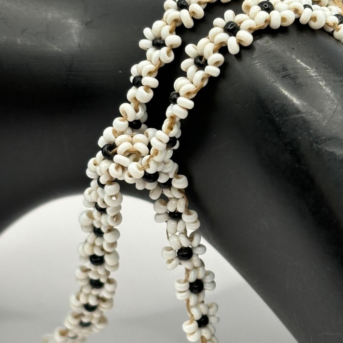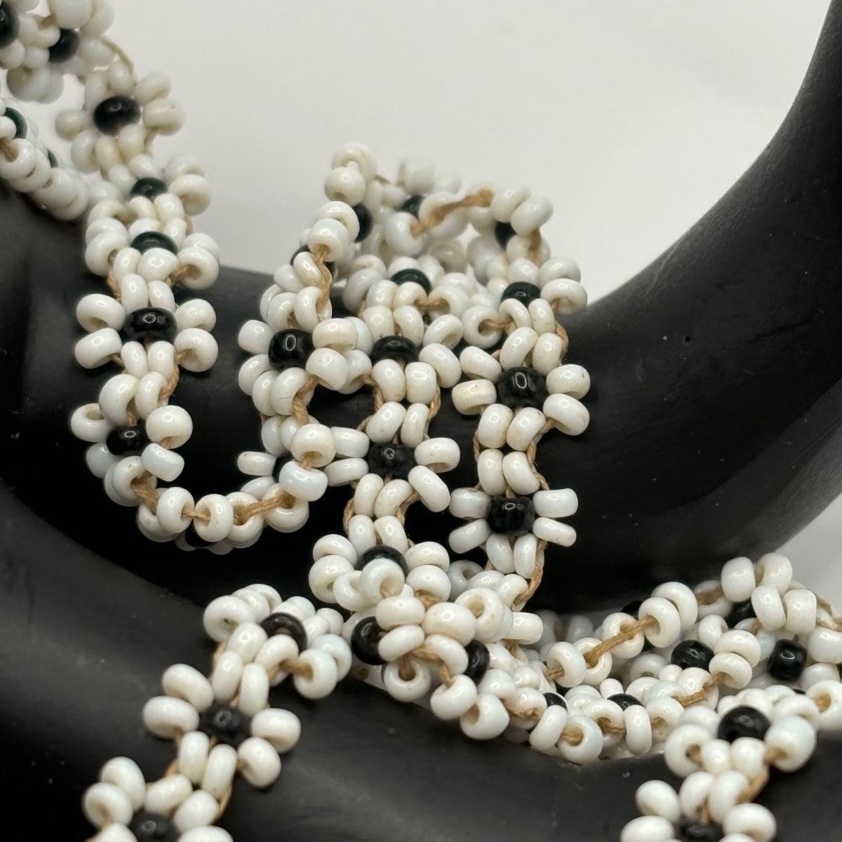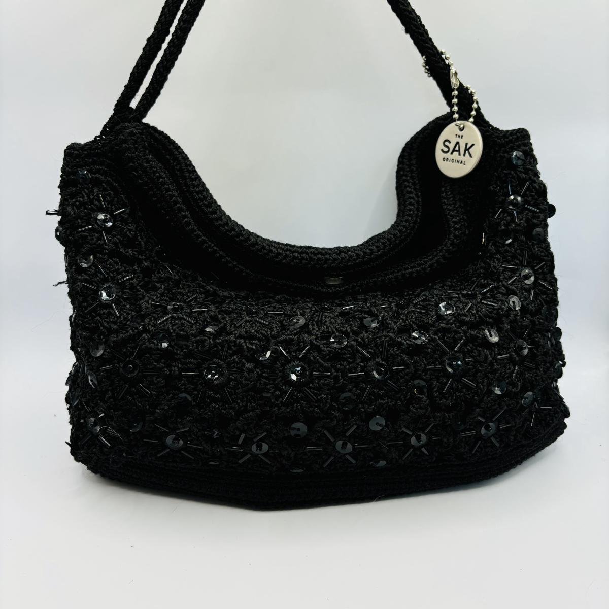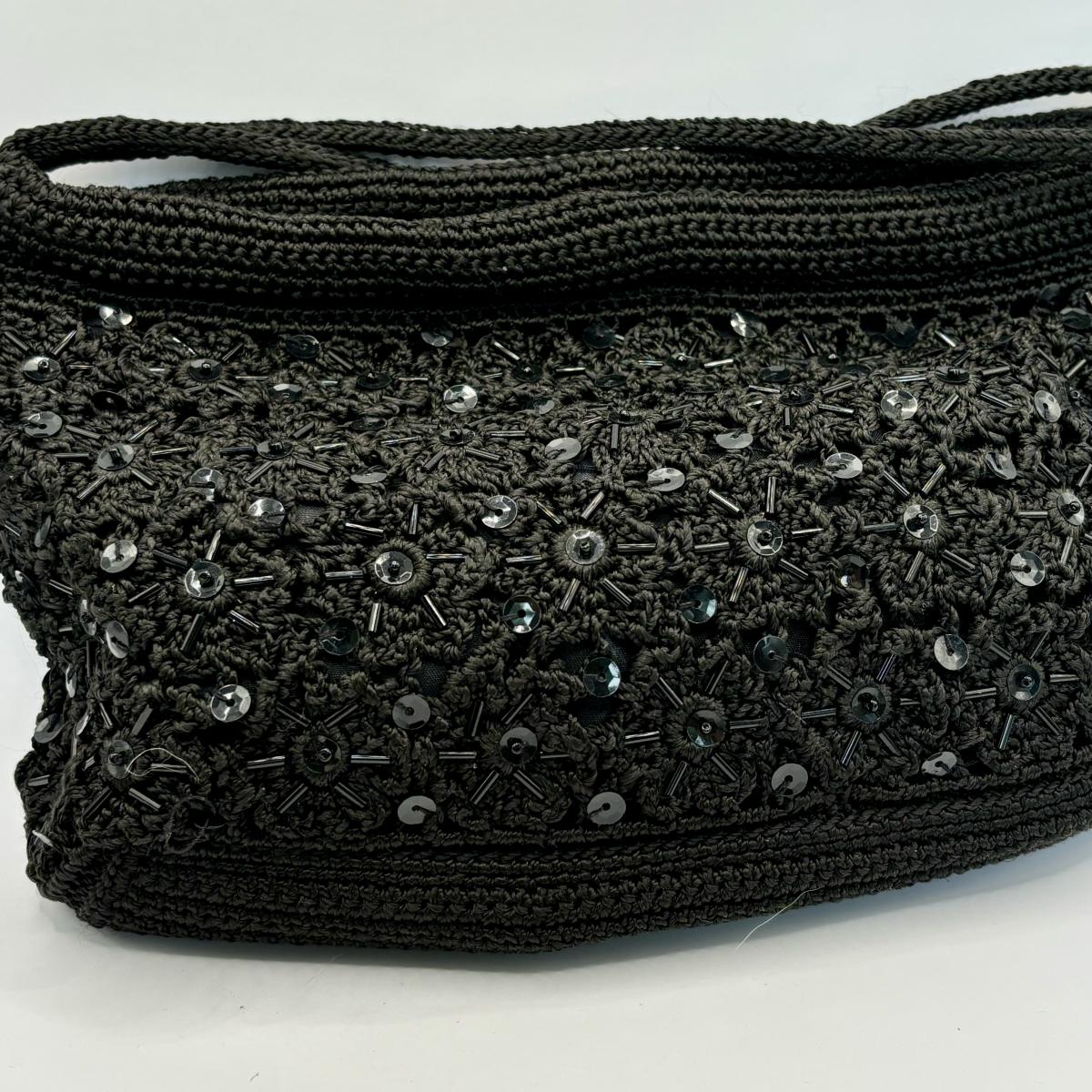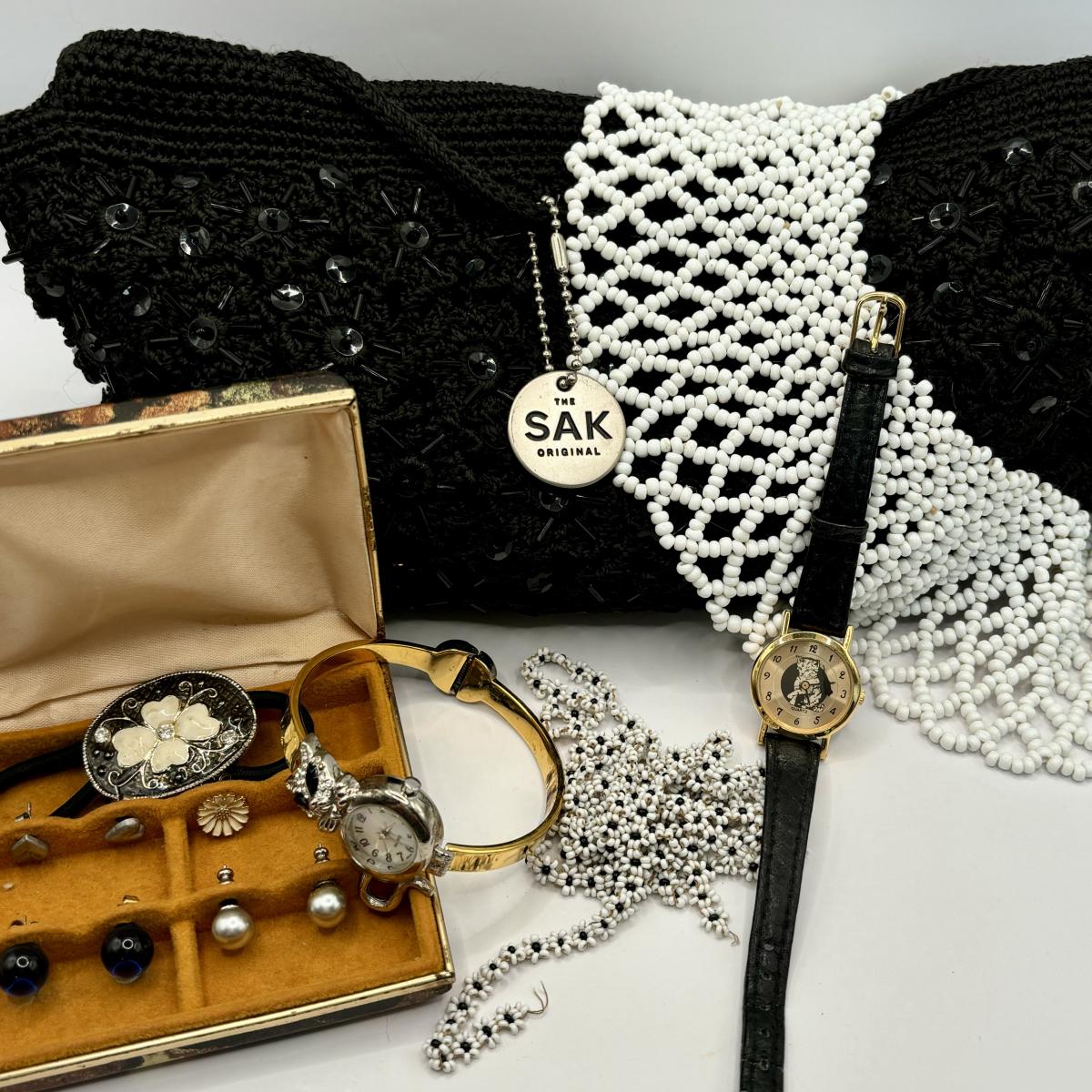 LOT 28: Black "The Sack" Purse, Vintage Beaded Collar, 40" Delicate Floral String of Beads w/no Clasp, 'Cat Watches & Case w/Earrings