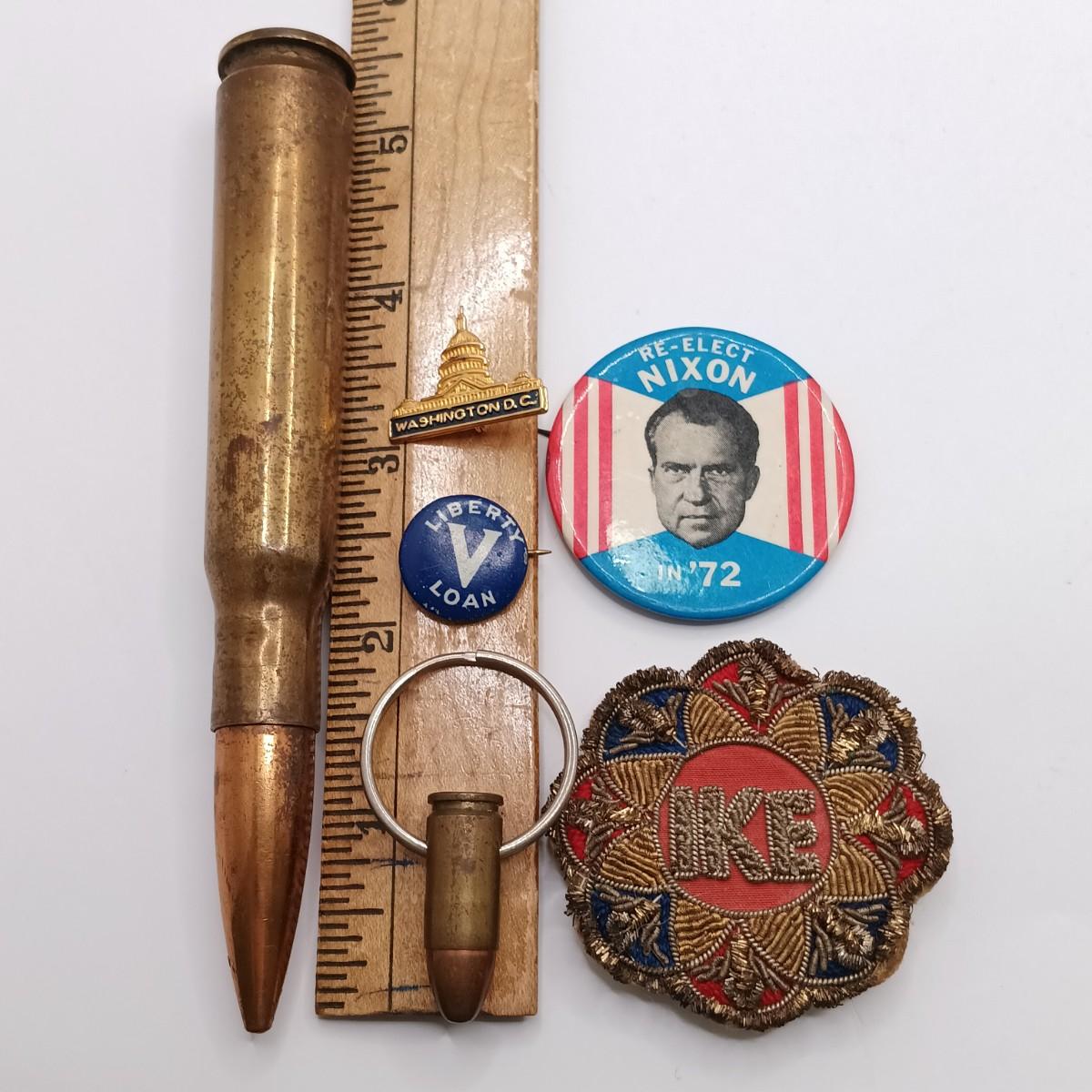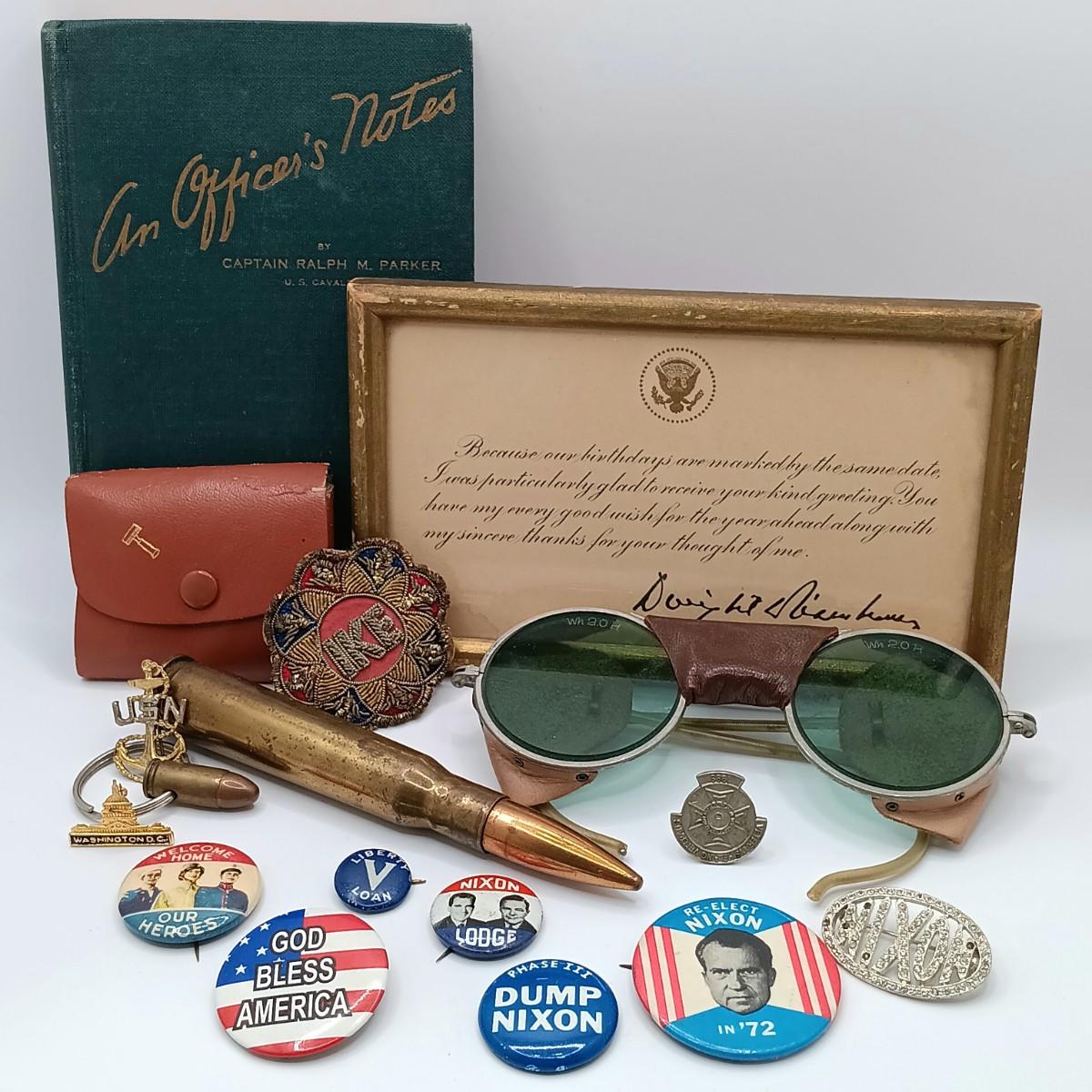 LOT 158: Framed Dwight D. Eisenhower Signature w/ Vintage Willson Glasses, Political Pins & More