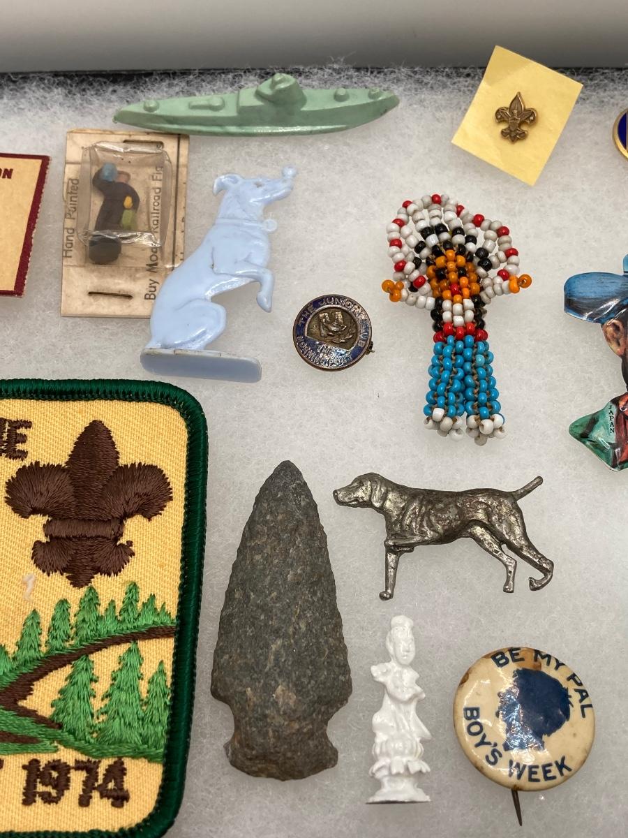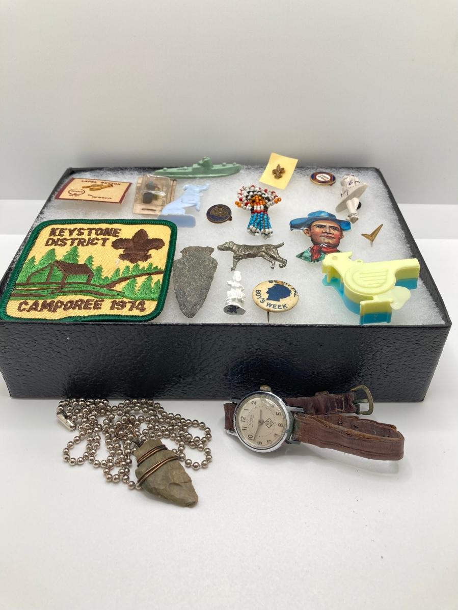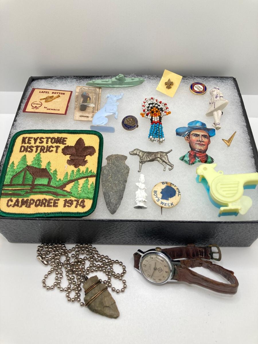 LOT 166: Vintage / Antique Collection - Cub Scout Timex Watch, Patch, Arrow Heads, Pins, Miniatures and More