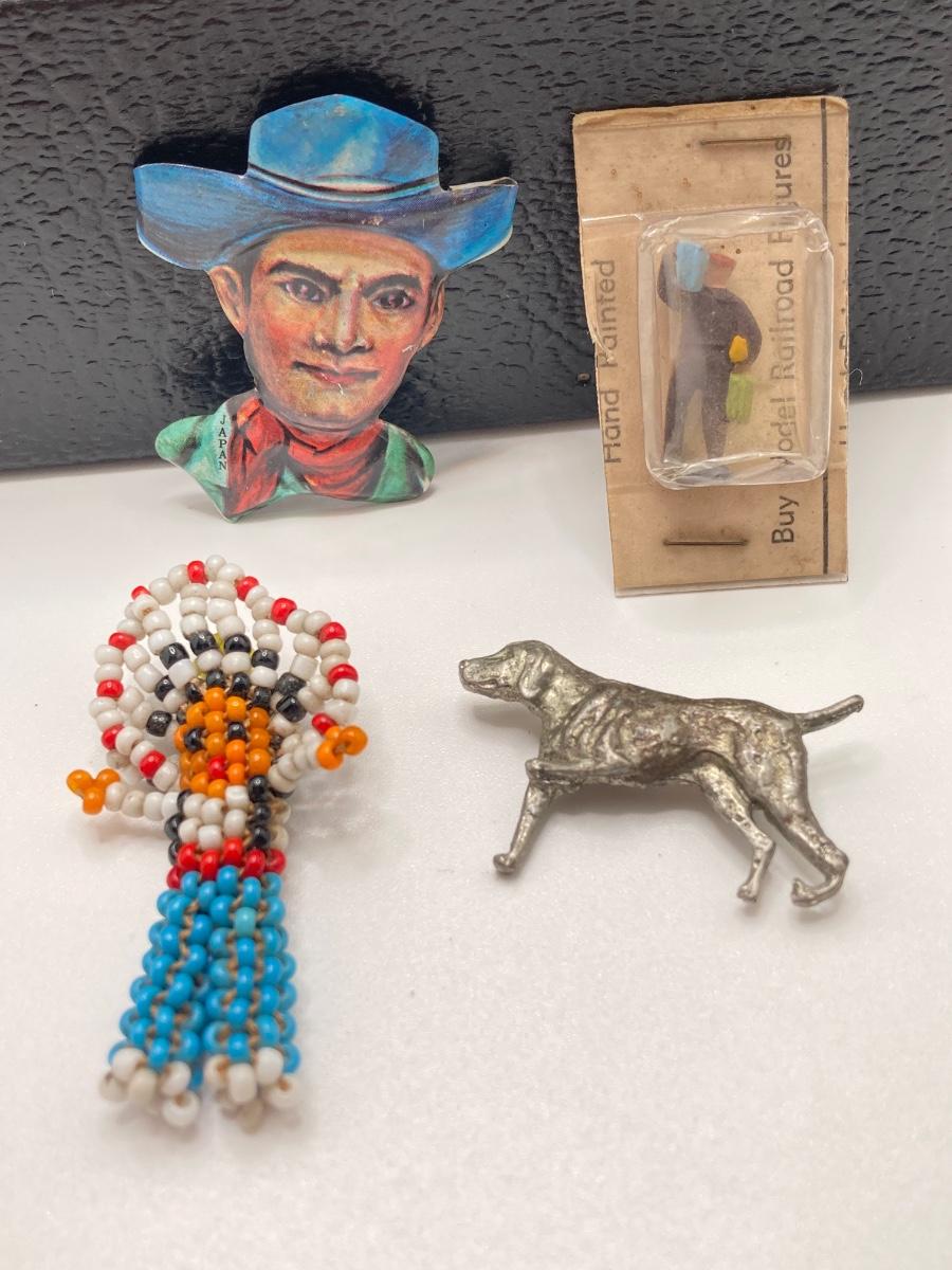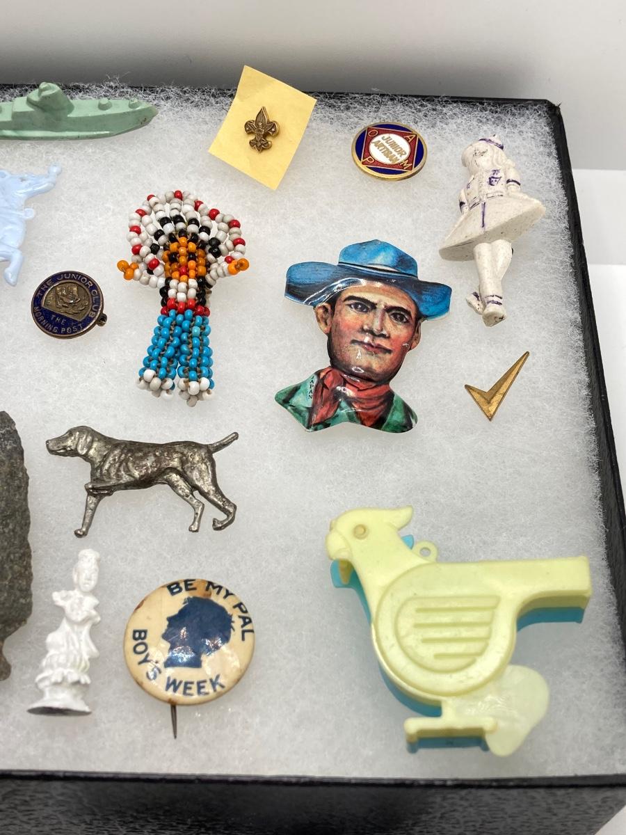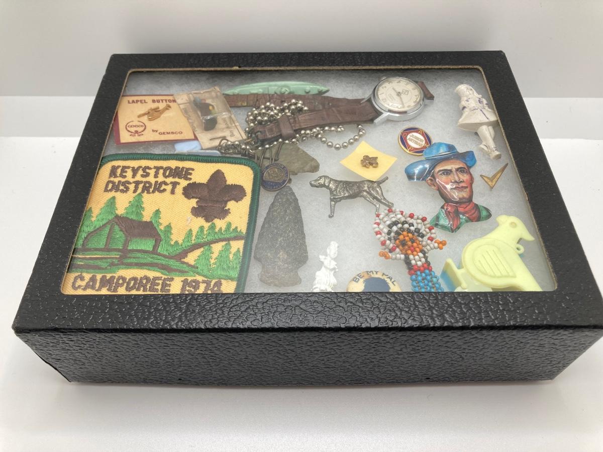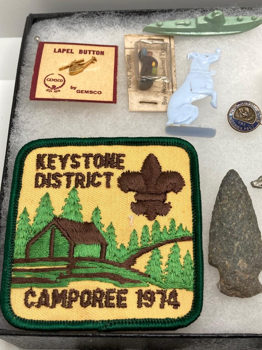LOT 166: Vintage / Antique Collection - Cub Scout Timex Watch, Patch, Arrow Heads, Pins, Miniatures and More