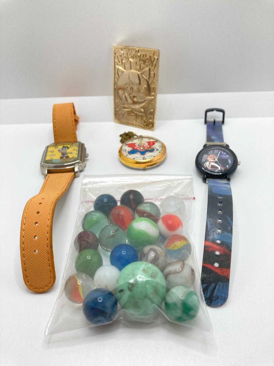LOT 191: Vintage Kids Collection- Astro Boy Watch, Bozo the Clown Pocketwatch, 90s Burger King Jiggly Puff Card & More